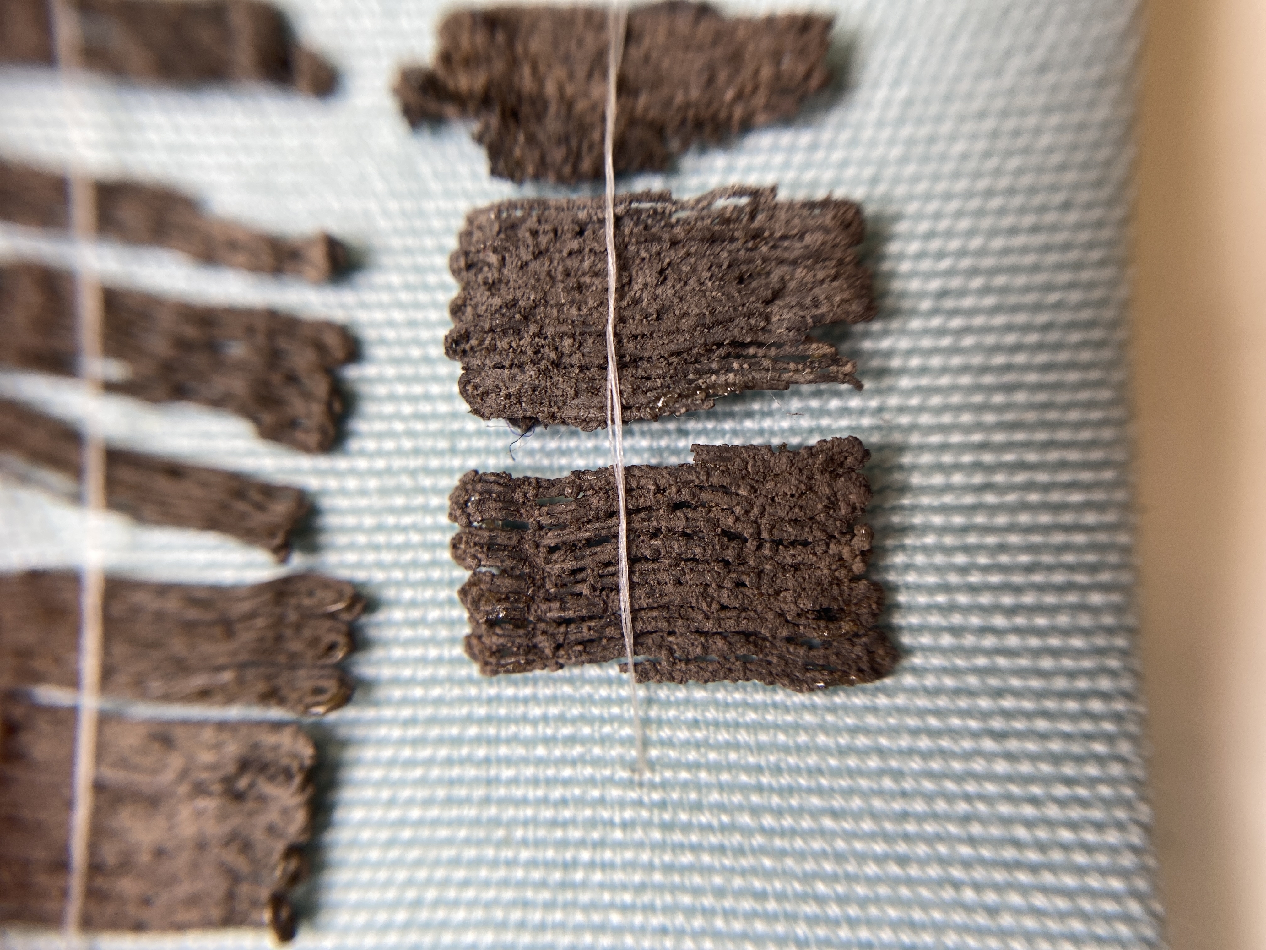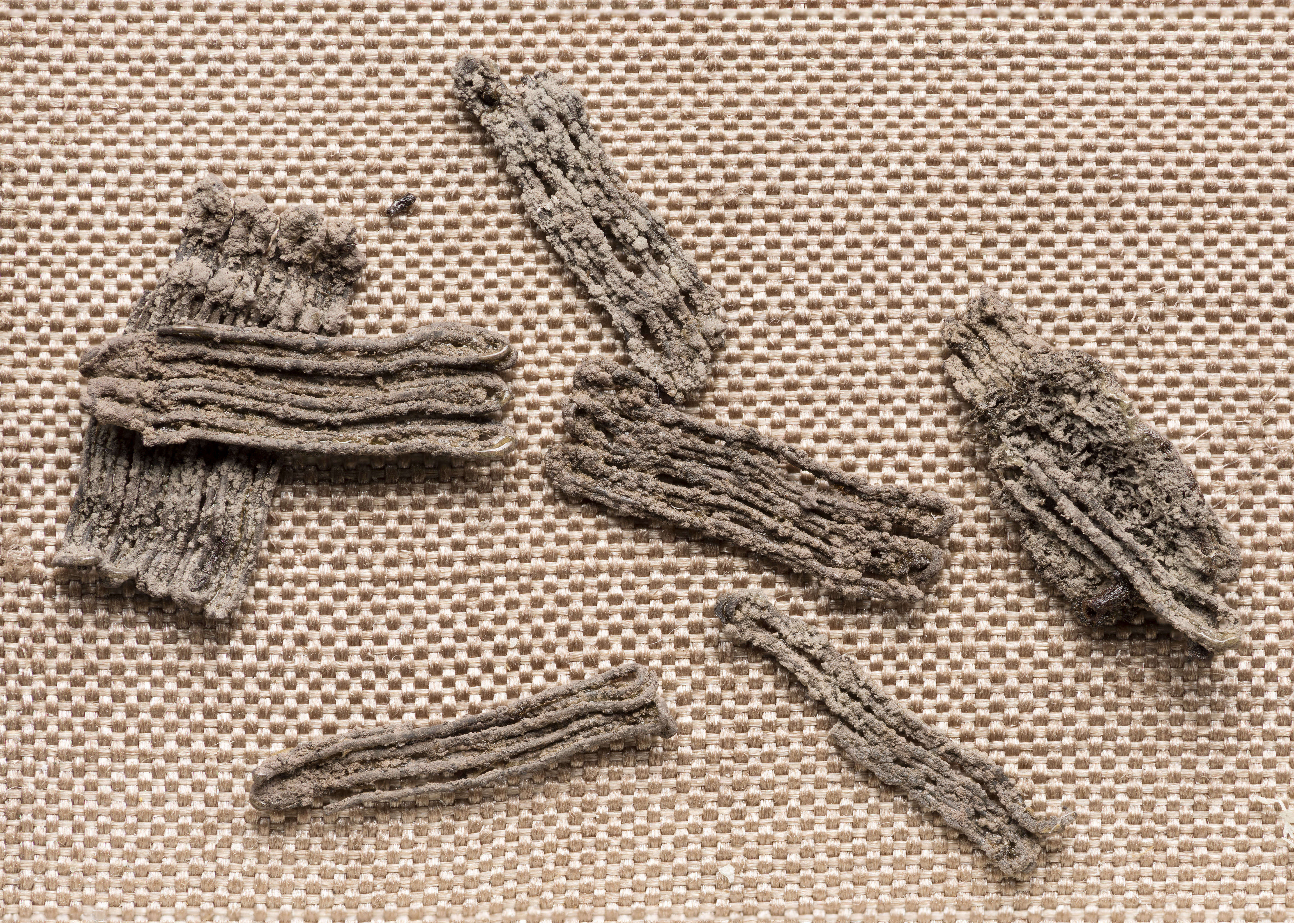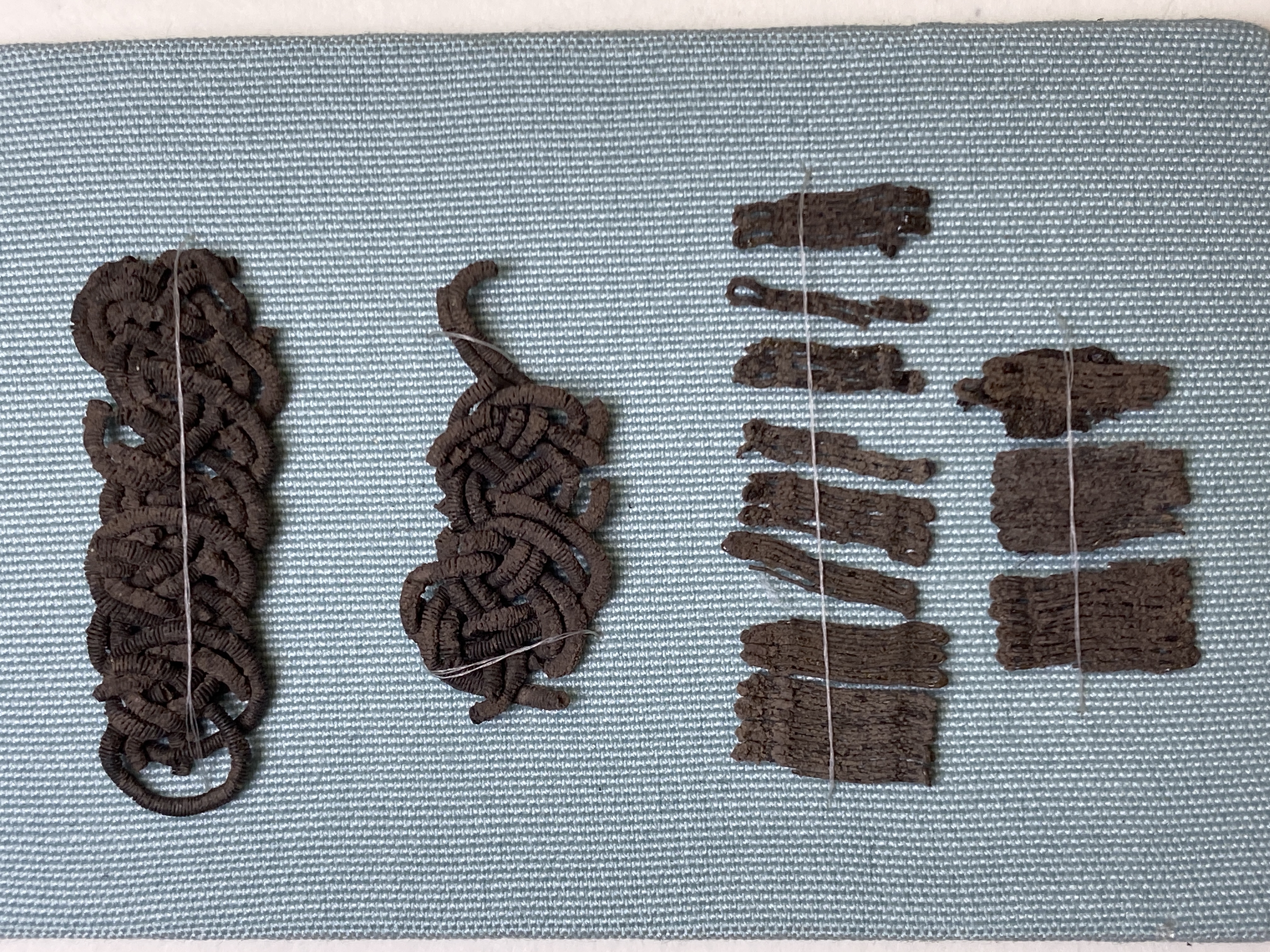 Passamentrester av silverspiral. Samt silverinslag till ett brickvävt band.