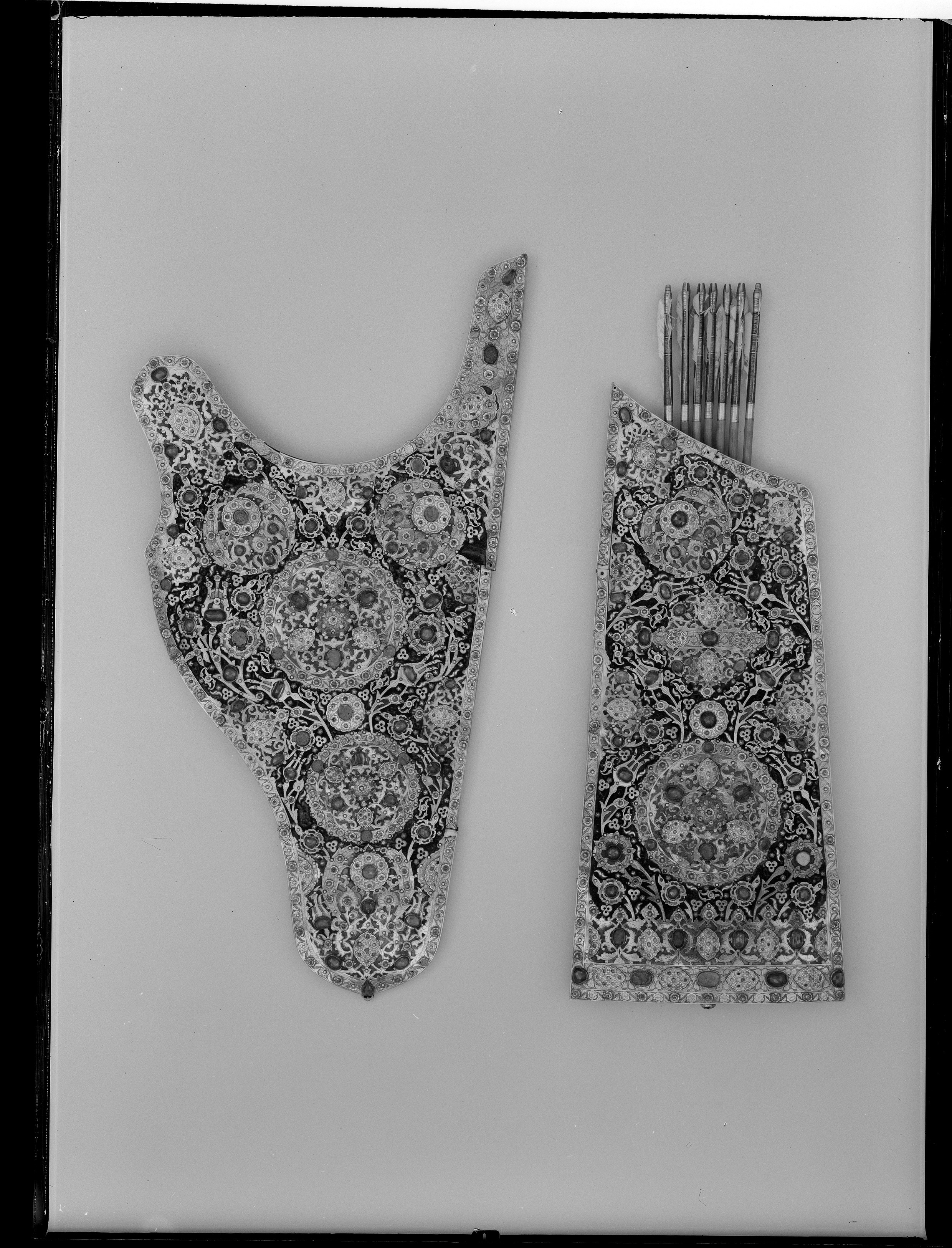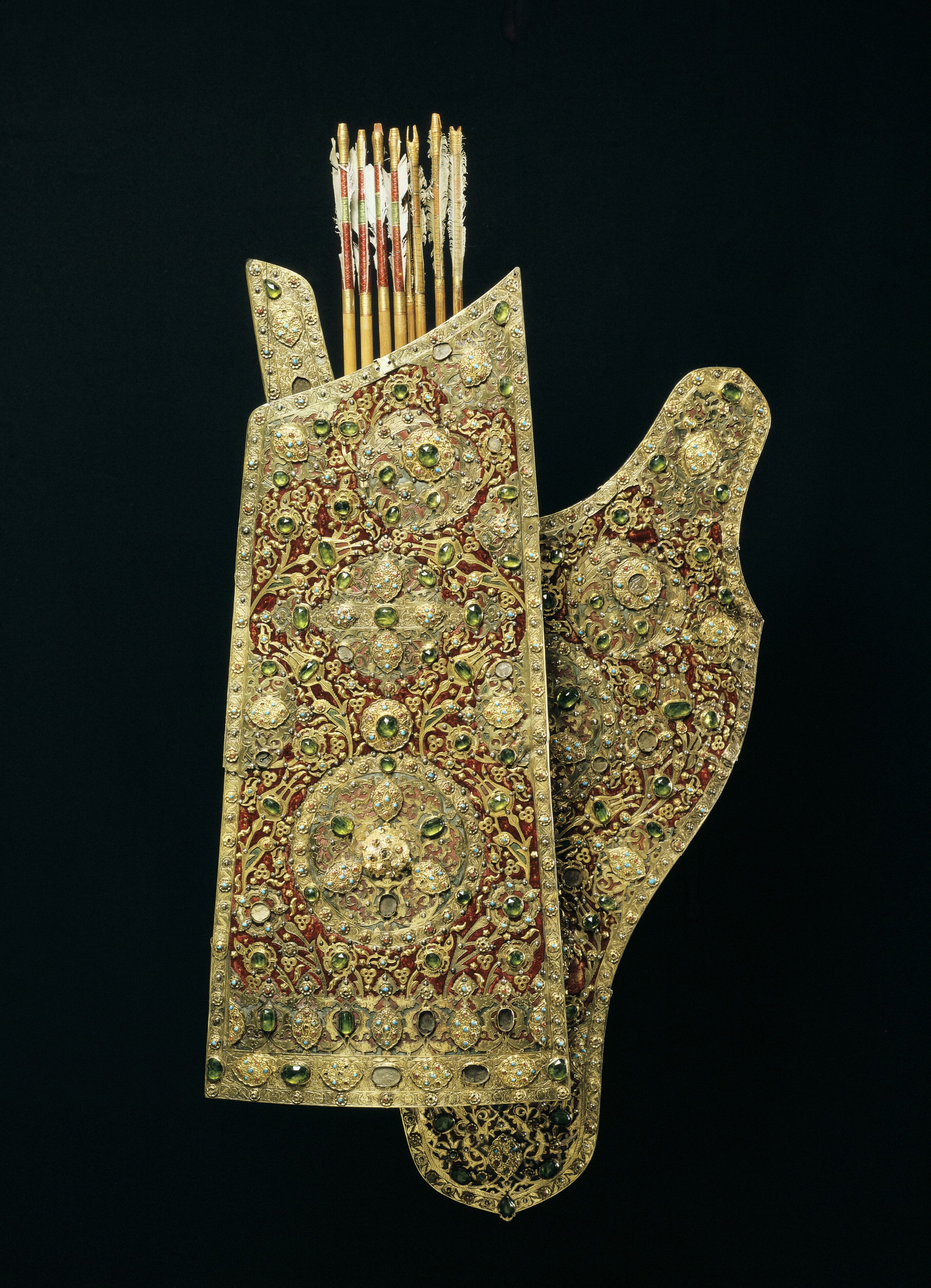 Asymmetriskt koger av brunt läder, överklätt med röd sammet. På framsidan yttäckande beslag av förgyllt silver i form av rankor, blommor, fyra runda, genombrutna plattor och kantbeslag, allt med graverad dekor och besatt med stora, slipade, gröna stenar (peridoter), däremellan och utmed kanterna turkoser och rubiner, alla i blomformiga fattningar av guld samt små, släta silverpärlor. Mellan och på de stora, genombrutna plattorna spetsovala, konturerade förhöjningar av guld. På plattan på mitten halvsfäriska buckor av guld. På insidan upptill i ena hörnet ett förgyllt, delvis genombrutet och graverat beslag. Nertill ett läderhandtag. Avsedda som gåva till Gustav II Adolf från Krim-khanen Djanibeck Giray (Djanibeg Gerej), men överlämnade av sändebudet Norali Oman Mirza (Nur Ali Olan Mirza - Olan hög tartarisk militär titel, Murza-Mirza adlig titel) först 1633. (Stavning av namn och läsning se E. Swiecicka). Förvarat i Räntekammaren 1633-1752, överlämnat till LRK enl. K. brev 1752-03-30, 1823-1851 förvarade i Kungl. Klädkammaren.