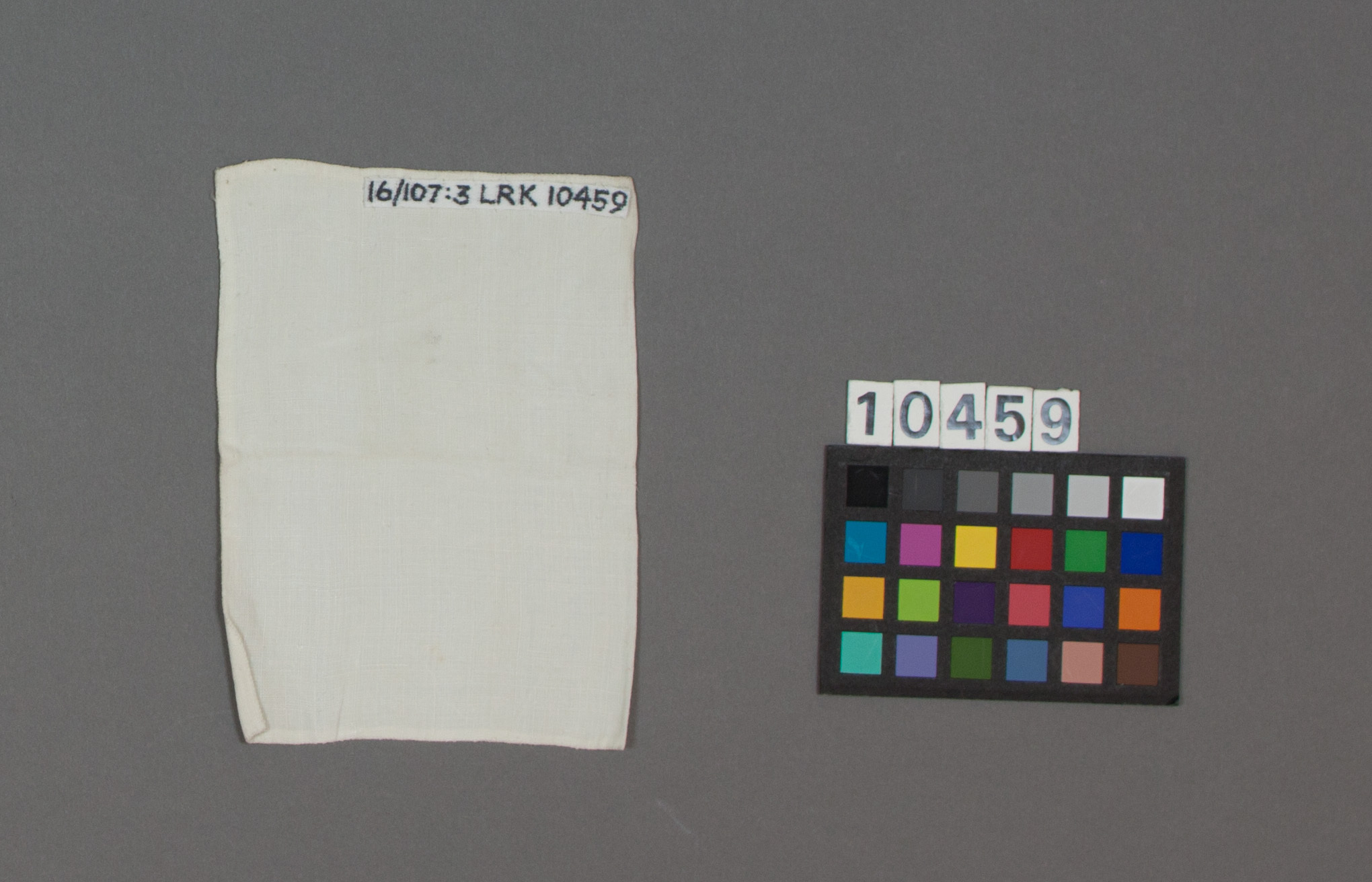 Plagg ingående i en korg med babykläder som använts av Sofia och Oskar (II):s barn. Rektangulär navellapp av dubbelt linnetyg med handsydda sömmar. L: 130 mm, b: 95 mm