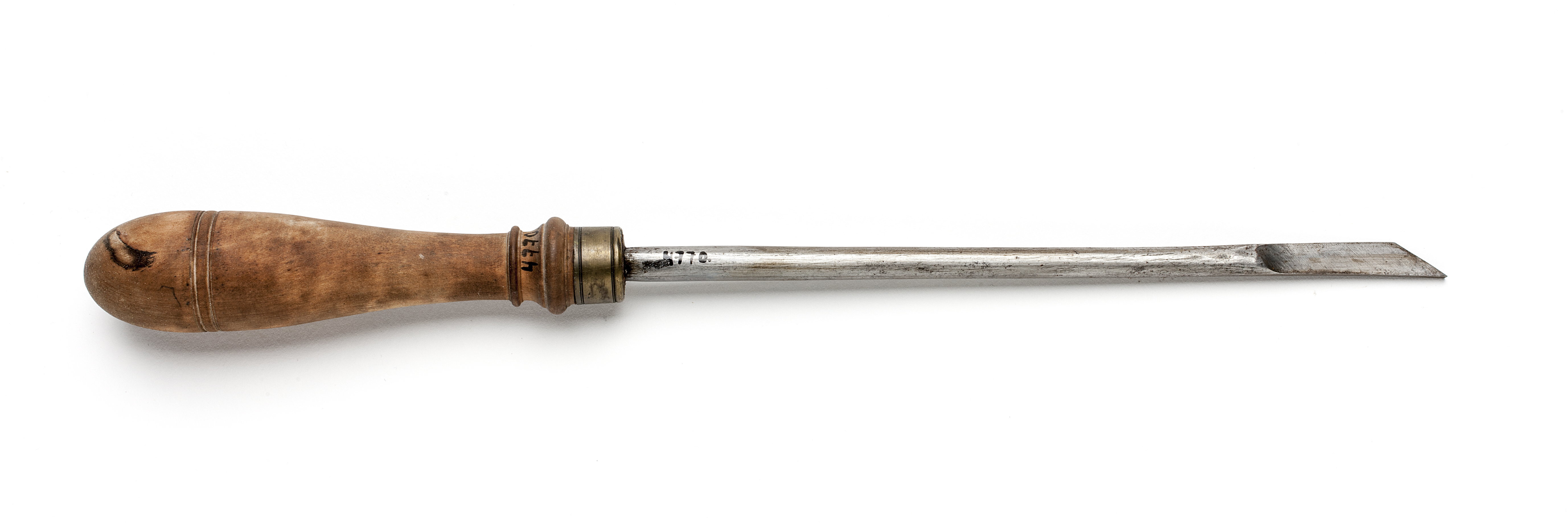 Rund klinga, i änden med rektangulär genomskärning. Svarvat skaft av päronträ med två vulster nedtill ("skoklostertyp"). Mässingsring.