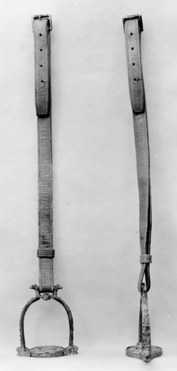 Stigbygel av förgylld mässing med u-formad bygel, skänklarna vidgas nedtill, på utsidorna ciselerad dekor i form av palmetter och blad mot punsad botten, nedtill avslutade med griphuvuden. Remläge i form av fast rektangulär ögla vars sidor består av två örnhuvuden vända utåt, nederkanten med ett palmettliknande ornament. Runt trampstöd, genombrutet med en 12-uddig stjärna i mitten, omgiven av en flikig bård. Trampstödets ytterkant räfflad. Tillbehör: Stigläder av rött läder ca 1450 mm långt med sölja av förgylld mässing.