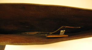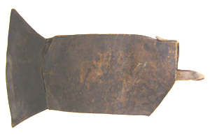Benläder av svart läder, formsytt efter vaden med en baksöm. I nederkanten sitter en hälla av svart läder. Benlädret har en vid krage. På insidan är fodrat med brunt läder. Vid kragen sitter två bruna läderhällor.