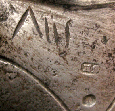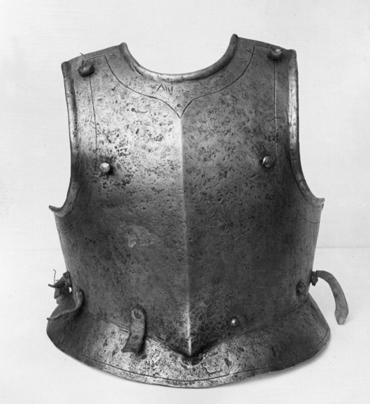 Stål drivet i ett stycke. Framåtsluttande axlar, B 80 mm. Rakt bröstparti. Rundade, tämligen djupa urtag för hals och armar. Kanterna omvikta inåt och rundsmidda. Under halskanten inslaget upp och nedvänt V samt tre streck. Även stämplad HS inom rektangulär ram. Tydlig mittås 50 mm under halskant, nertill avslutad i spets utskjutande ca 18 mm. Snett utåtriktat skört med något välvda sidor, B 56 mm. Skuren kantlinje, under halsen nedåtsvängd i en spets. Rester av axelremmar. På var sida bröstet en utstående nit. I sidorna sämskade läderremmar. I bröstets nederkant till höger två remmar, till vänster endast nitarna kvar.
