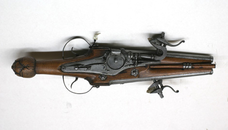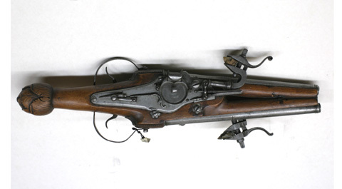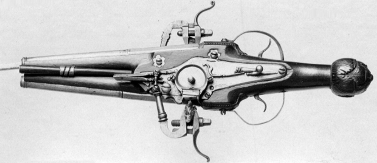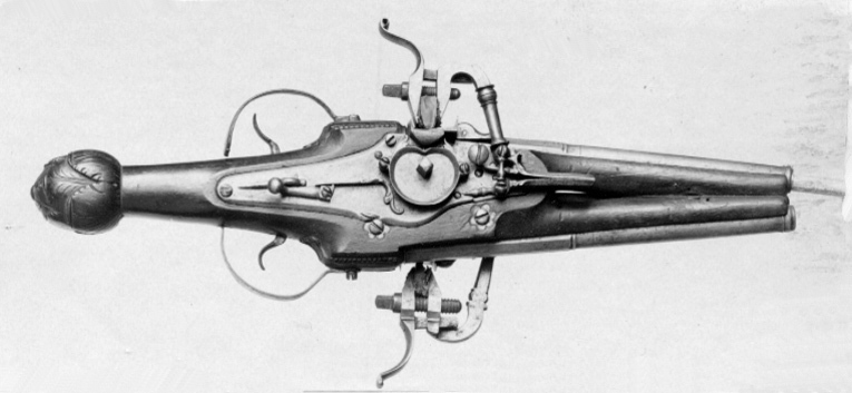 Hjullåsdubbelpistol med konvergerande pipor, Tyskland, 1800-tal(?), hjullås av typ från 1600-talets början. .