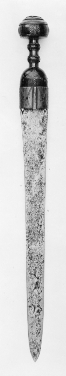 Fäste av rödbrunt trä, svarvat med stor kula upptill och smalare på mitten. Inlagt med små ringar av mässing och beslaget med mässing. Upptill tredubbelt beslag mellan utvidgningarna på den smalare mittdelen och ett brett ringbeslag nedtill med graverade räfflor på ena sidan, graverade kryss på andra sidan. Klinga av stål, 34 mm bred, rak, tvåeggad, med två hullingar invid fästet.