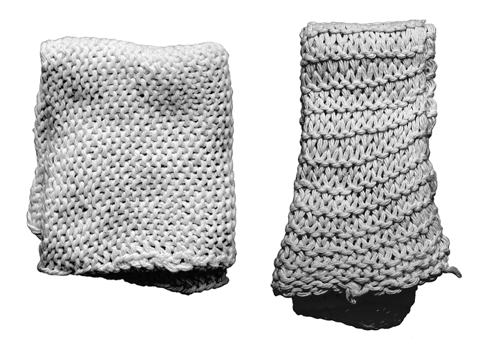 DISKDUKAR (diskunderlägg), tre stycken Av löst tvinnat, fyrtrådigt blekt ljusvekegarn. Rektangulära. Handstickade. Rät stickning fram och tillbaka med kantmaskor, den största hopstickad av två stycken, en duk lösare stickad. Längd: omkring 50 cm.--1 m.; bredd: omkring 30-50 cm. Inköpt av Wilhelmina von Hallwyl på basar November 1926 hållen av K.F.U.M. i Stockholm