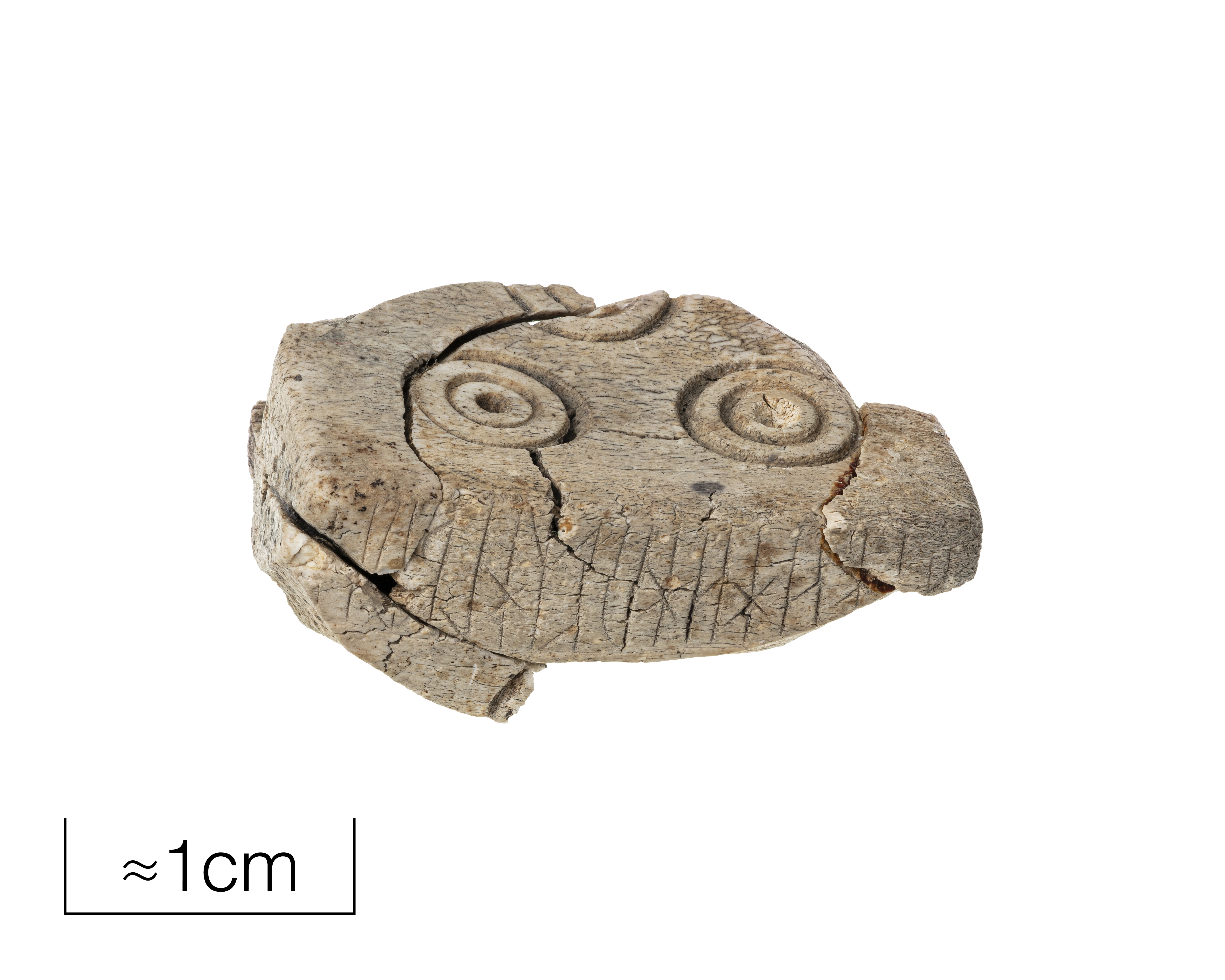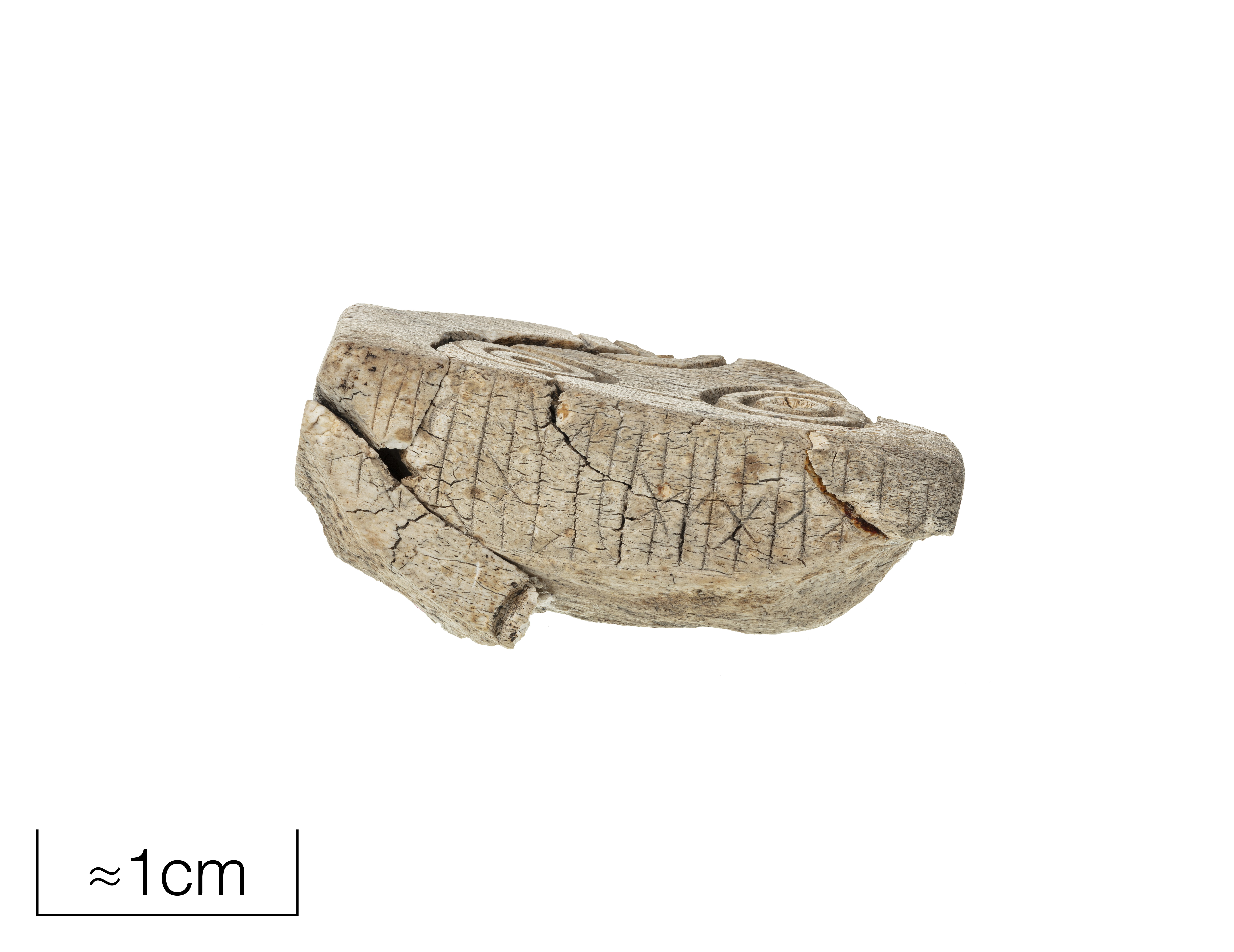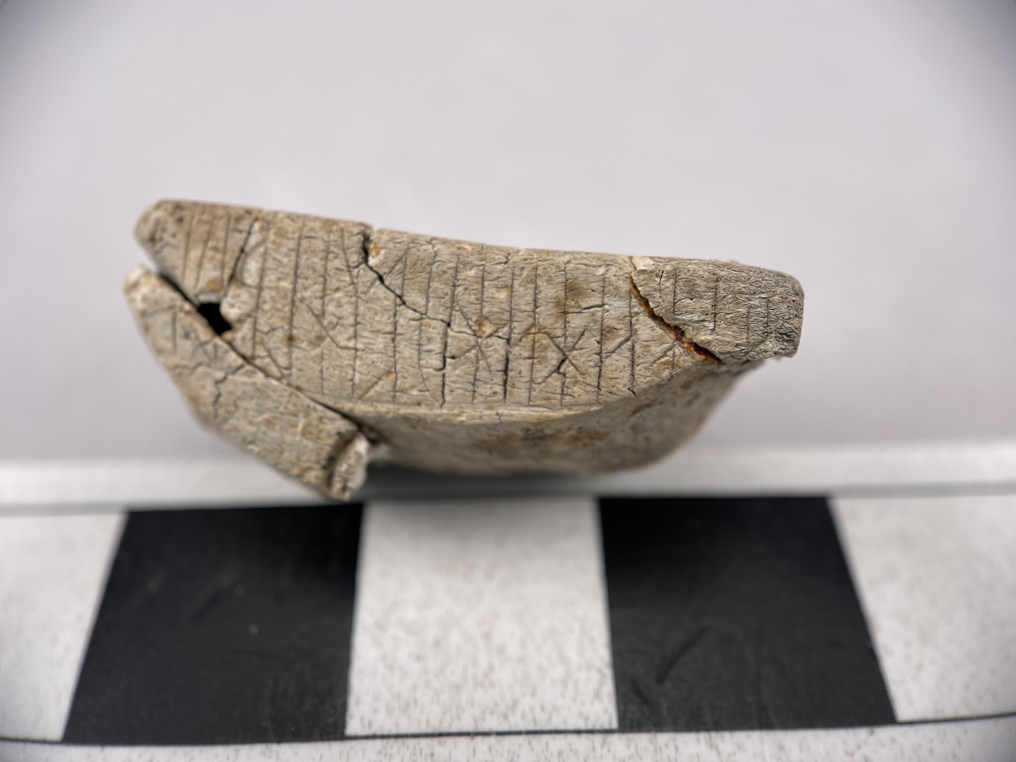 Tärning av ben med runinskrift, äldre runor, svårtydd men innehåller bl.a. ordet hAukR, ”hök”.