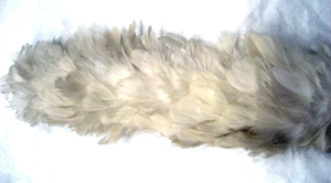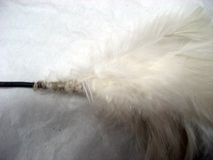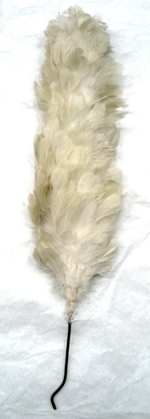 Bågformad ståndarplym av vita, klippta tuppfjädrar. Fjädrarna är sammanfästade på ett rakt skaft av stål. Vid skarven mellan fjädrar och skaft är virat med vit tråd.