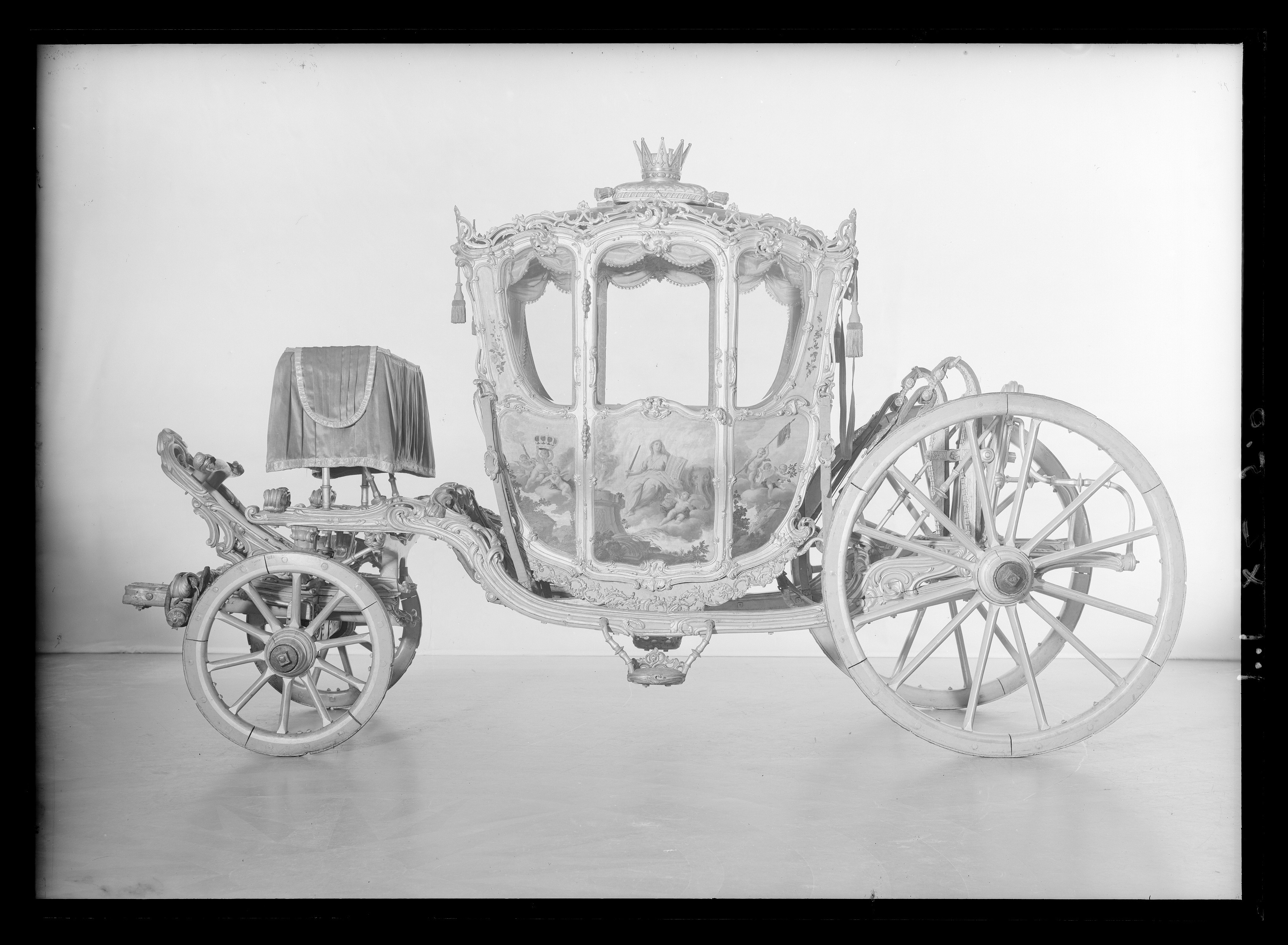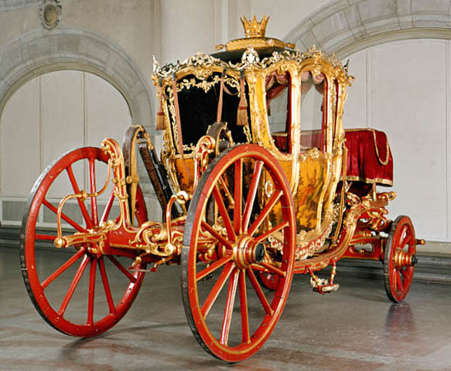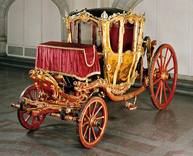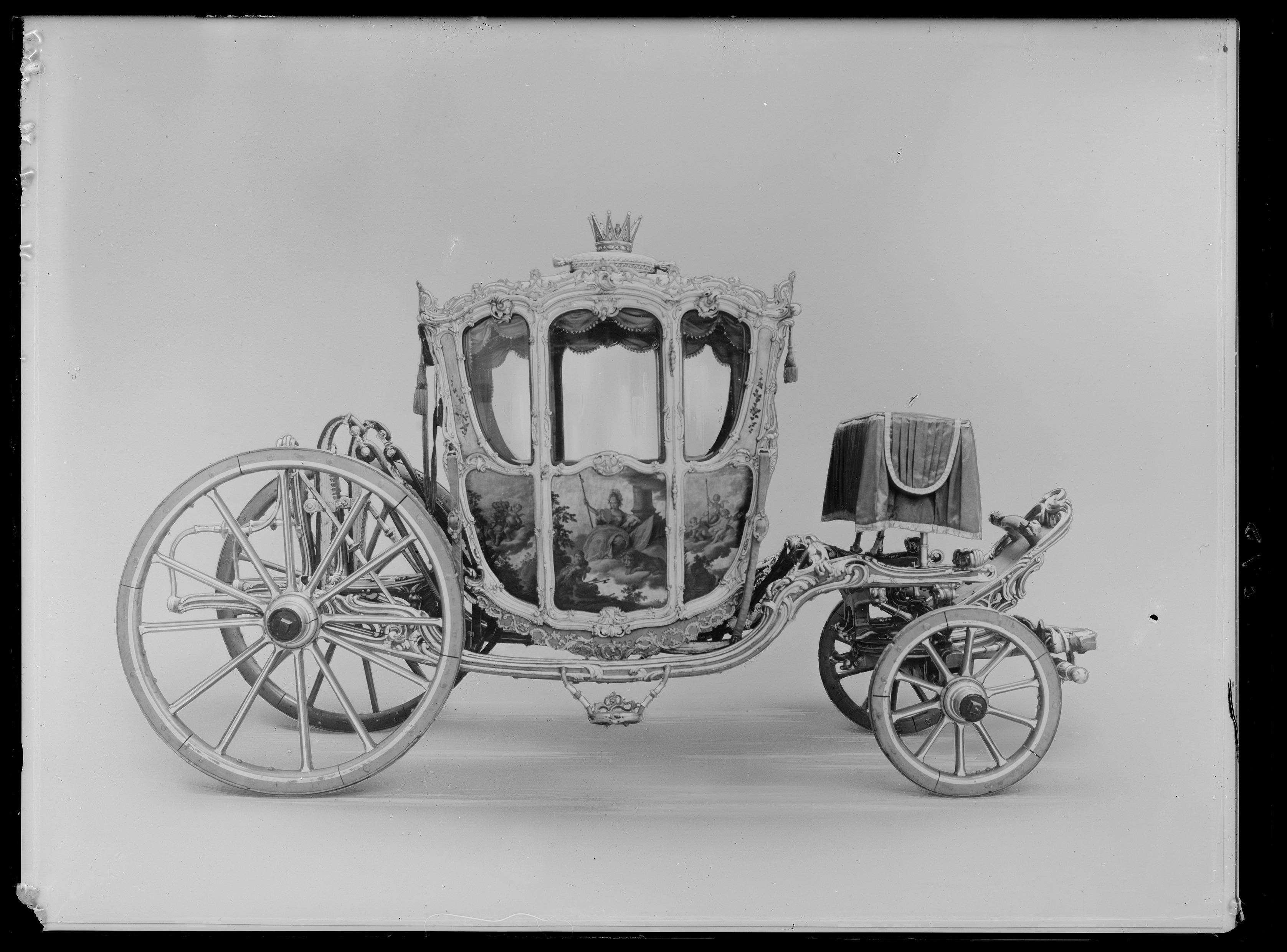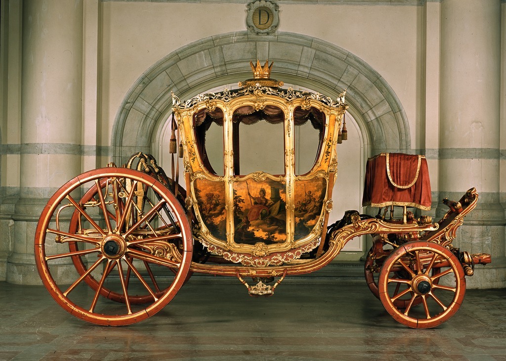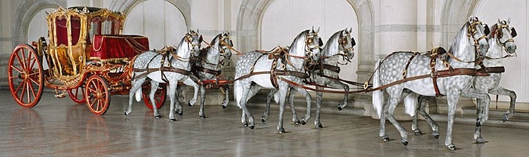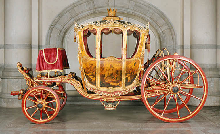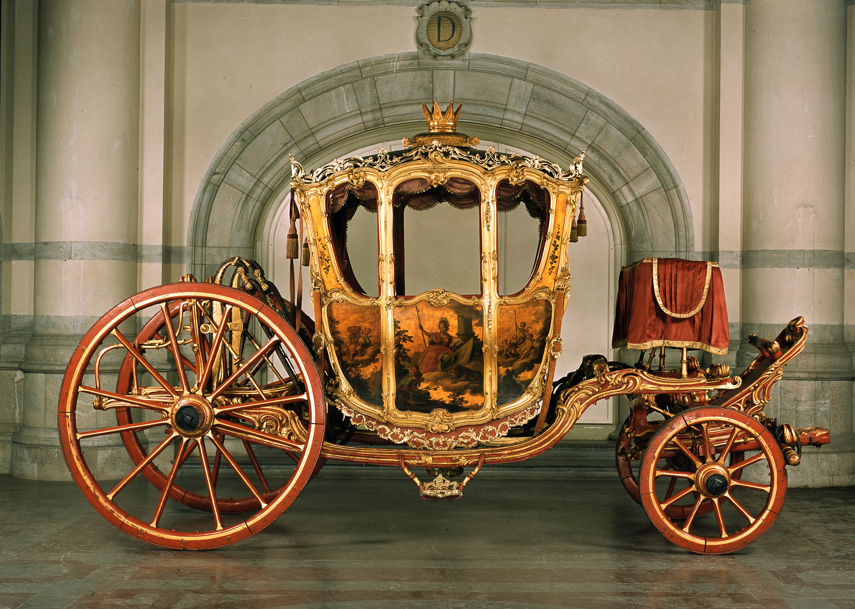 Hornska vagnen, 7-glas statsvagn, berlinare, förgylld, skulpterad och rnålad i rokoko.