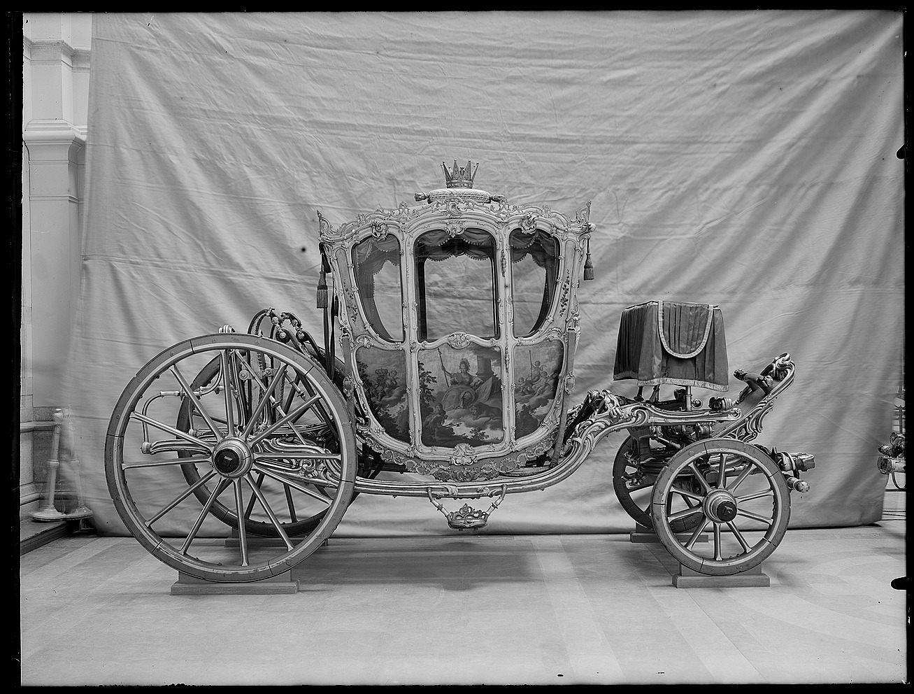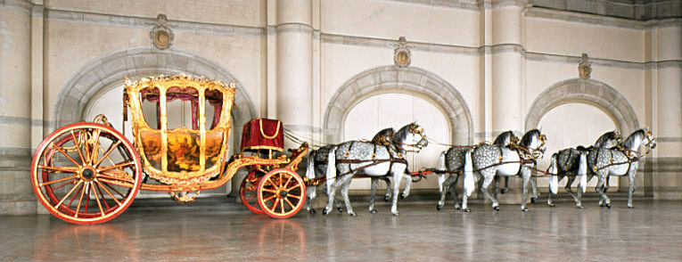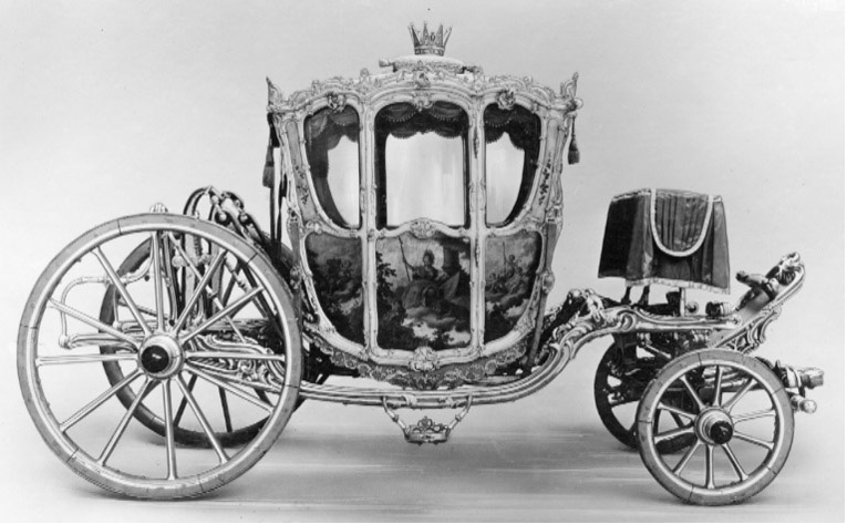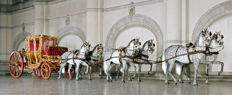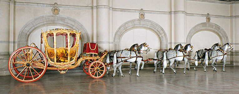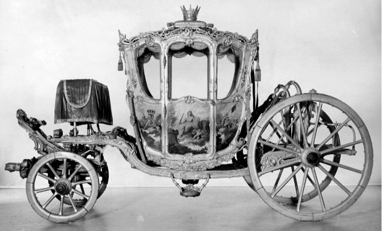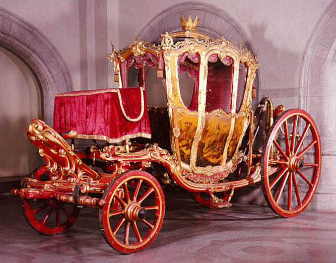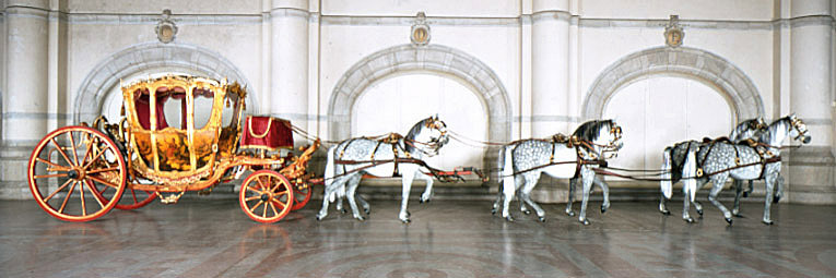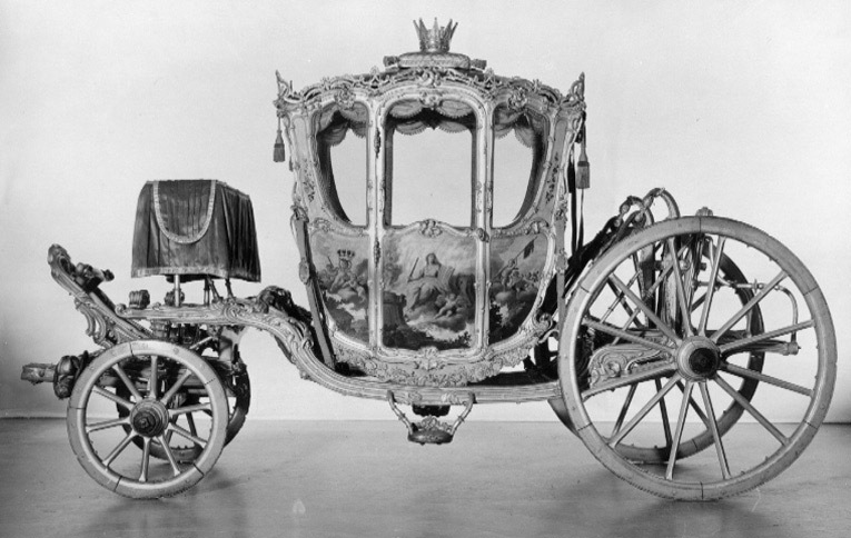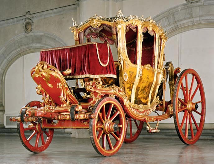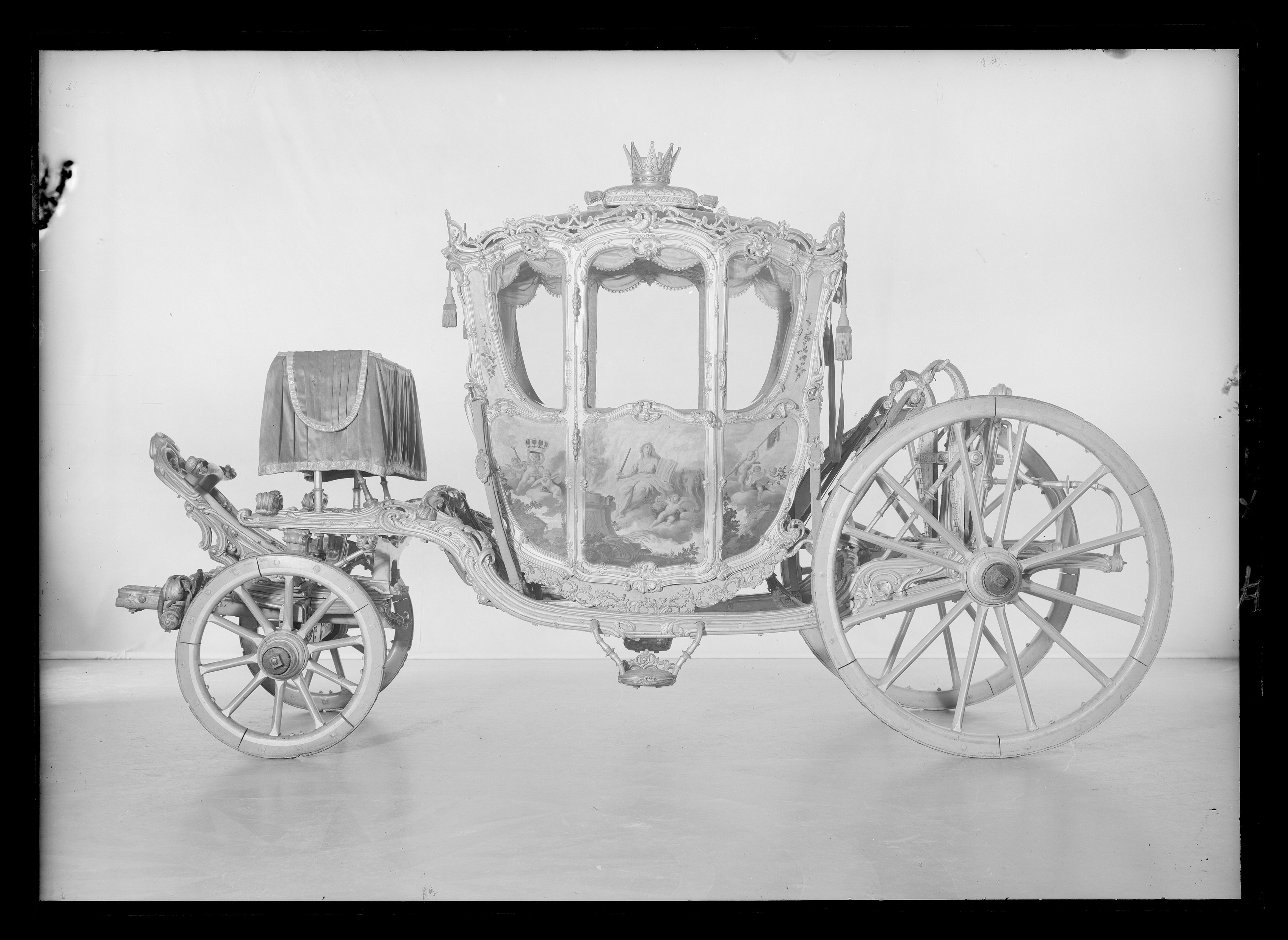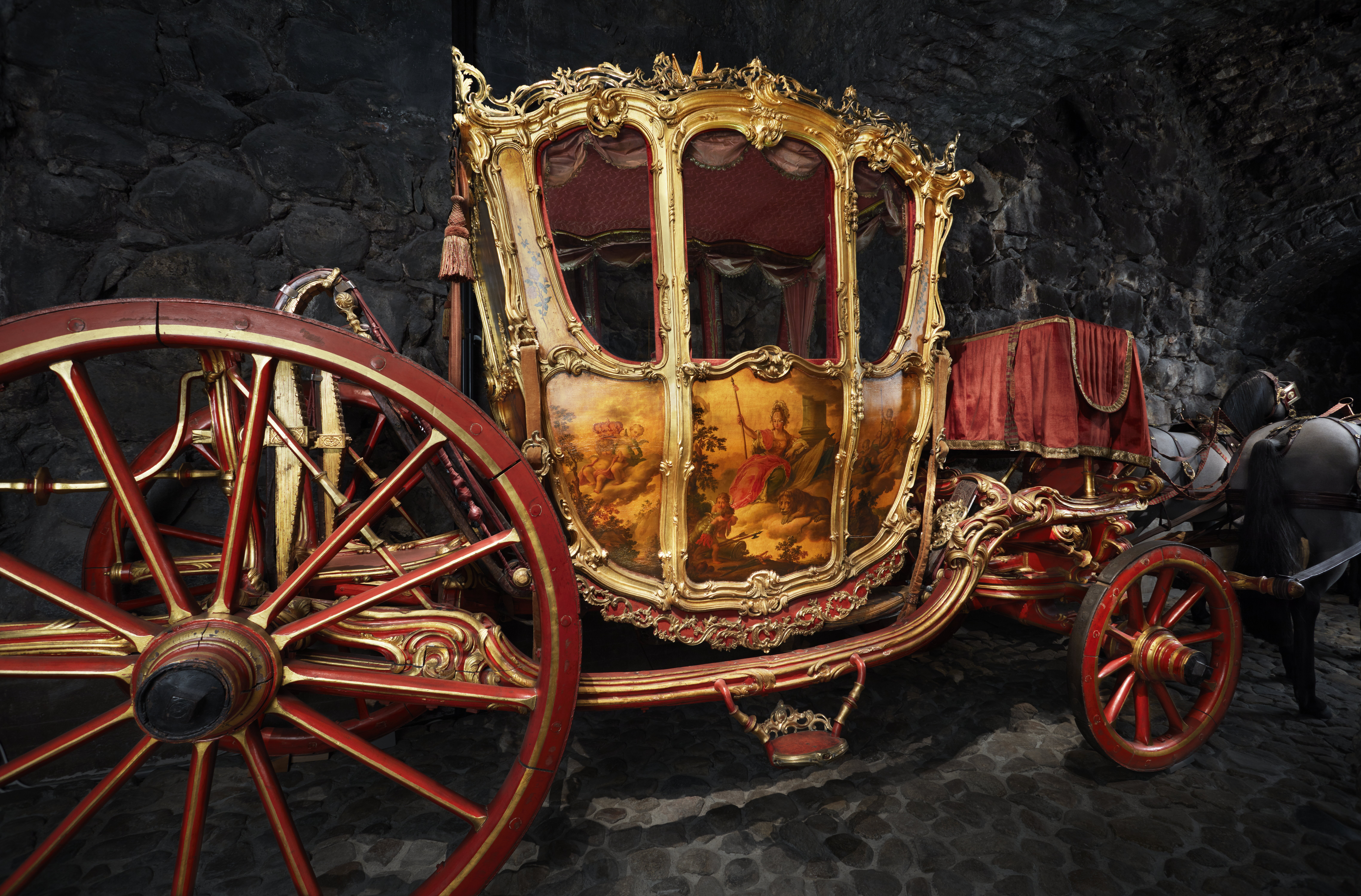 Hornska vagnen, 7-glas statsvagn, berlinare, förgylld, skulpterad och rnålad i rokoko.
