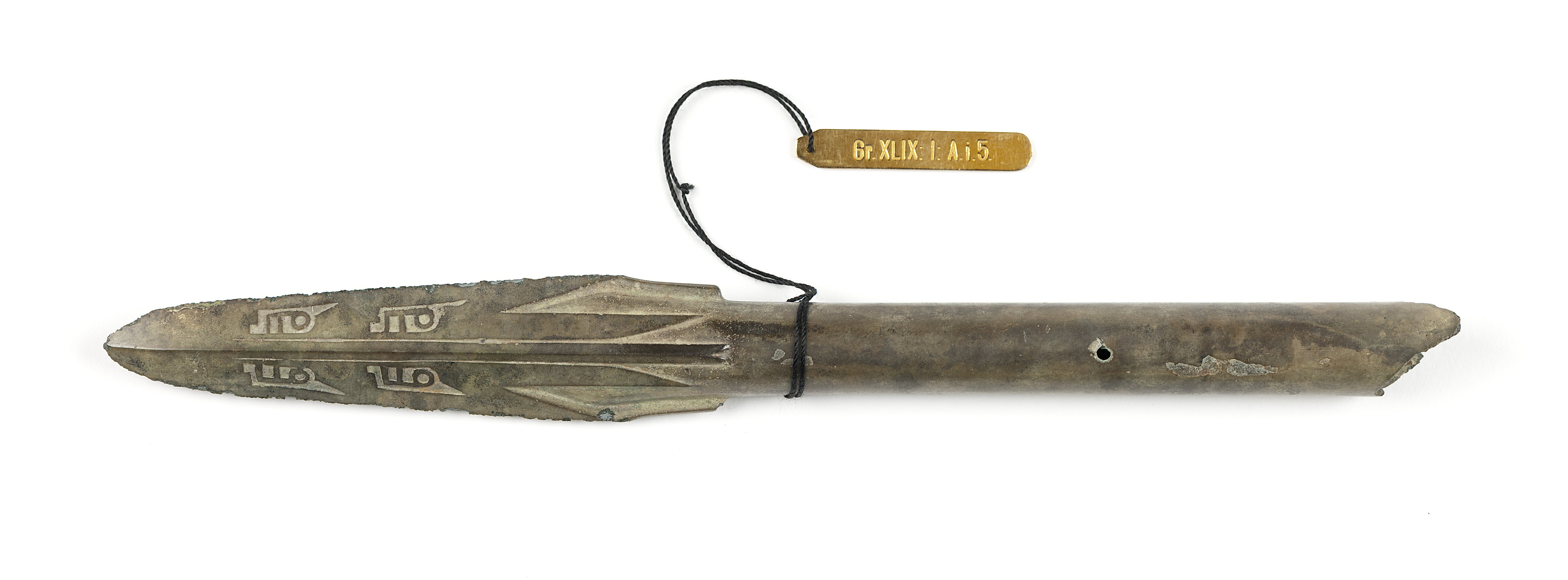 Spjutspets. Blad: Något ihåligt, lansettformigt, rombiskt tvärsnitt och spetsig udd. Eggarna nästan raka till spetsen. Där bladet övergår i stånghylsan, fem flikar. Bladet prydes av två par insänkta ornament som liknar klockor. Stånghylsa (avbruten) lång, cylindrisk. På två motsatta sidor ett rund hål, det ena något längre ner än det andra. Längd: 23,6 cm.; bredd: 2,6 cm