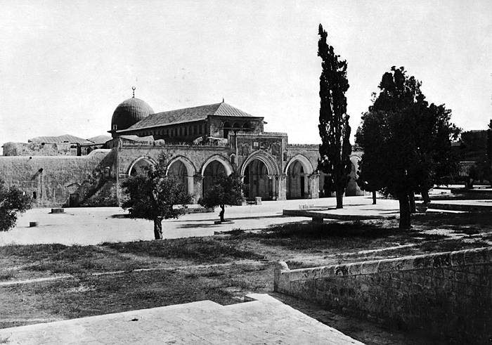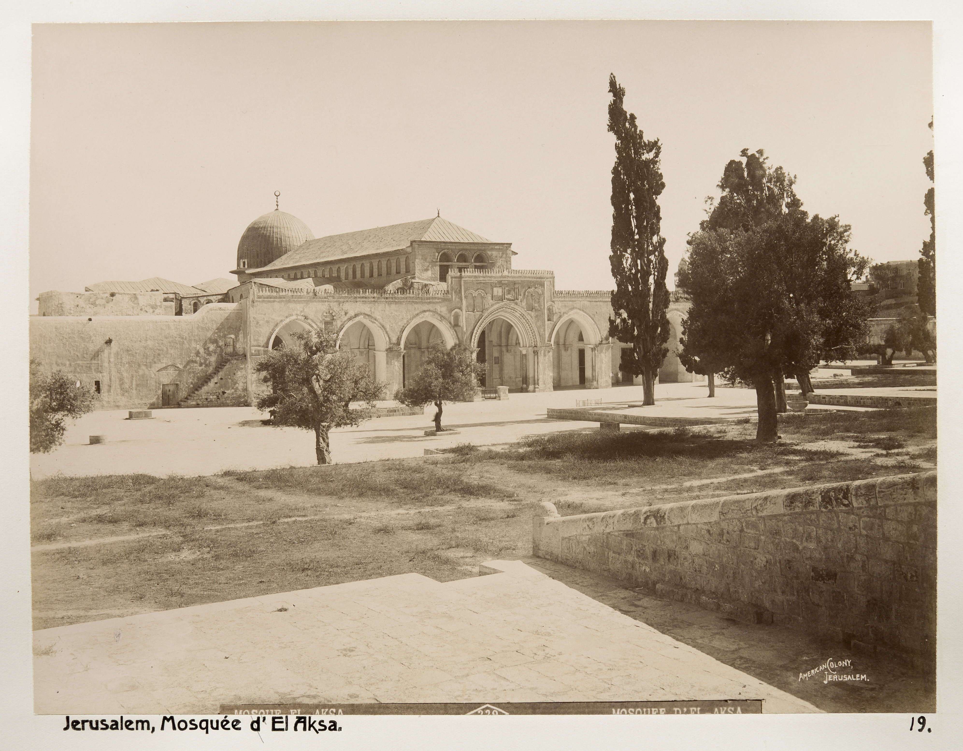 al-Aqsamoskén i Jerusalem. Text på originalet: "Mosque el-Aksa/Mosquée d'el-Aksa". Fotografierna LXVI:N.01.-180. kommer från resan till Palestina och Syrien som Wilhelmina och Walther von Hallwyl gjorde den 30 mars-27 april 1901. De lämnade Sverige den 5 november 1900 för Egypten, där de stannade till den 28 mars 1901, då de fortsatte till Palestina. Med på resan var Wilhelminas sällskapsdam, fröken Ida Uhse. Den 27 april fortsatte de till Turkiet och Mindre Asien. De mindre fotografierna (utom de från Samos) LXVI:N.90.-100. är tagna av Wilhelmina själv, under en resa till häst från Jerusalem till Damaskus 8-20 april 1901. Övriga fotografier är inköpta av Wilhelmina i Jerusalem, Damaskus och Beirut. Alla uppgifter kommer från Ida Uhses reseanteckningar.