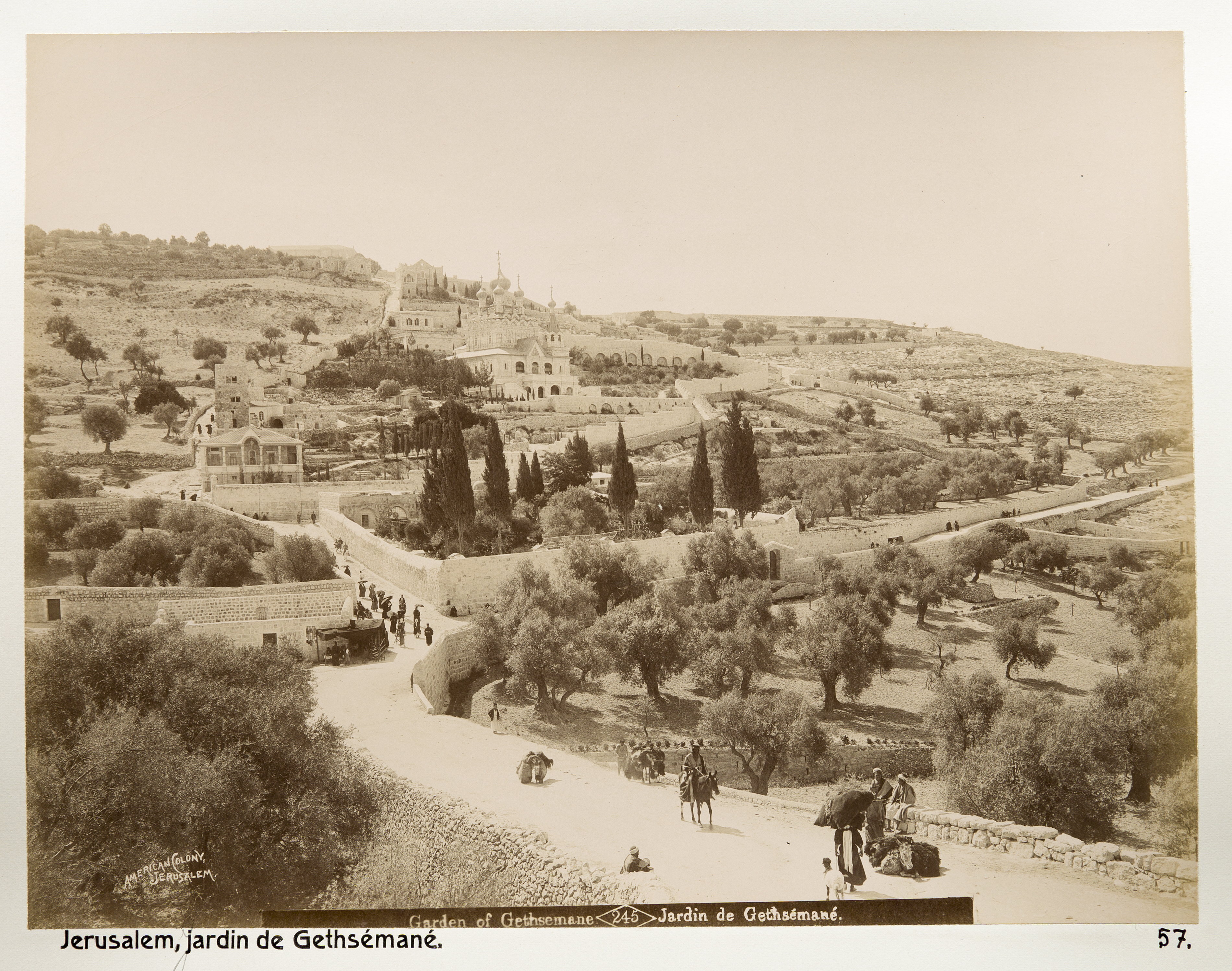 Getsemane, Jerusalem. Text på originalet: "Garden of Gethsemane/Jardin de Gethsémané". Fotografierna LXVI:N.01.-180. kommer från resan till Palestina och Syrien som Wilhelmina och Walther von Hallwyl gjorde den 30 mars-27 april 1901. De lämnade Sverige den 5 november 1900 för Egypten, där de stannade till den 28 mars 1901, då de fortsatte till Palestina. Med på resan var Wilhelminas sällskapsdam, fröken Ida Uhse. Den 27 april fortsatte de till Turkiet och Mindre Asien. De mindre fotografierna (utom de från Samos) LXVI:N.90.-100. är tagna av Wilhelmina själv, under en resa till häst från Jerusalem till Damaskus 8-20 april 1901. Övriga fotografier är inköpta av Wilhelmina i Jerusalem, Damaskus och Beirut. Alla uppgifter kommer från Ida Uhses reseanteckningar.