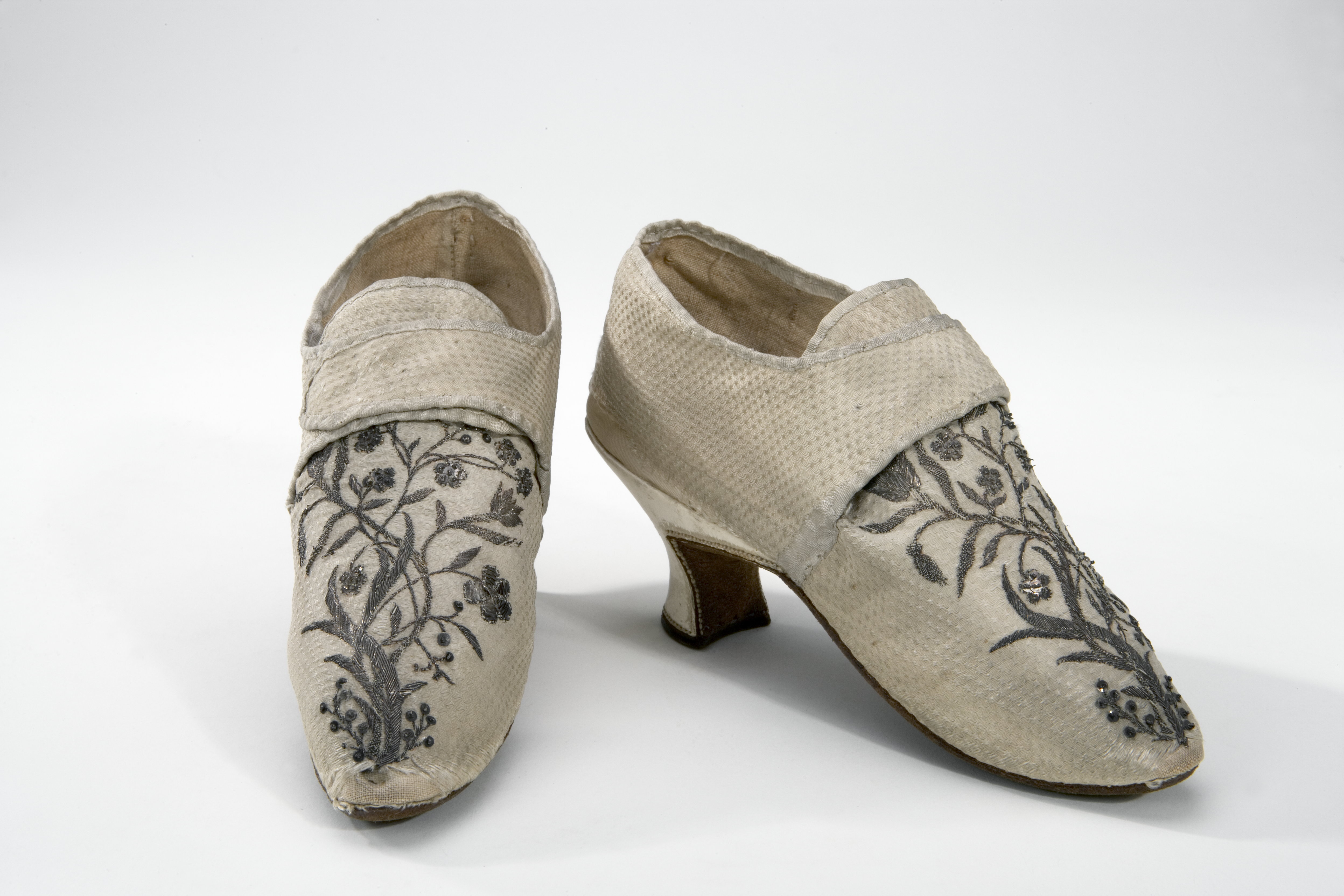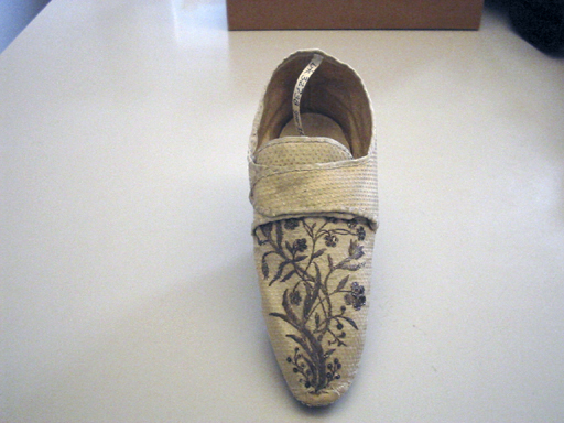 Hedvig Elisabeth Charlottas bröllopssko 1774. (1759-1818) Sko skuren i ovanläder och bakkappa som går omlott i sidan. Skon med spetsig tå har hög, insvängd klack klädd med sämskat getskinn? och stickningar längs klacken sidor. Skon fodrad med beiget linne. Innersula av getskinn? Mitt fram är ovanlädret helt täckt av ett silverbroderi med paljetter i form av blad och blommor. Kantband av benvitt siden finns runt skon ringning, plös och slejfar samt över hälpartiets mittsöm. Yttersula av brunt nötläder med ett stjärnformigt pinnhål under tåpartiet och ett under hålfoten.
