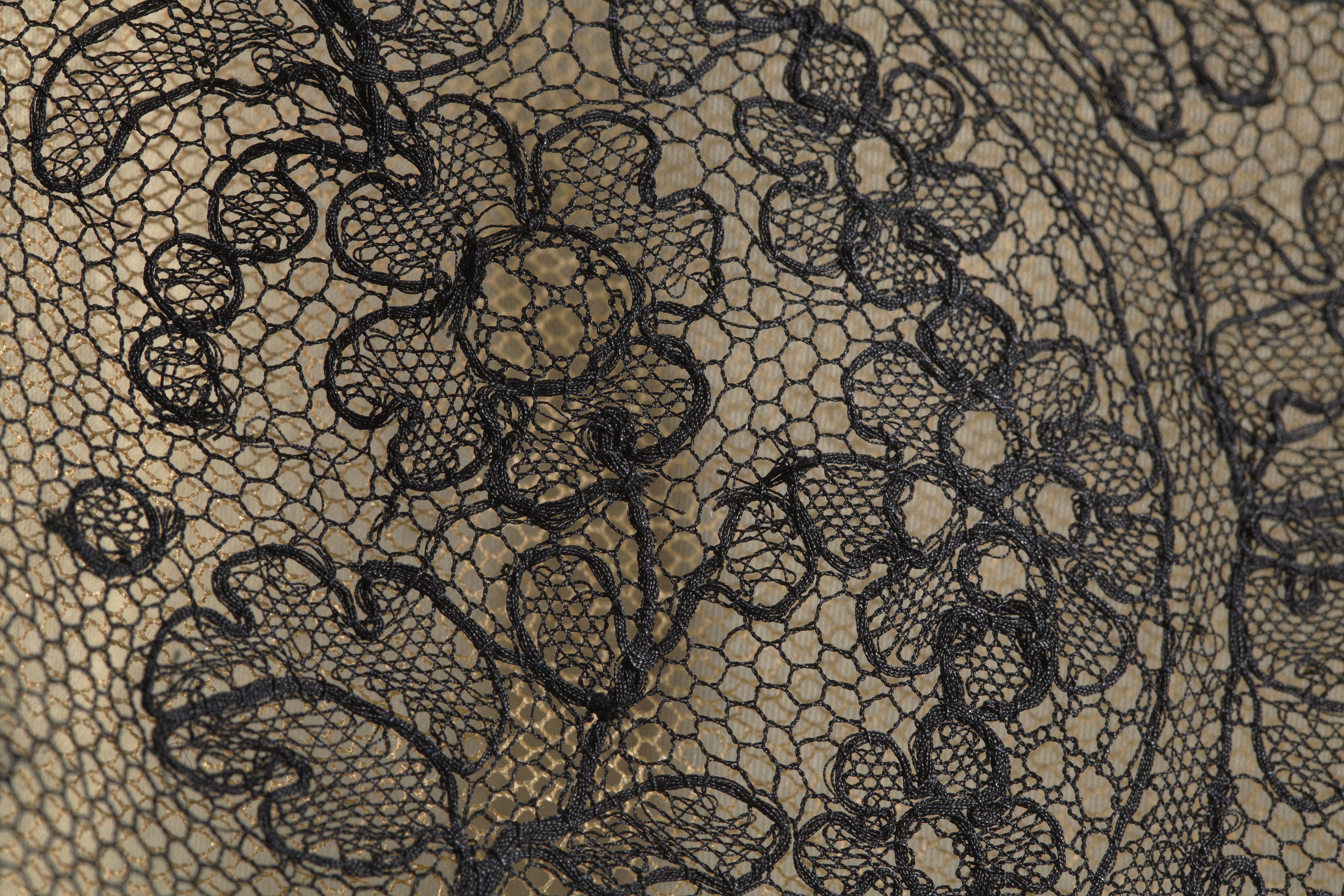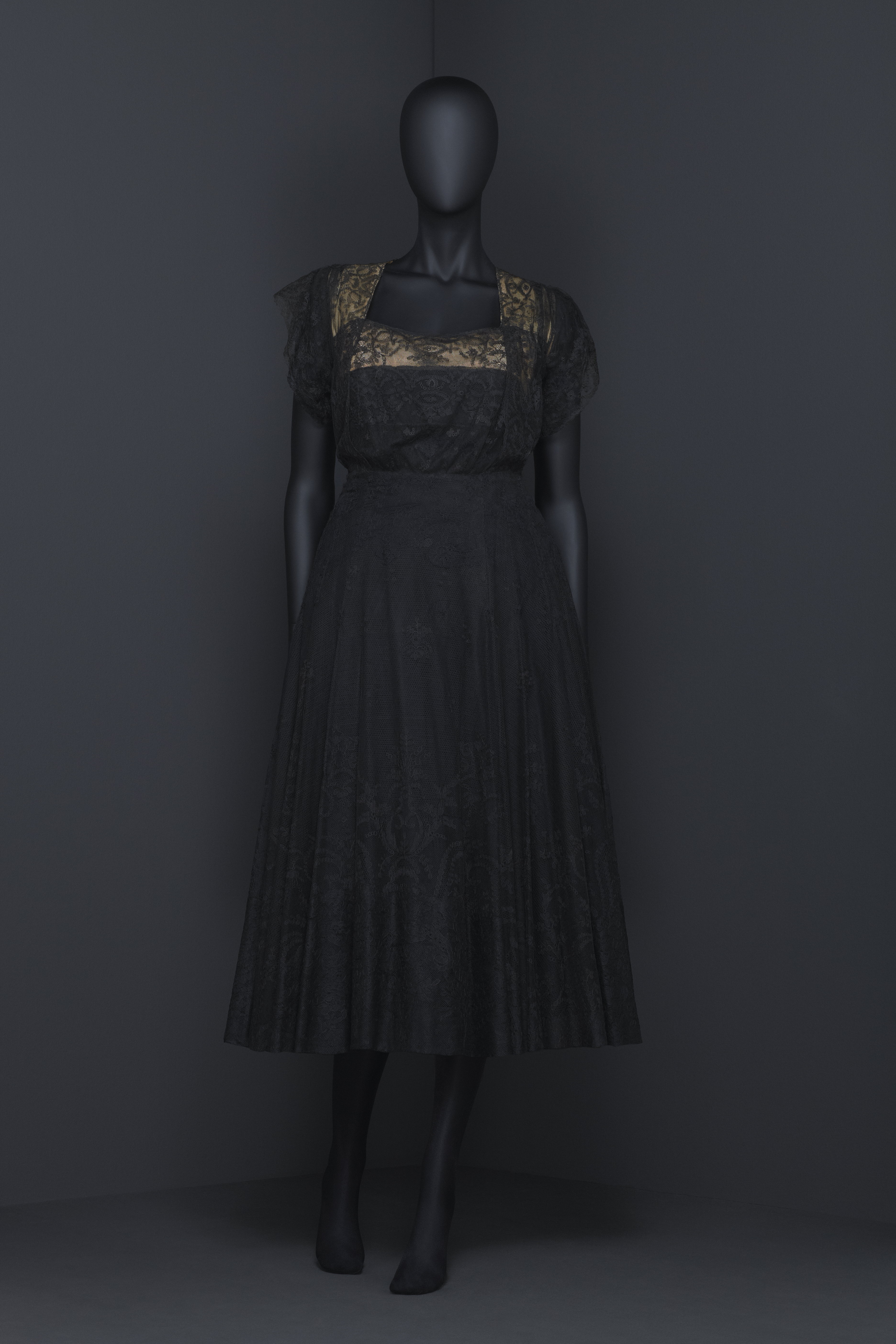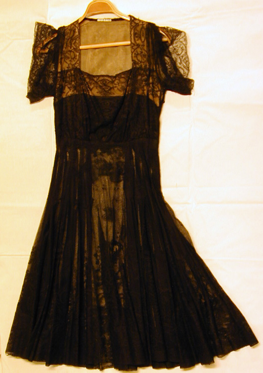 Kort aftonklänning av svart brysselspets med framtill ett dubbelt spetslager. Fyrkantigurringning. Kort vid ärm. Från livsömmen fram över axlarna till livsömmen bak en 180 mmbred lös spetsvåd fästad i sidsömmarna och utmed urringningen. Vid livsömmen mitt fram ochmitt bak ett slätt parti. I vardera sidan sju lagda veck. Foderlivet tredelat upptill med hudfärgat siden. Mellandelen av tjockare blekt laxfärgatsiden. Längst ned foder av svart siden. Rundskuren kjol med fyra segmentvåder med tätaremönster och vågad söm. Brysselspetsen fodrad med tyll. Fåll på tyllen, 40 mm bred. Spetsenklippt kant i kant och fäst i tyllen. I vänster sida ett 270 mm långt blixtlås märkt: "GUSUM".