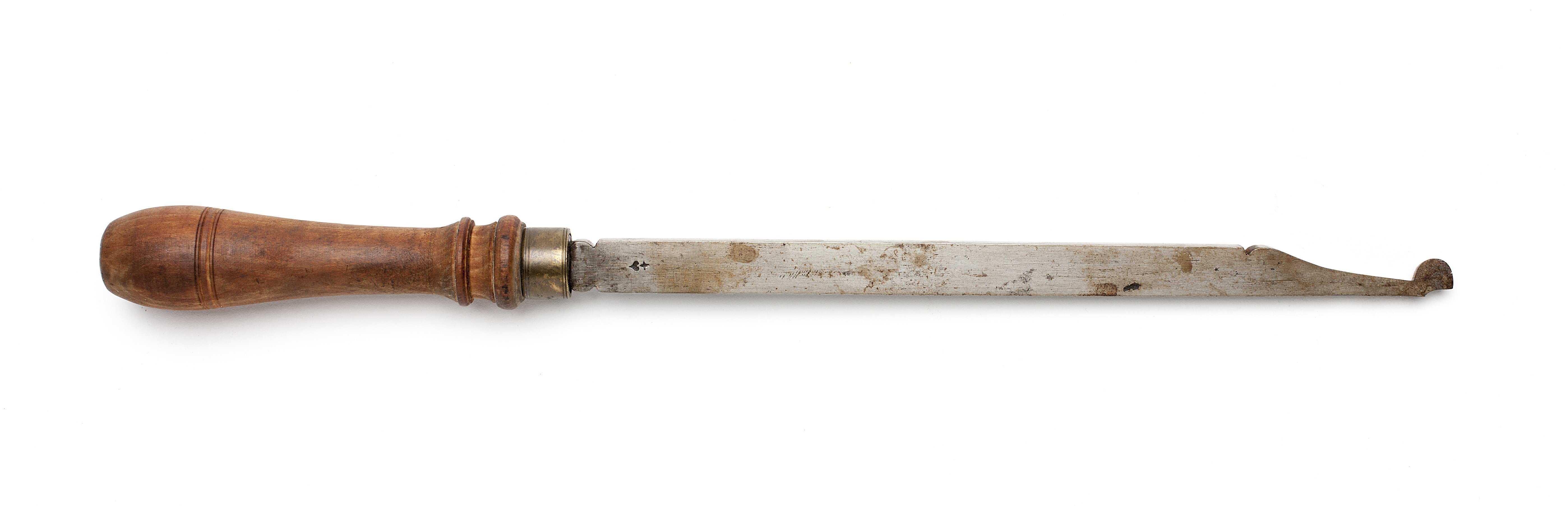 Klinga med rektangulär genomskärning och profilerad hals. Stämplat på klingan: hjärta under kors. Änden avsmalnande och svängd. Halvcirkelformad egg. Svarvat skaft av päronträ med två vulster nedtill ("rydboholmstyp"). Mässingsring.