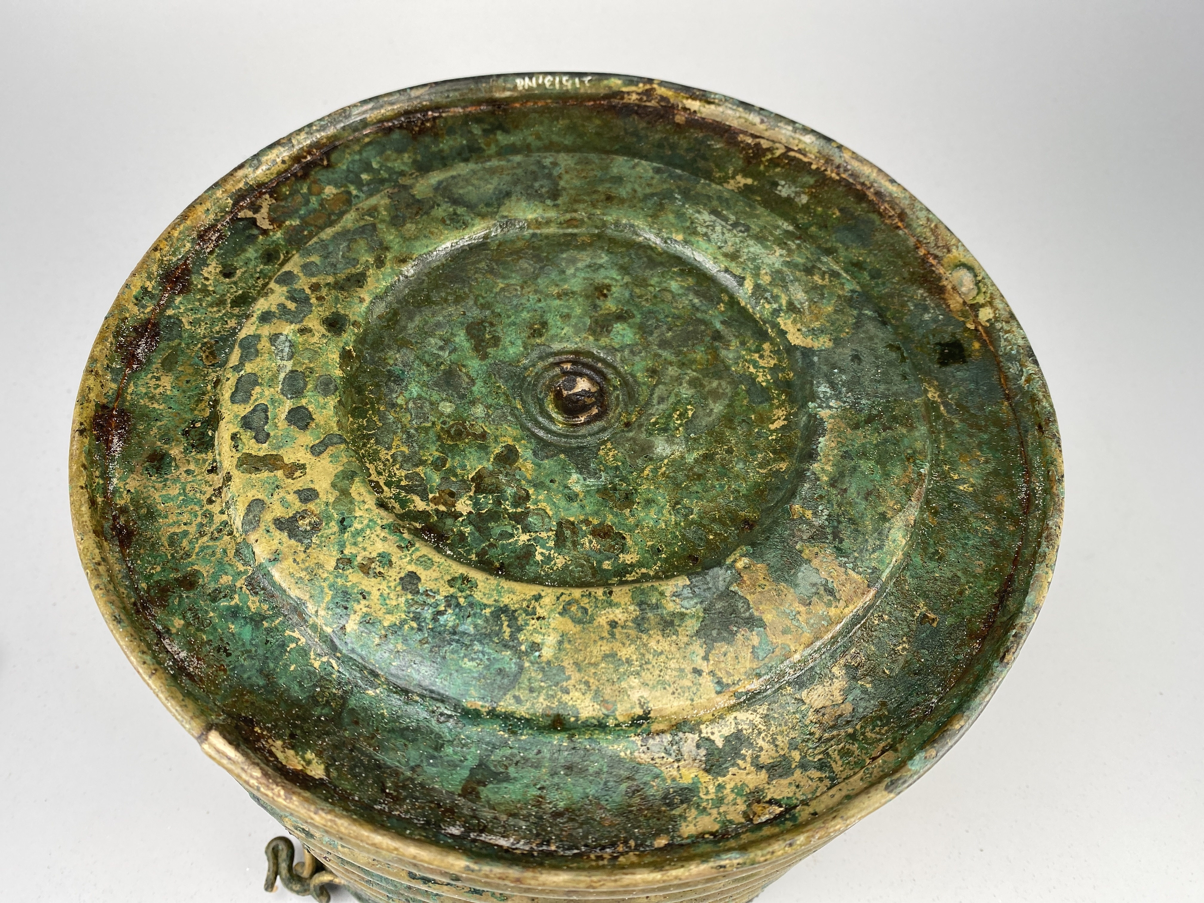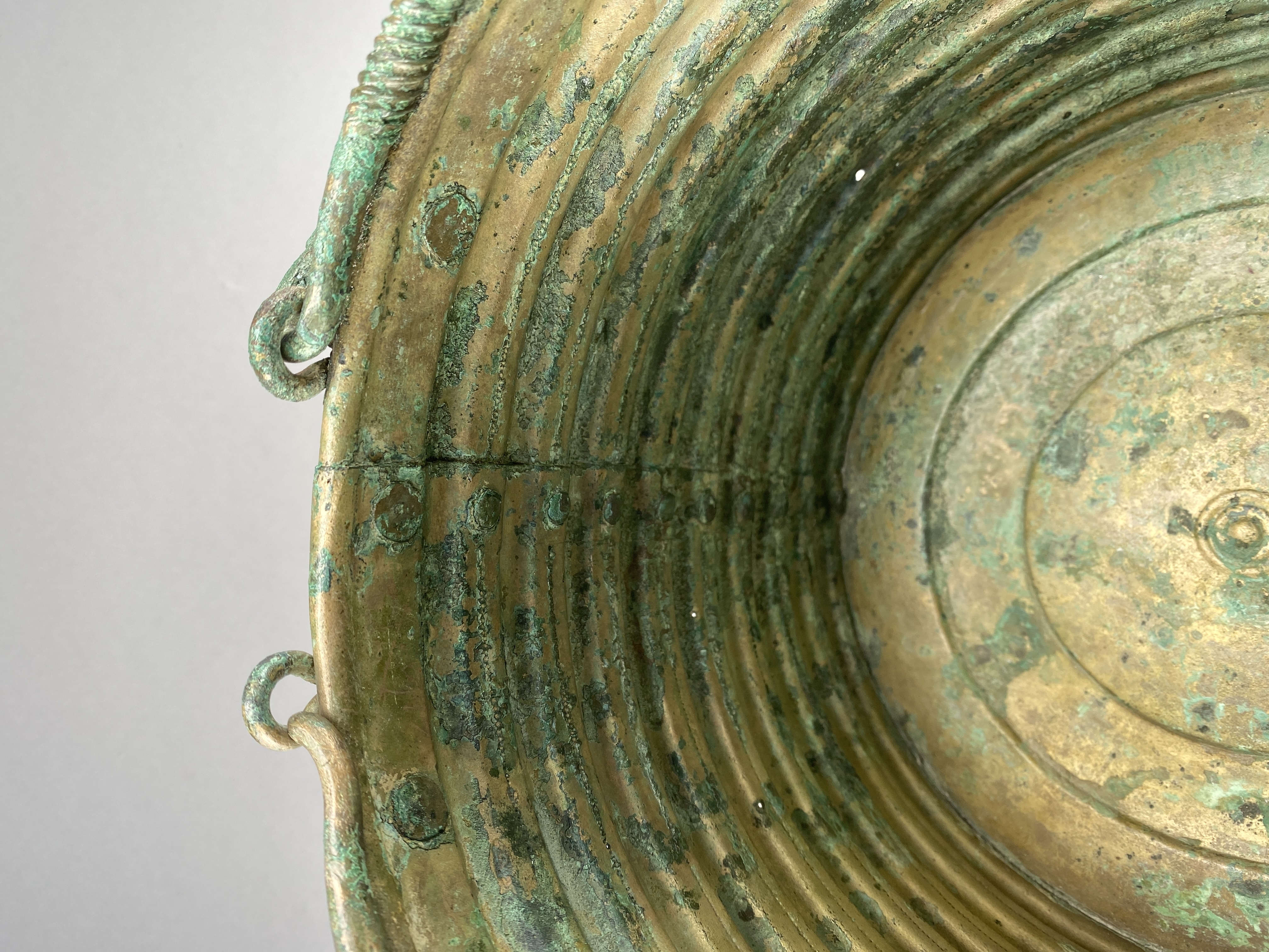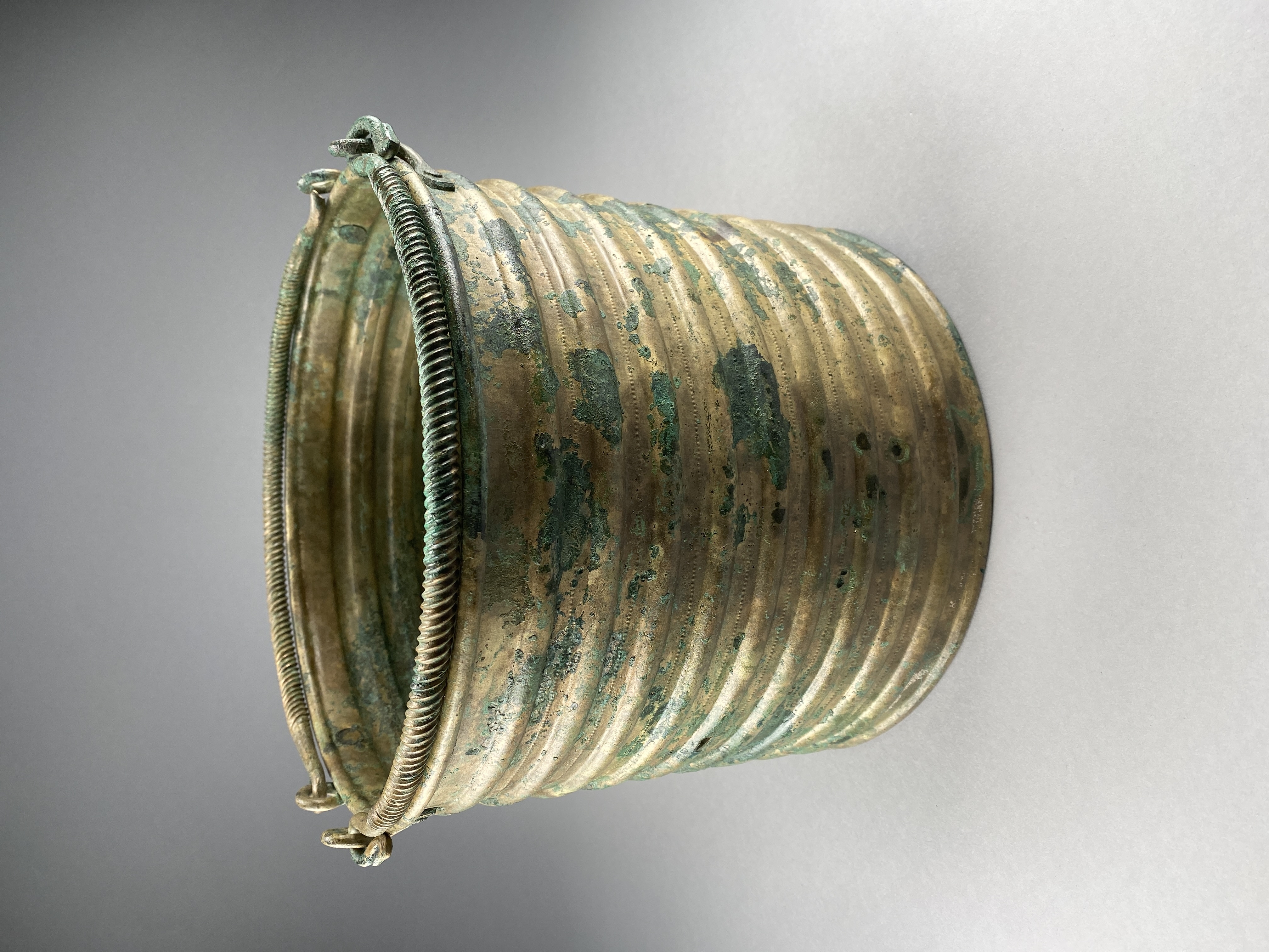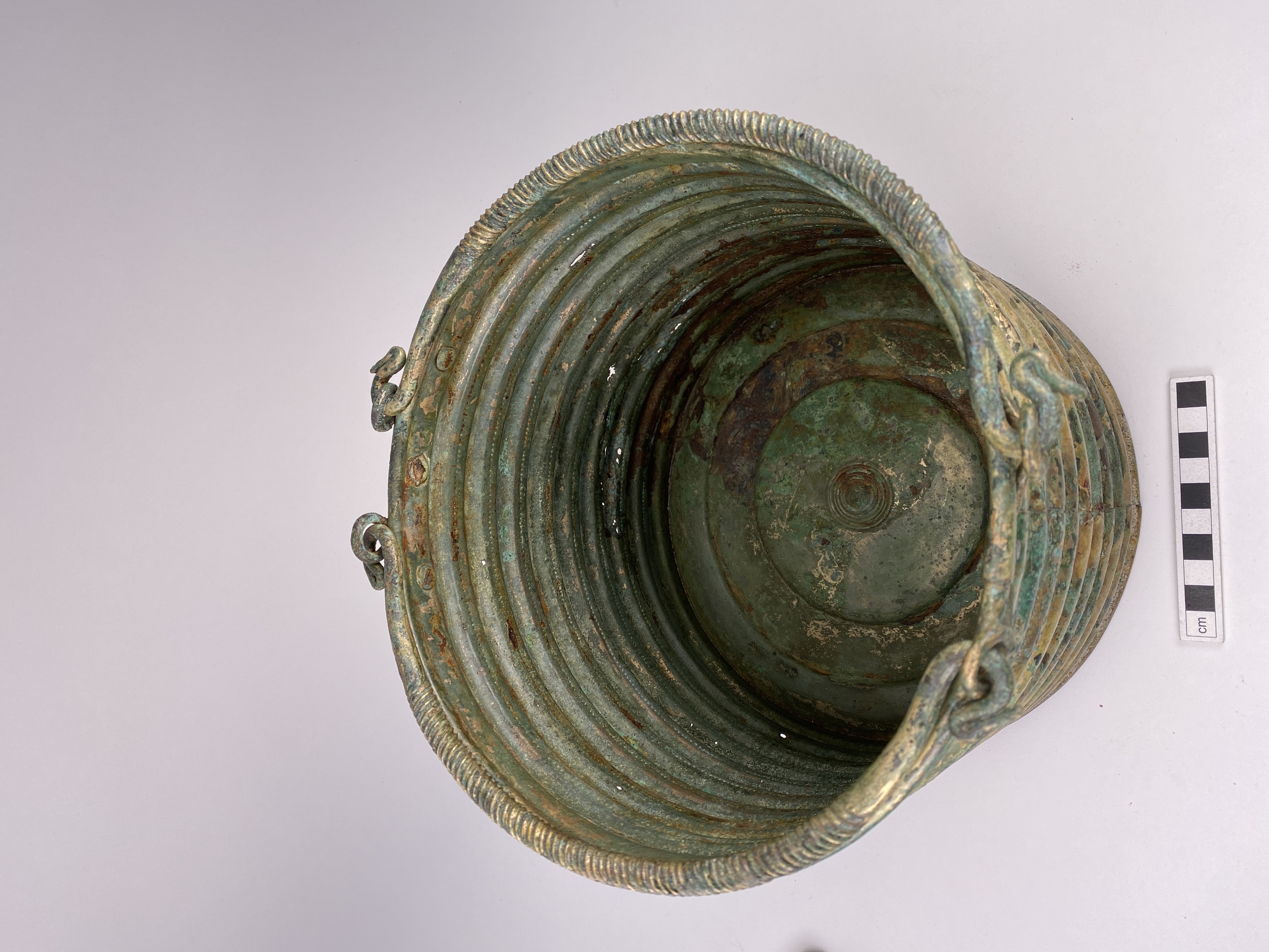 Ciste a cordoni eller Rippenzisten. Ett ämbar av brons, nästan identiskt lika drivna med nio kraftiga vulster och mellan dessa rader av drivna punkter. Botten är särskilt fastsatt med stöd av den invikta nederkanten. Bottens ornamentik består av ett kraftigt ringformat parti och i mitten cirklar kring en mot kärlets insida uppdriven buckla. Dubbla hankar med ensidig räfflad ornering samt avslutade med stiliserade fågelhuvuden. Hankfästena är gjorda av en bronsten, fäst med tre nitar. Mitt för ena hankfästet är ämbaret sammanfogat med en rad stora nitar med platta huvuden.