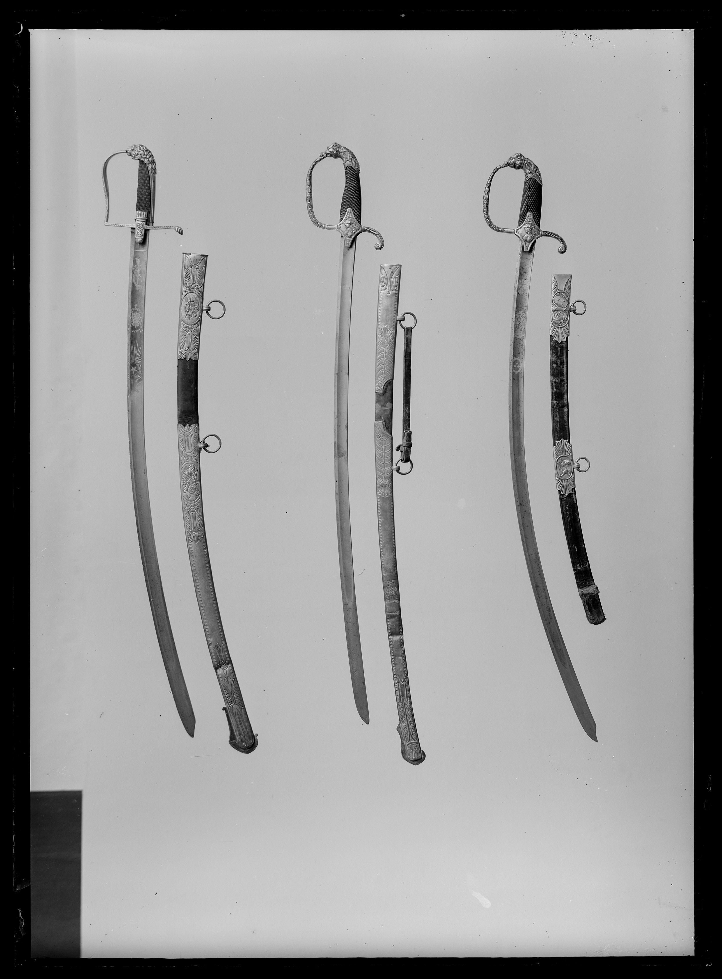 Fäste av förgylld, reliefornerad mässing, kappa framtill i form av ett lejonhuvud med manen inramad av en slät list och baktill övergående i en nedåtböjd hylsa utgörande kavelns överdel, denna ornerad med stiliserade blad, på baksidans förlängda nederdelen stjärnliknande rosett. Handbygel i sin helhet bågformig, överdelen intappad i lejongapet, mellandelen på båda sidor med en ranka av klockformiga blad, på mitten avbruten av en långsträckt rosett. Bakre parerstång nedåtböjd, ornerad med enkla snedställda blad och avslutad med en liten rund rosettornerad skiva. Styrskenor stora, formade som romber med insvängda sidor och tvärt avskurna hörn samt ornerade med en bröstbild av Minerva i profil åt vänster. Kavel av ebenholts med mjukt rektangulärt tvärsnitt, ut-och insidan med tätt inskuret rombiskt rutmönster. Klinga böjd, eneggad och med plan rygg, spetspartiet med ryggsidan konkavt insvängd mot eggsidan. Ut-och insidan med bred hålkäl nående fram till ett avstånd av ca 125mm.,från spetsen. På starka delens båda sidor etsad och förgylld ornering. Nedtill ett rektangulärt fält inramat av förgylld bård, härovanför liten trofégrupp med oval sköld, vari (otydligt) tre kronor, längst upp ett trekronorsvapen i oval sköld omgivet av lagerkrans. Mellan trofégruppen och den ovala trekronorsskölden: på utsidan under kunglig krona monogram av dubbelt C omslutande ordningssiffran XIII (Karl X1II) under monogrammet ett svärd korsat med ett ankare, på insidan under svensk hertig-krona ett monogram av CJ (kronprins Karl Johan), under monogrammet två korsade svärd.