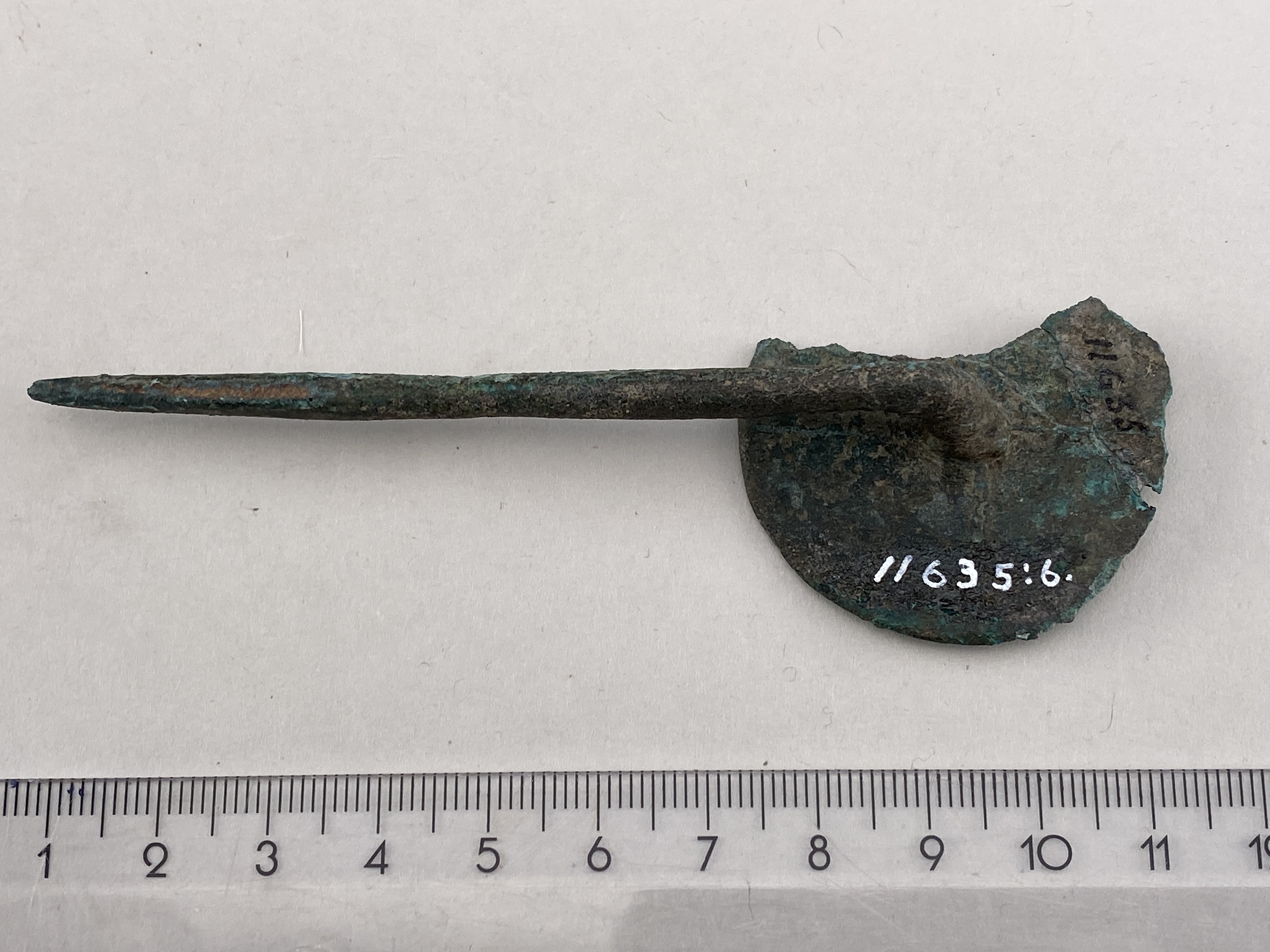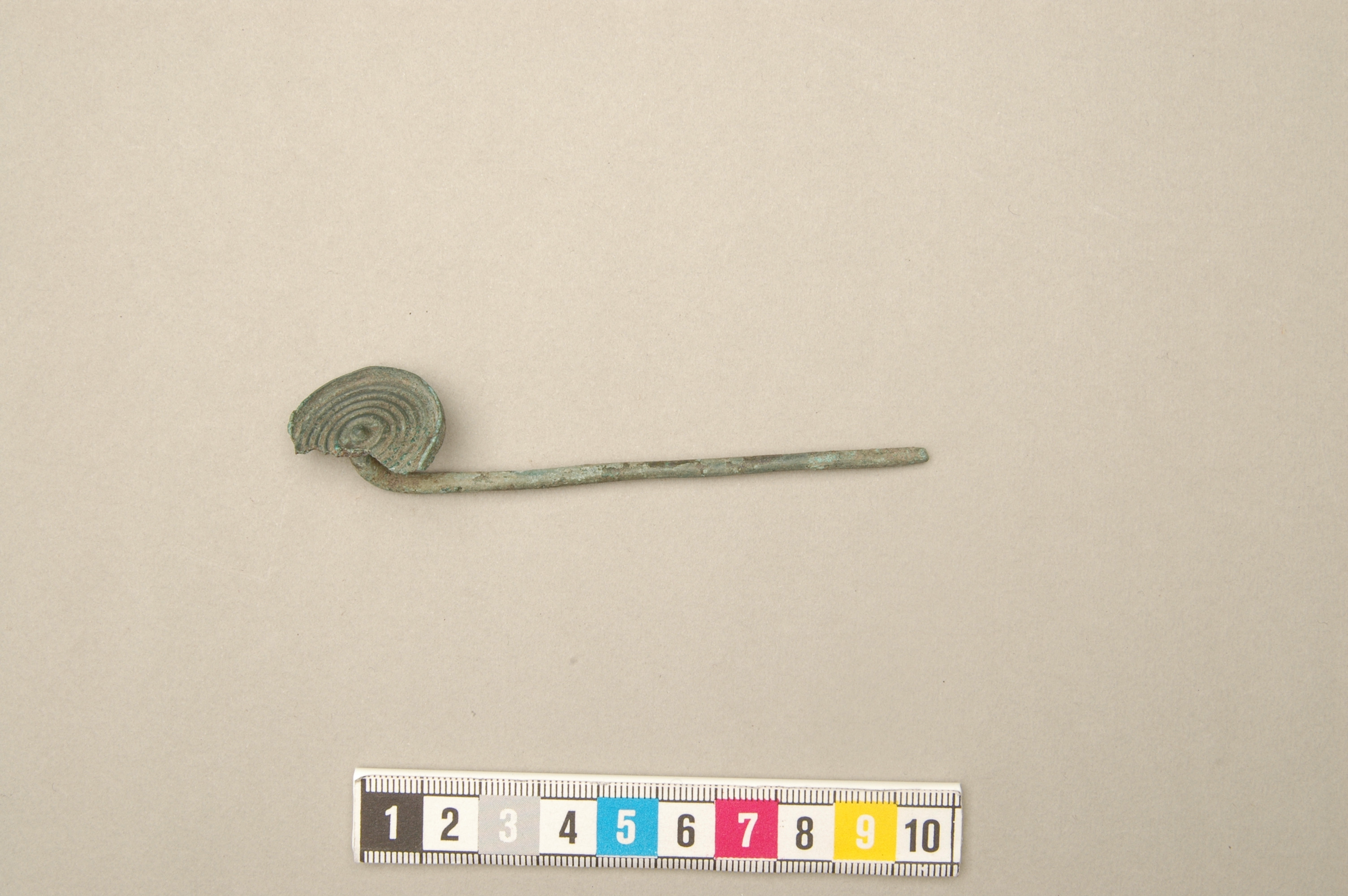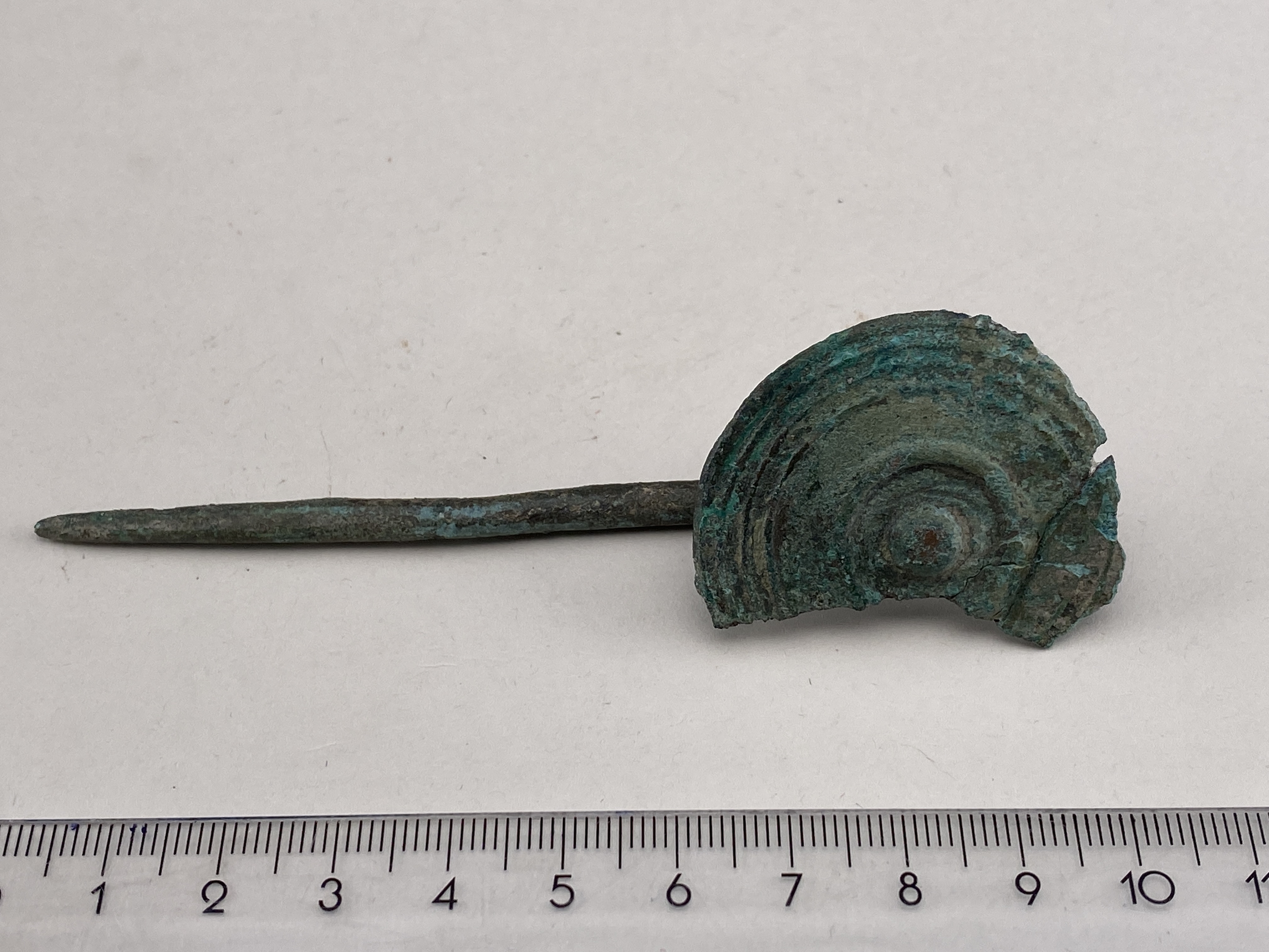 Skivnål av brons med litet, vertikalt ställt huvud med uppstående ytterkant samt där innanför ornerat med fem koncentriska cirklar. En del av huvudet är bortbrutet.