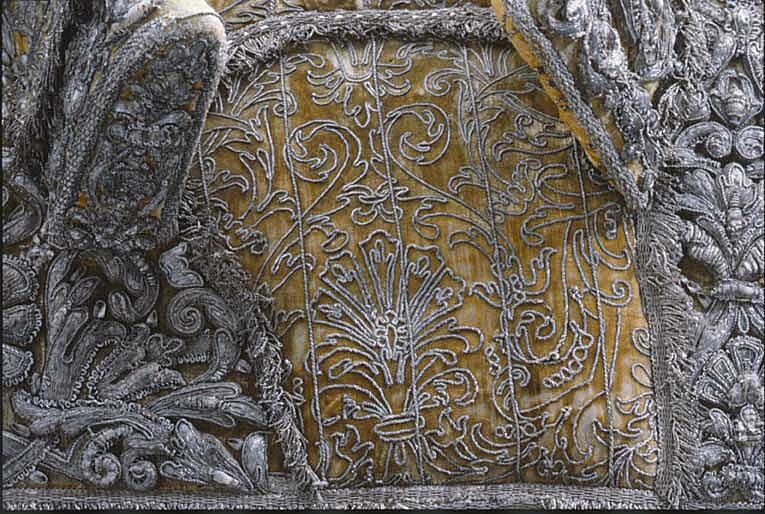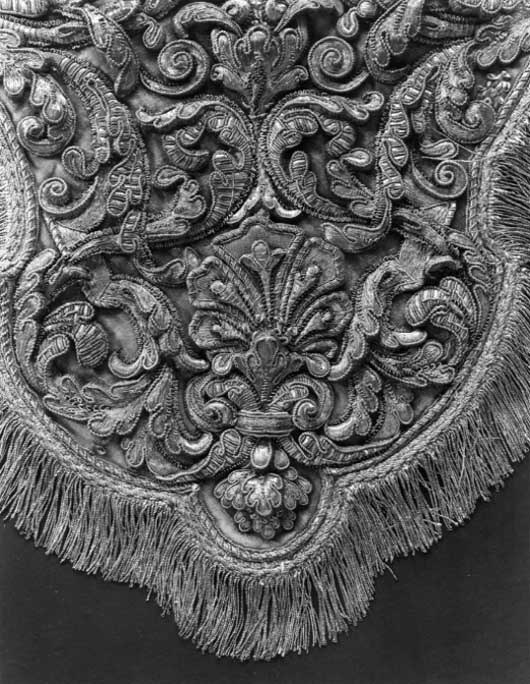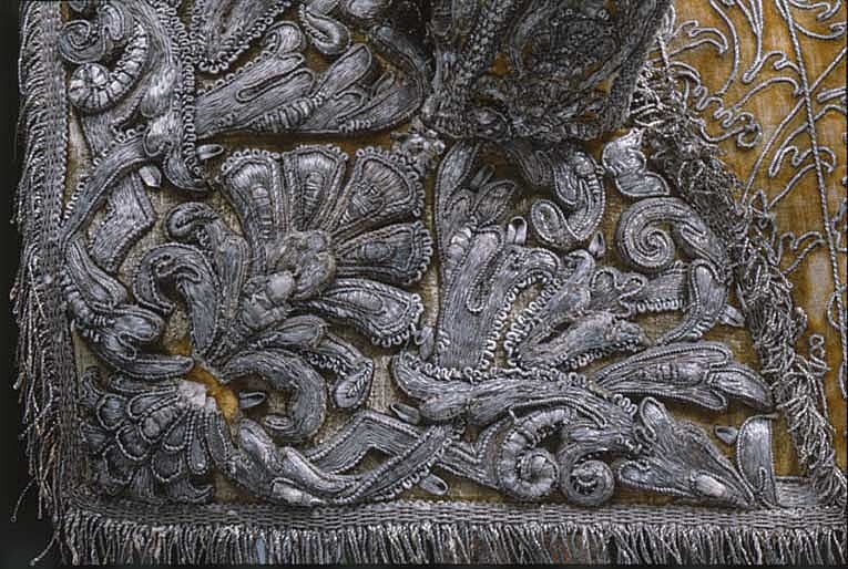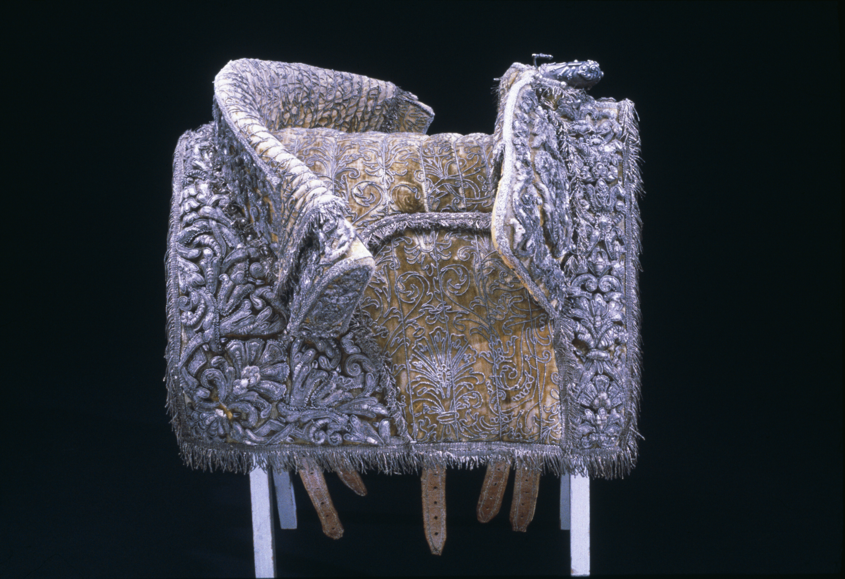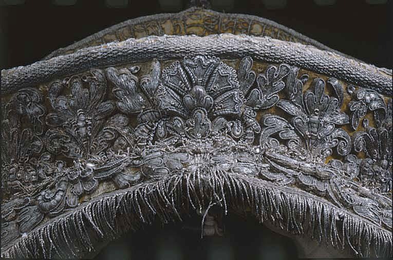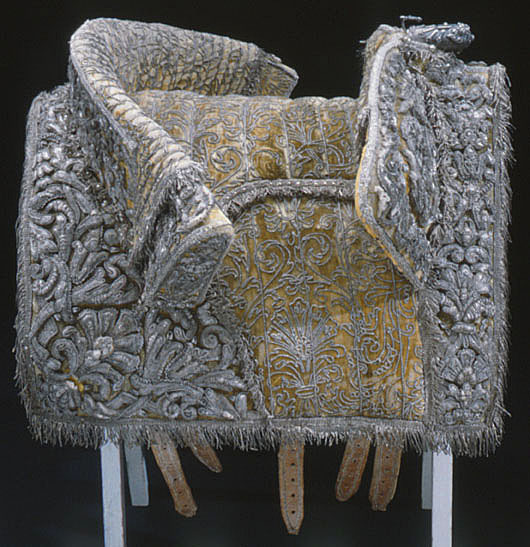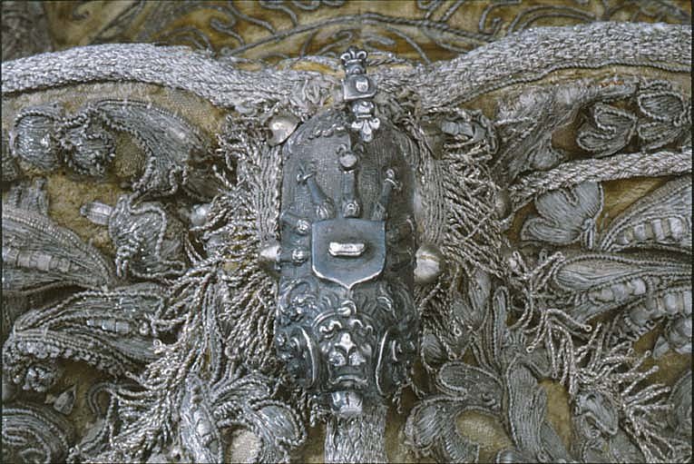 Hölstren af guld saffian beslagne med silfver; Remmar och söljor af silfver. Husen af citronfärgad moire med en stor silfverfrans omkring