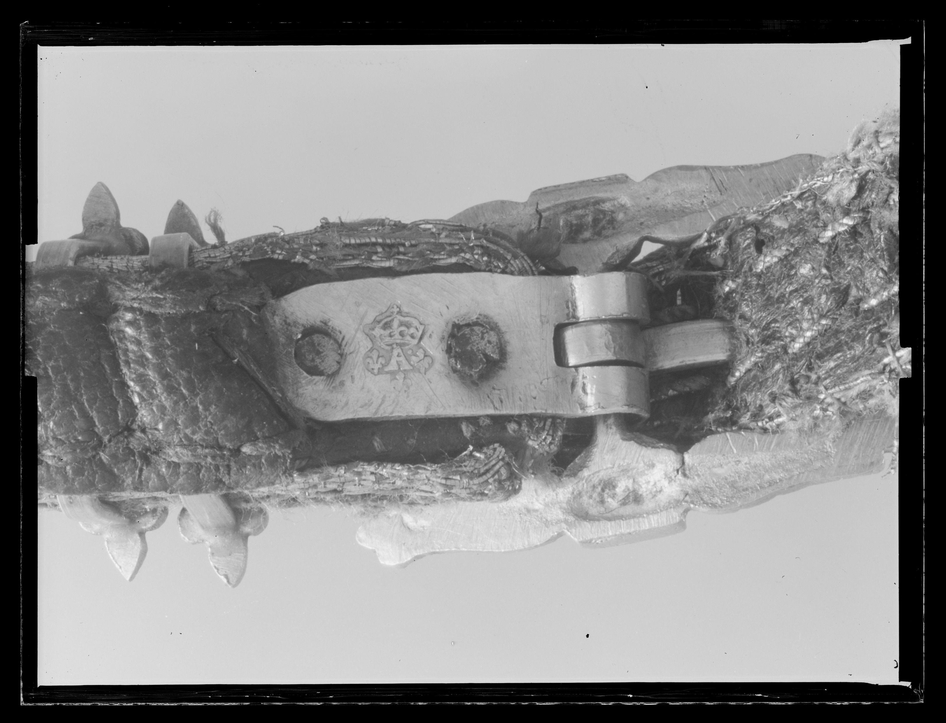 Förbögeln af guld saffian med en silfver galon och öfver slagen med silfver stifter pucklor och söljor af drifvet arbete