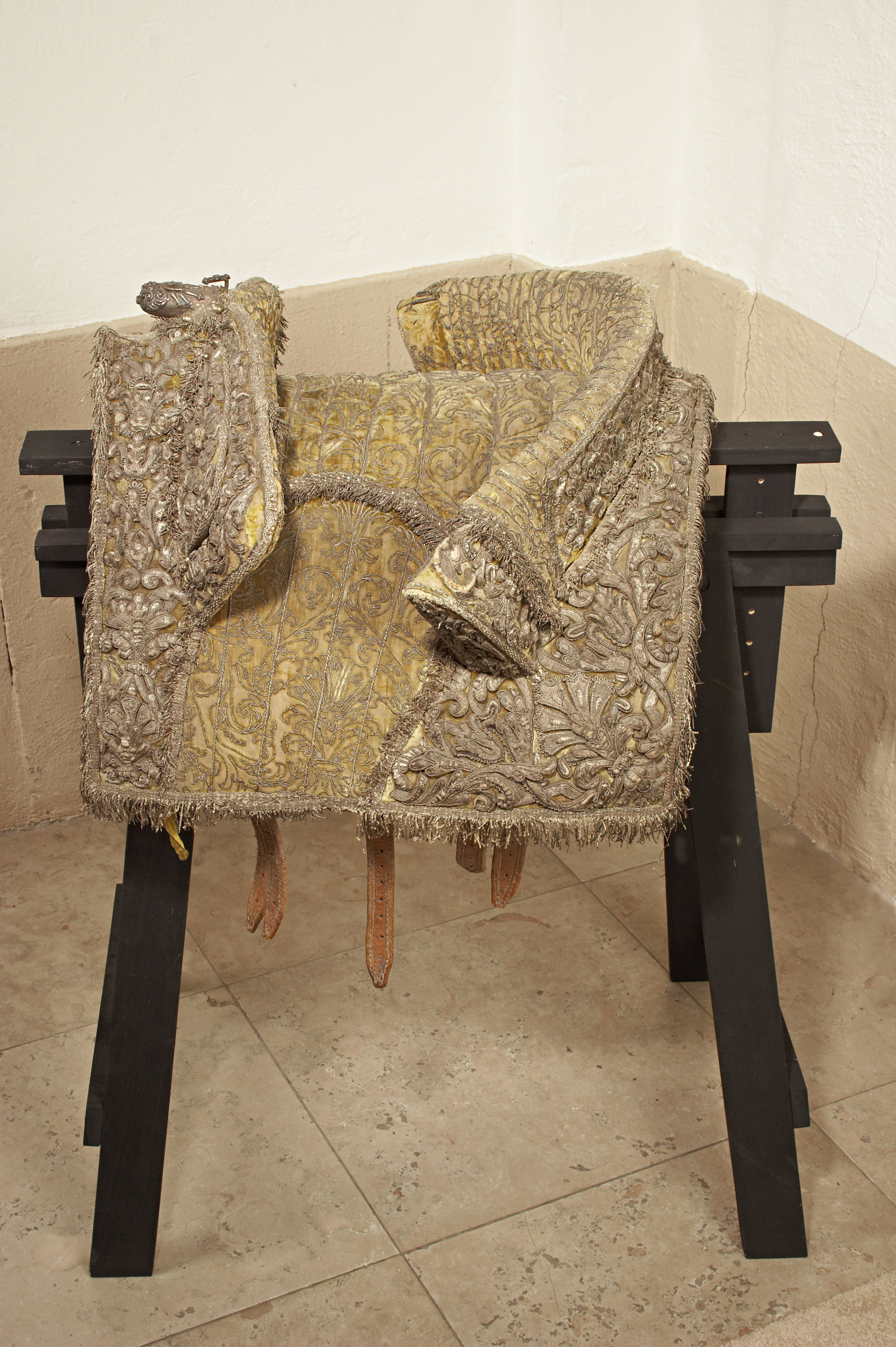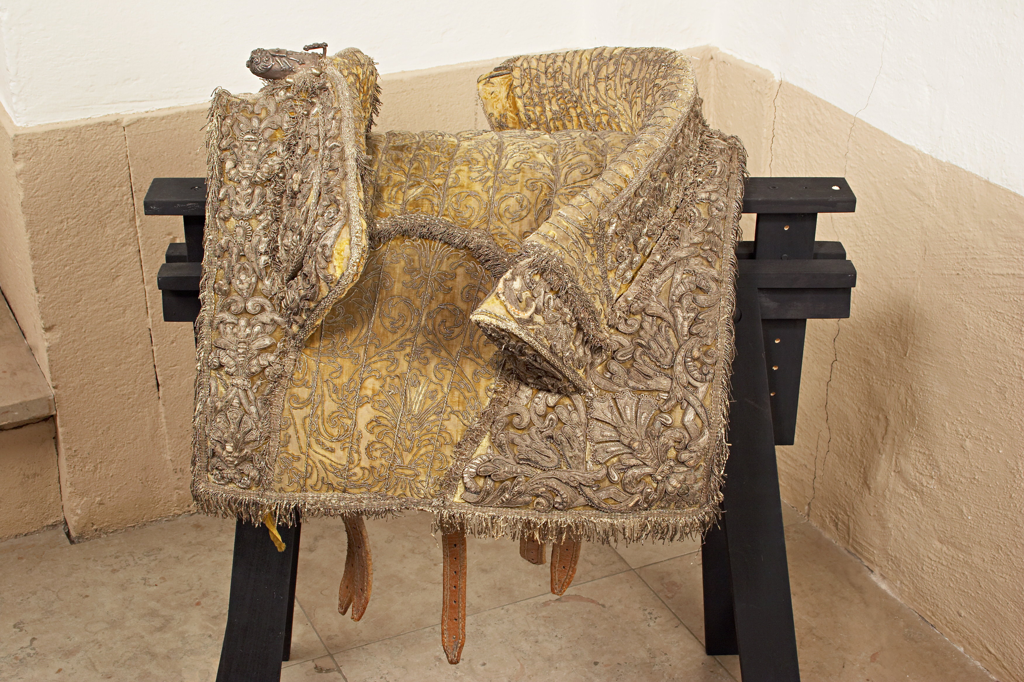- 1 Sadel af citronfärgadt sammet; sadelkåpan, hölsterkåporne med eschabraquet broderade af upphöjdt silfver; på eschabraquet Konung Carl XI:s namn broderadt på guld med blomerant. Sadel, Eschabraque och Hölsterkåpor med silfverfransar.