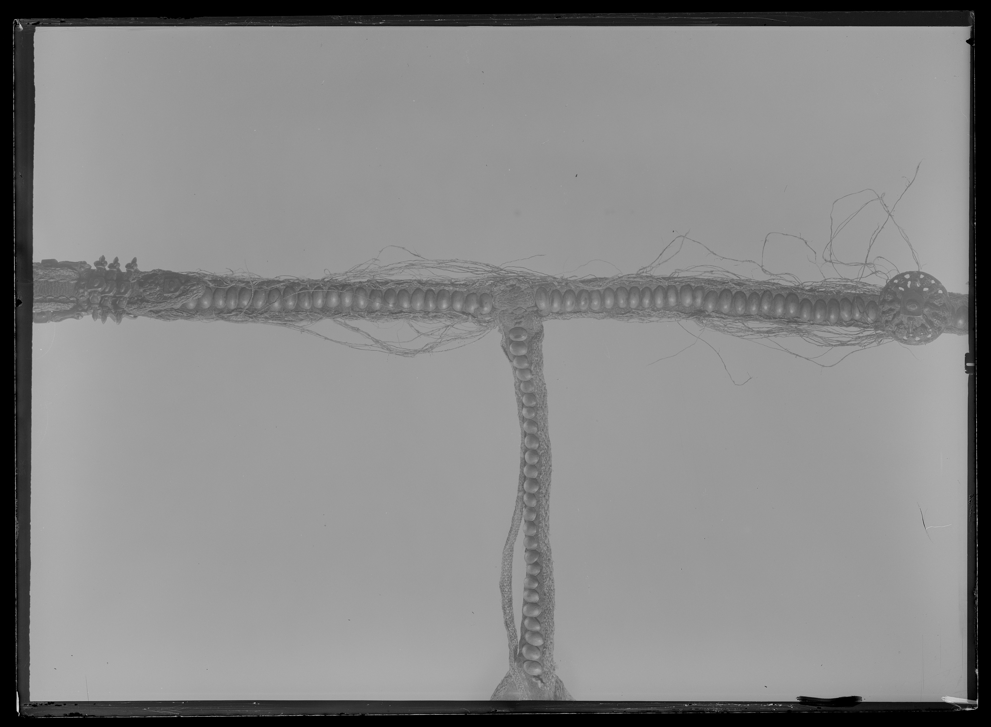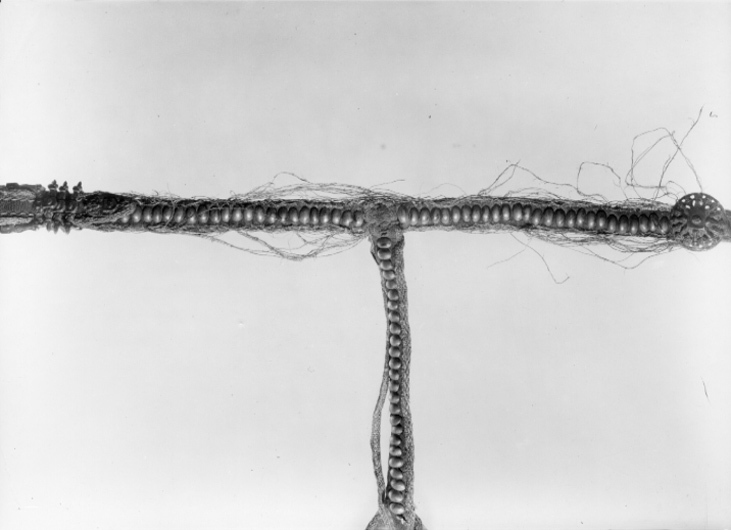 HandTygeln flätad af Silfver och hvitt Silke, med en Qvast på ena ändan ch på andra ändan en aflång Knapp af samma Arbete.