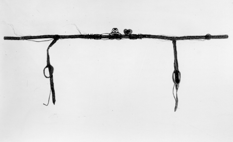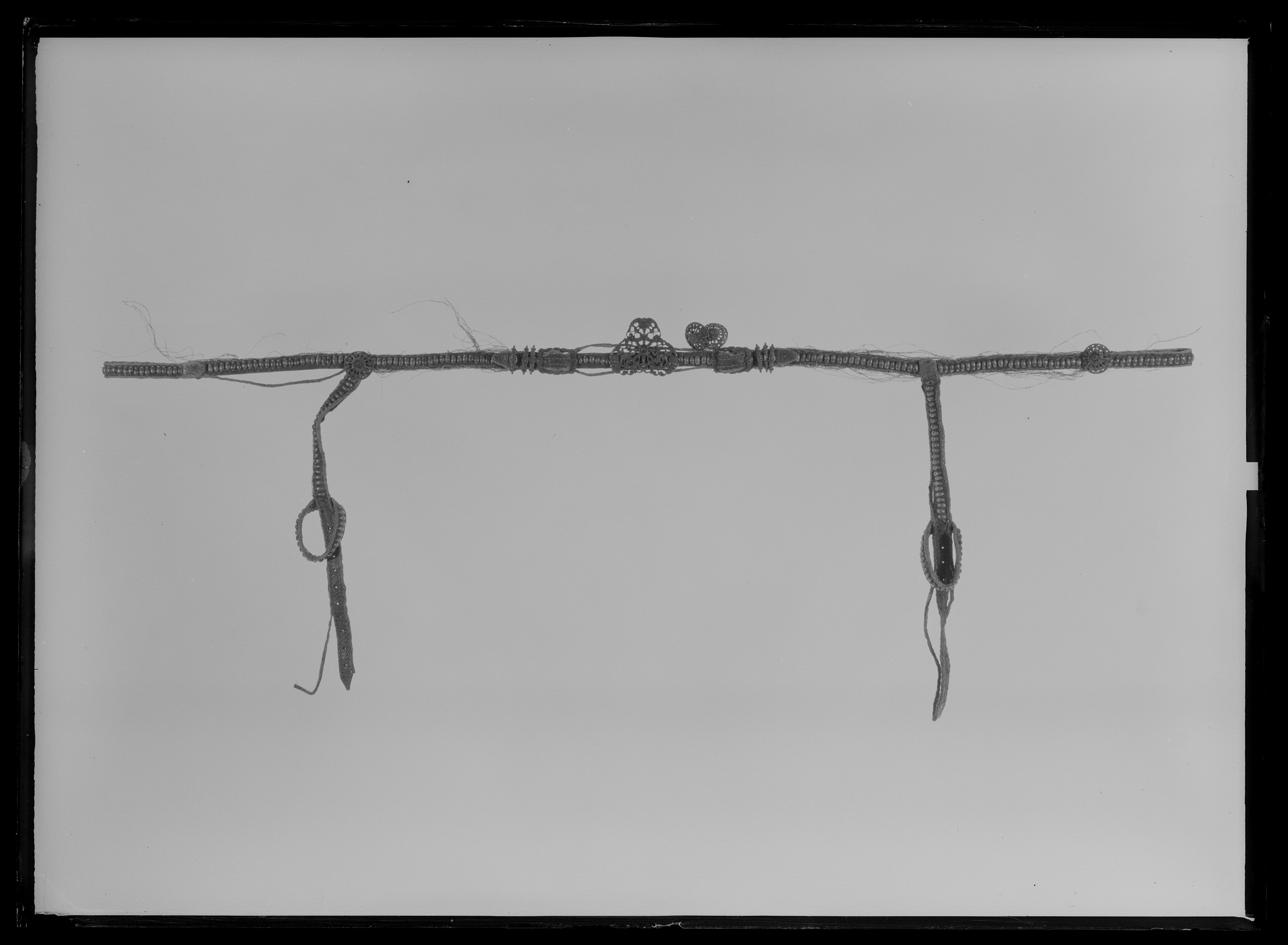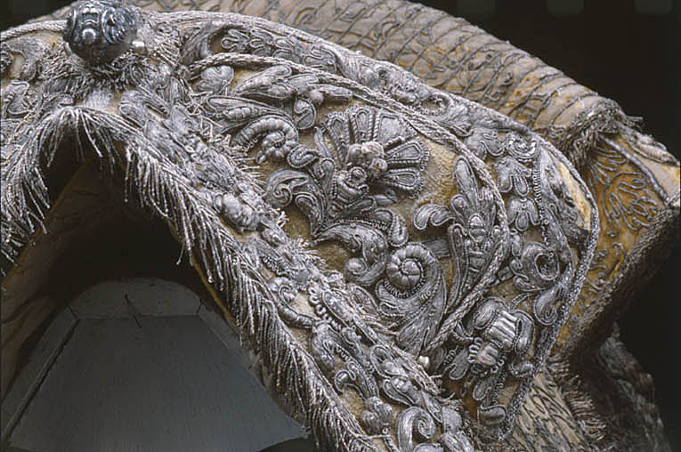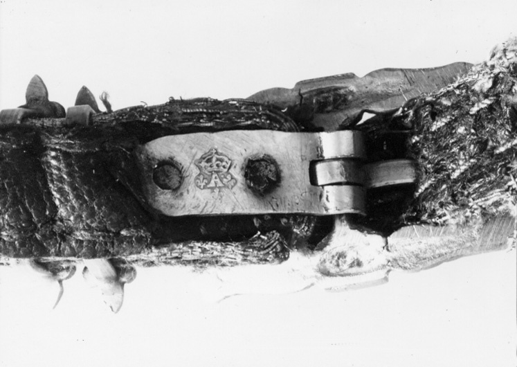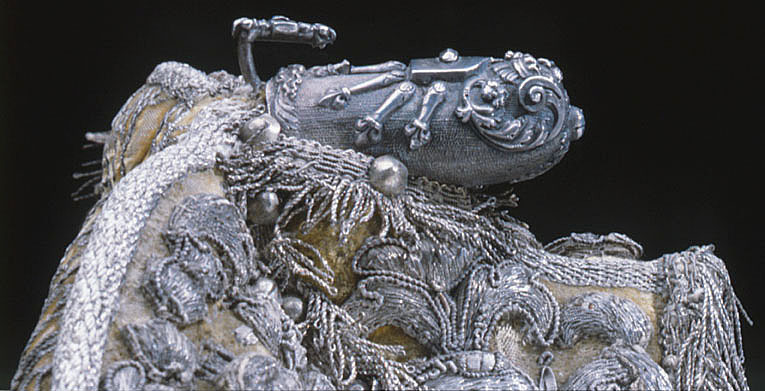 Betselstängerne försilfrade, men Pucklorne, som förbemälte är af purt Silfver, därtill 2ne Bouquetter af SIlfver, hvitt Silke och andre slags Couleurer band. På Hufvudstället och Handtygeln fattas 4 st Silfver Pucklor eller Naglar.