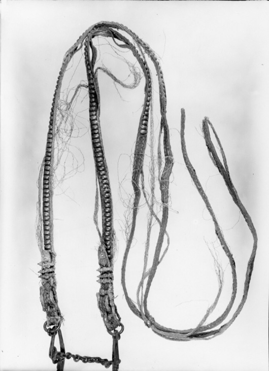 Hufvudstället och Tygelen af lika Arbete med Förbögeln; Beslaget därpå består af 489 stycken behållne Söljor, Pucklor och Stijfter af rent Silfver, med den ena Pucklan vid Kedjorne för Pannan och de 2ne Pucklorne vid Betselstängerne därmed inräknade, Kedjorne för Pannan är 4 stycken.