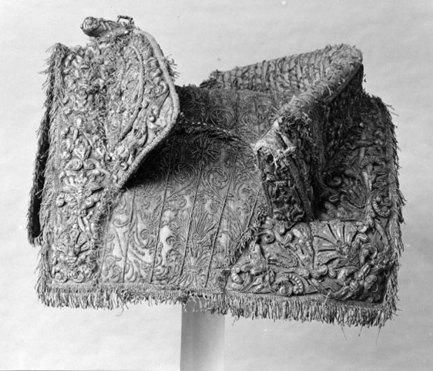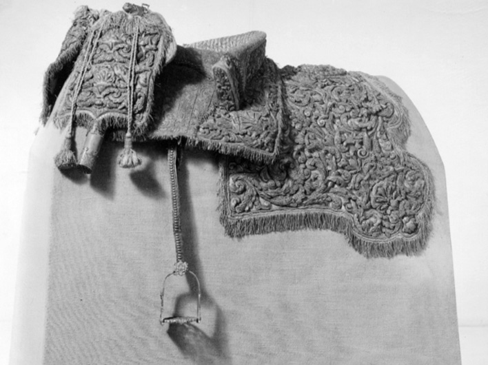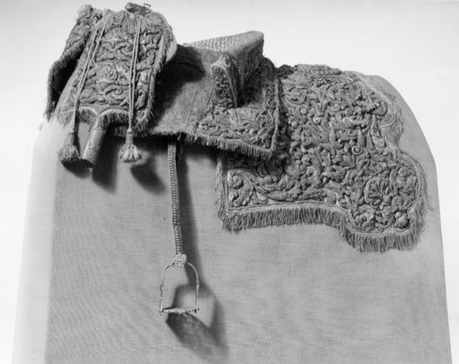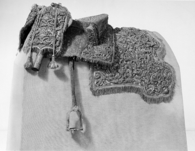 - En Ny Sadel af Citron färgat Sammet, Sätet stickat med en grann Silkes Litsqvard, SadelKåpan och HölstrerKåporne med Eschabraquet broderade af uphöjt Silfver. På Eschabraquet Hans Kongl. Majsts Konung Carl XItes Namn broerat, med Guld på Blommerant; Sadelen, Eschabraquet och Hölsterkapporne rundt omkring med Silfver Frans besatte.