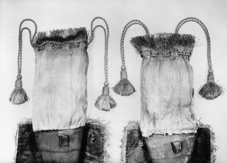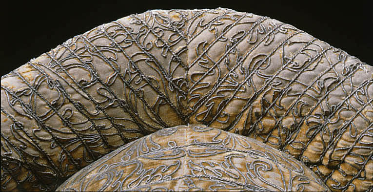 Husen öfwer Pistol Kapporne af Citronfärgat Moir, infattade ofvan omkring med en stor Silfver Frans, Litsqvarden hvarmed upp och igendragas af Silfver och hvitt Silke, Qvastarne uppå ändarne af samma slag.