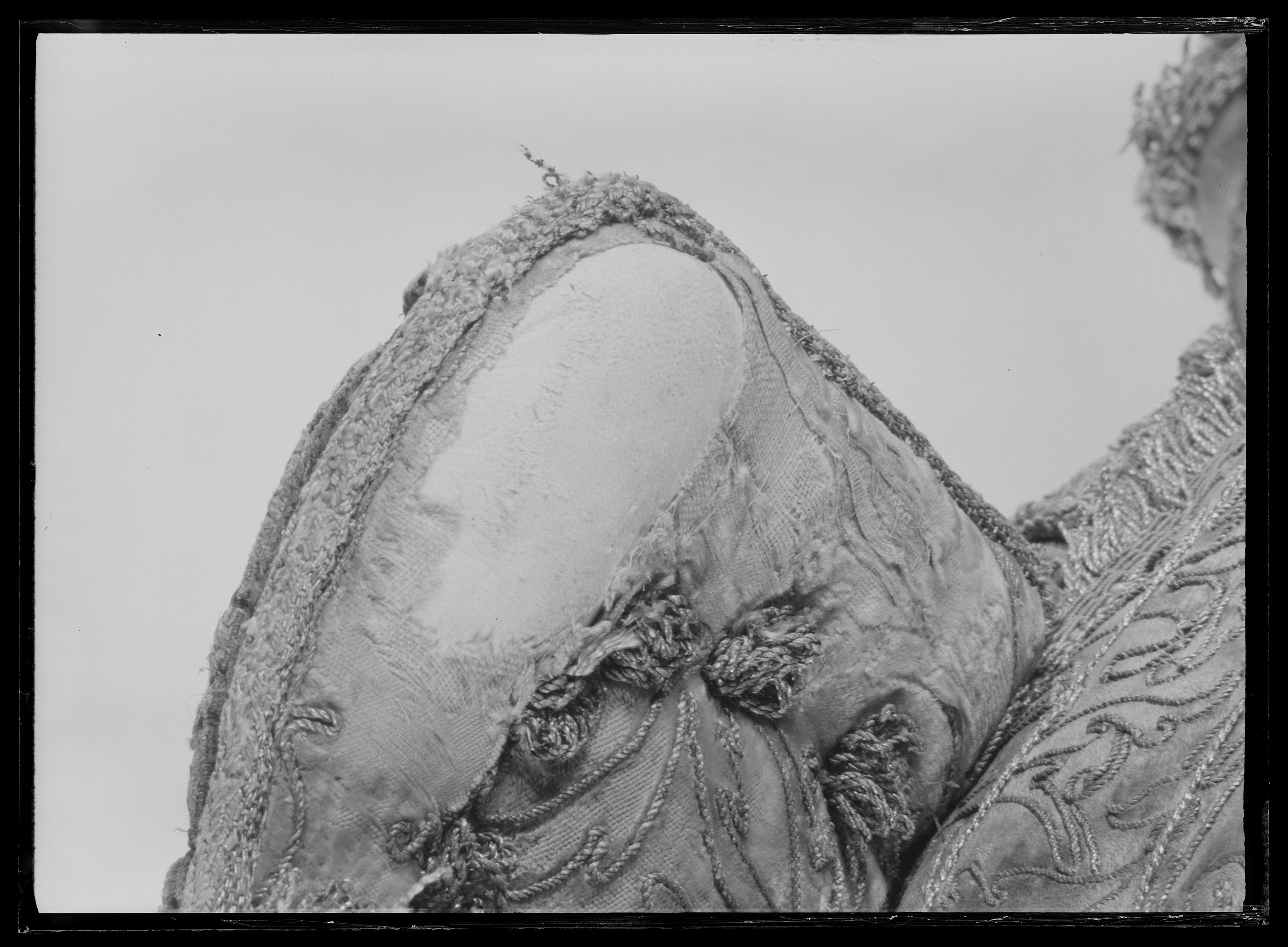Ett par Blindor, broderade lika med Sadelen, Remmarne däruti af Gult Saffian beslagne med 95 stycken Söljor och Stijfter af rent Silfver.
