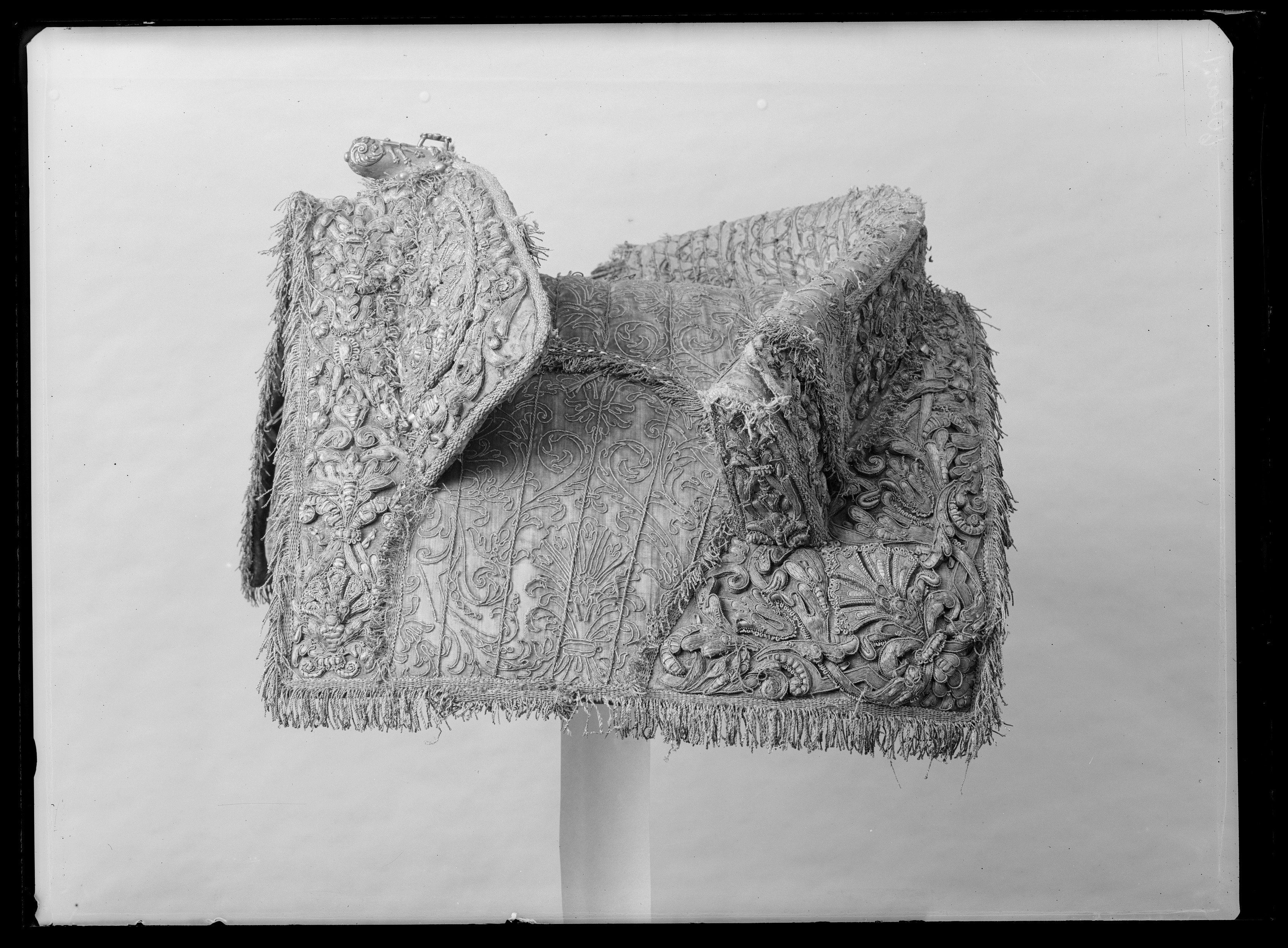- 1 Sadel af citronfärgadt sammet; sadelkåpan, hölsterkappore och eschabraquet broderade af upphöjdt silfver, på eschabraquet dubbel C, broderadt på guld med blomerant....
