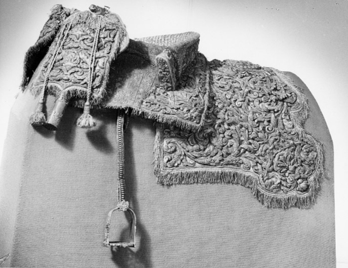- Sadel af citronfärgadt sammet med sadelkåpa, hölsterkappor och schabrak ornerade och broderade i silfver med med silfverfransar och tofsar; på schabraket dubbelt C broderadt i guld; sadelknappen med en sleif af rent silfver, och på sadeln tennlickor af samma metall; förbygeln af gult saffian med en silfvergalon och beslagen med silfverstifter, pucklor och söljor af drivet arbete; ryggstycket lika med förbygeln och beslaget af en defekt silfvergalon, beslaget som utgöres af gult saffian, beslagne med utarbetadt silfver; remmar med söljor af silfver; husen öfver pistolkapporna af citronfärgadt moiré med en silfverfrans; hufvudstället och tygeln lika med förbygeln - beslaget af silfver -; 4 st. pannkedjor; betselstängerna försilfrade med 2 buketter af silfver; 1 par runda pistolhufvuden (tillskrivet med blyerts: blindor) i samma broderi som sadeln; remmarne af gult saffian med söljor och styfter af silfver (saknas); handtygeln saknas och på stigläderna äro 39 tennlickor bortfallna. (Förärad från Frankrike.)
