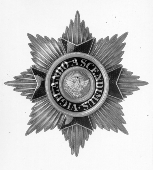 Åttauddig strålstjärna av silver, sammansatt av 64 rundade strålar med repstavskant. Därpå fäst ett malteserkors av guld, täckt med grön, genomsynlig emalj. Välvd medaljong av guld med radierande strålar, därpå fäst falk av guld och vit emalj. Välvd ring täckt med mörkblå emalj, däri guldtext: "VIGILANDO ASCENDIMUS" På in- och utsidanav den blå ringen välvda kantringar av guld, till hälften släta, till hälften med repstavsdekor. På frånsidan firmamärke i form av oval platta med relieftext: "BURY & LEONHARD" och inuti ovalen "HANAU". Vertikalt placerad säkerhetsnål.
