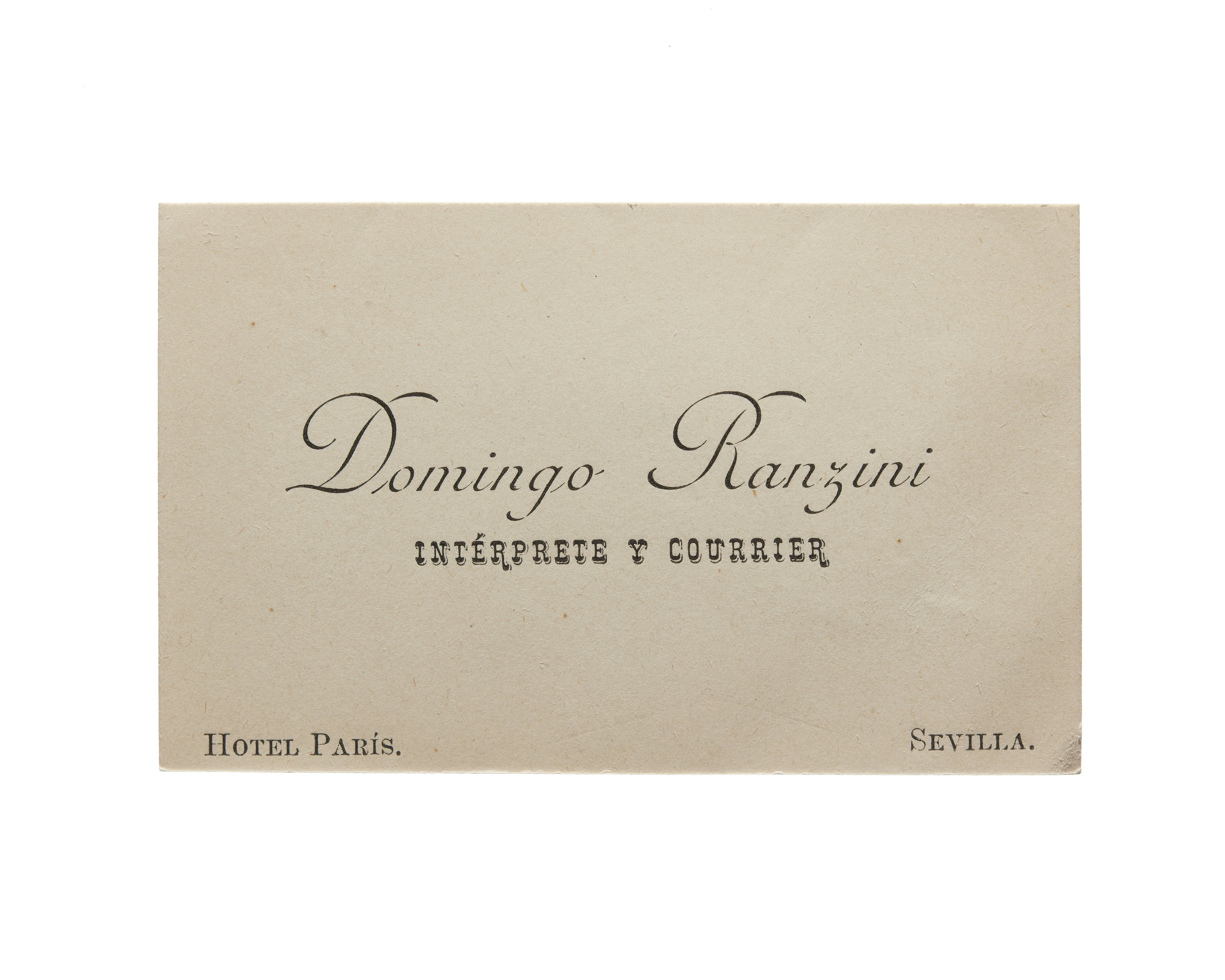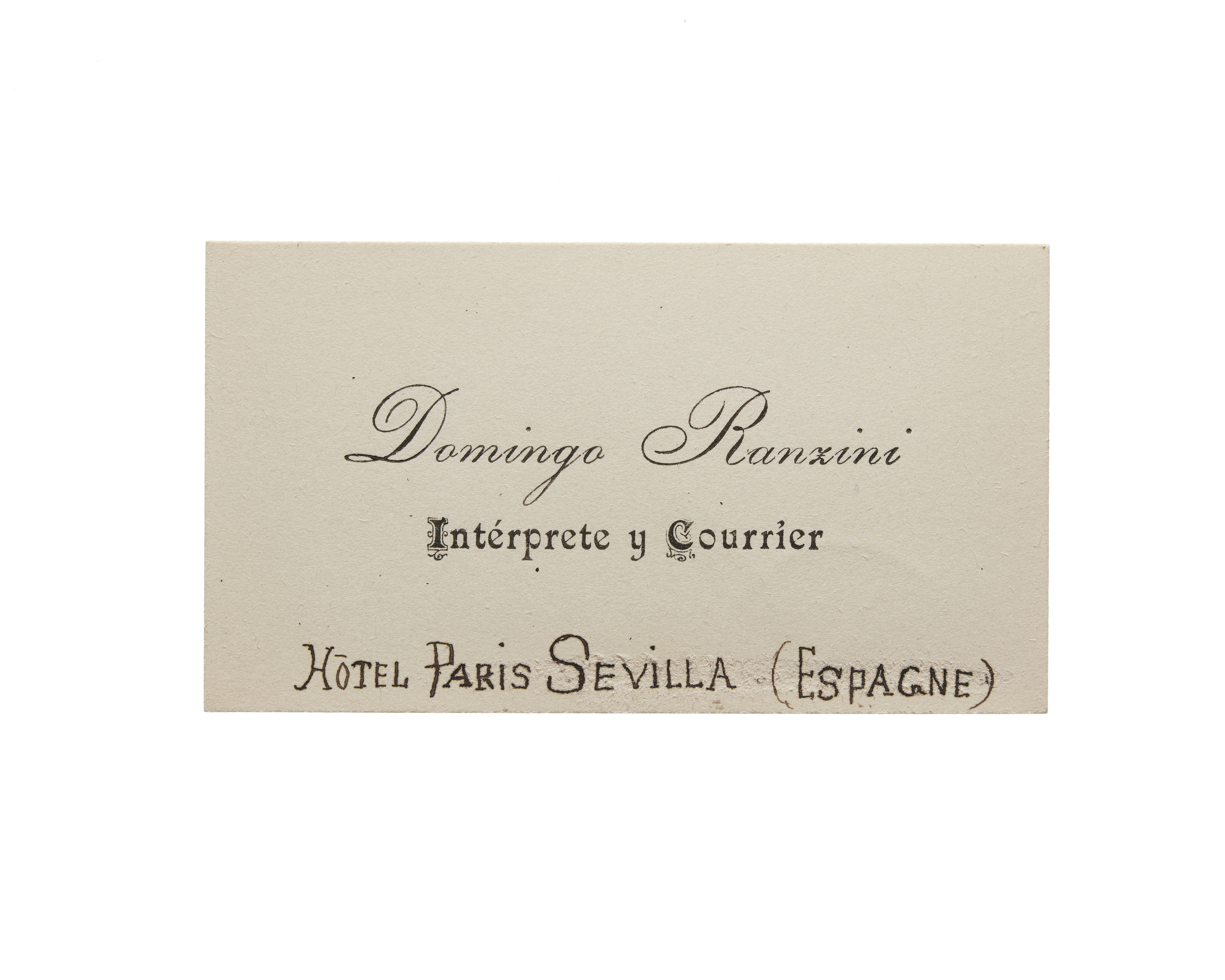 Två visitkort från Domingo Ranzini, Interperte & Courrier. Första kortet är utan datum. Adress (nedre högra hörnet) Sevilla, (nedre vänstra hörnet) Hotel Paris. Andra kortet är utan datum. Adress (handskrift) Hotel Paris Sevilla (Espagne)