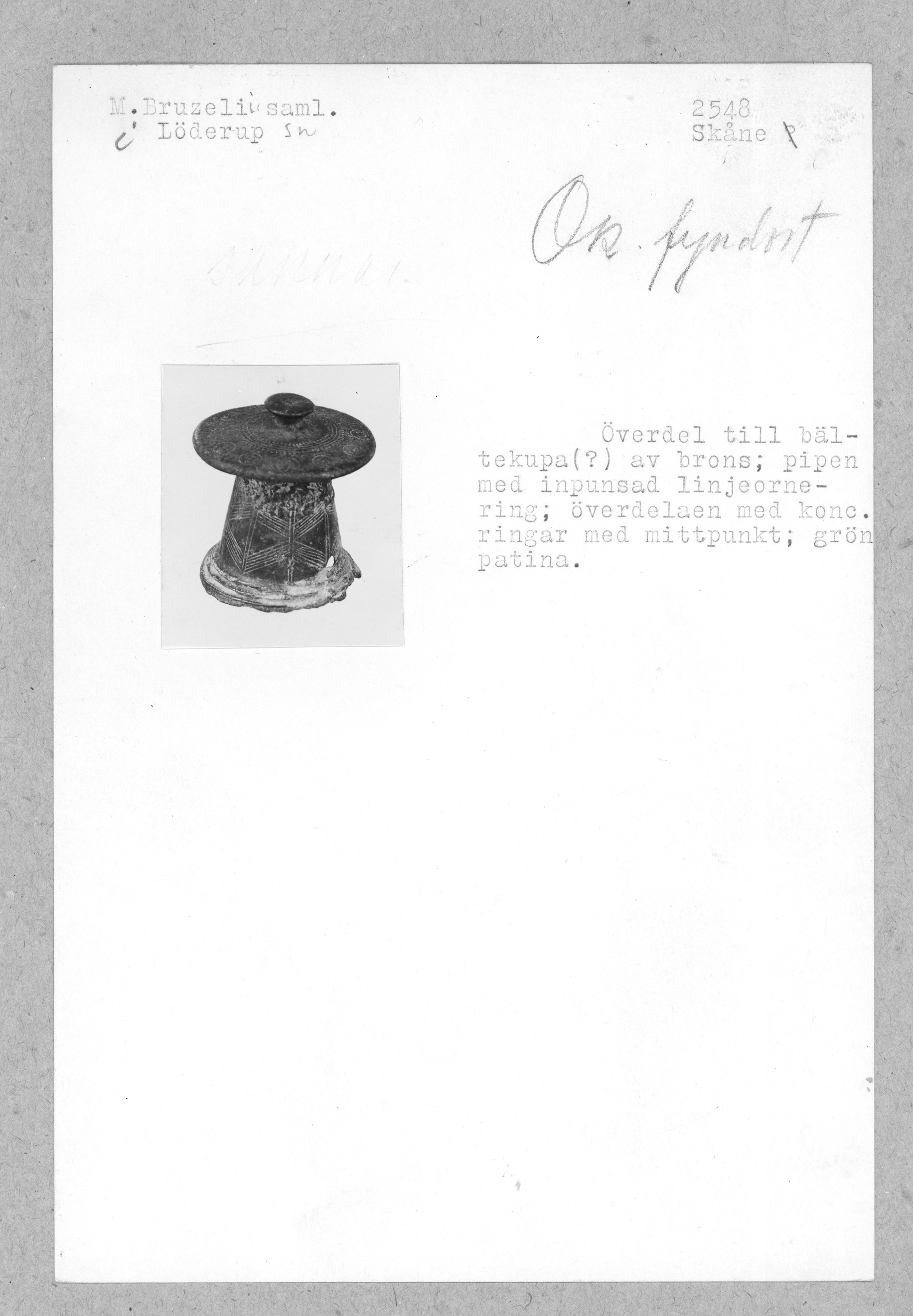 Överdel till bältekupa (?) av brons, pipen har inpunsad linjeornering, överdelen har koncentriska ringar med mittpunkt.