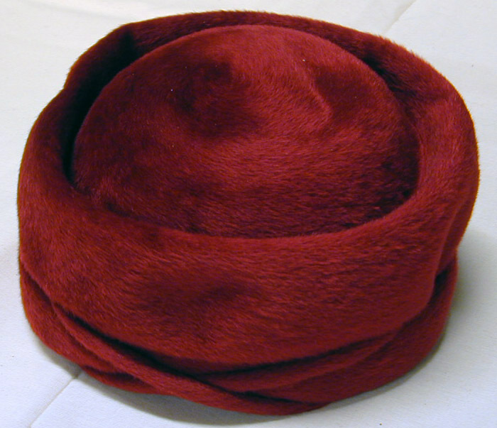Damhatt av vinröd angorafilt, toupé. Rund kulle utan brätte. Djup försänkning där hattens sida övergår till taket. Taket kraftigt välvt, nästan halvsfäriskt. Sidan är skarvad mitt på, så att en djup söm går runt hela hatten. Framtill två korslagda filtband, som går mellan den djupa sömmen och nederkanten av hatten. Hatten ofodrad. Längs innerkanten rött ripsband. På ripsbandet sitter baktill en etikett:"HKH PRINSESSAN // SIBYLLAS HOVLEVERANTÖR // RÖSTBERGS // STOCKHOLM". Tillverkad av Röstbergs, Stockholm. Datering: 1964-11-03.