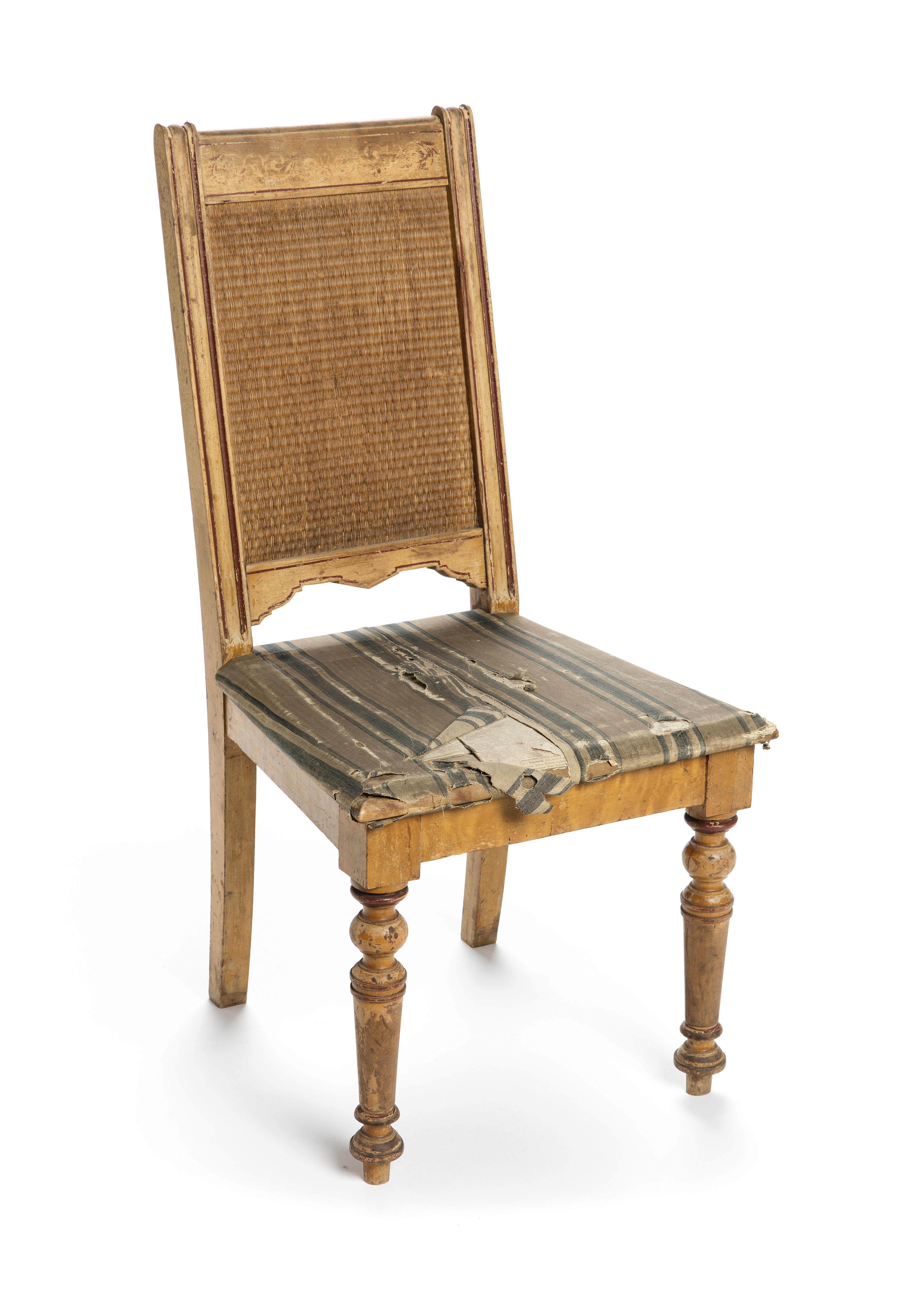 STOL Stol med rygg i rotting, sits klädd med lärfttyg. Under sitsen märkt Nr 59 b Stolen har använts i Hallwylska palatset av Wilhelmina von Hallwyls personal vid arbetet med katalogiseringen. Sitsens tyg tunnslitet.