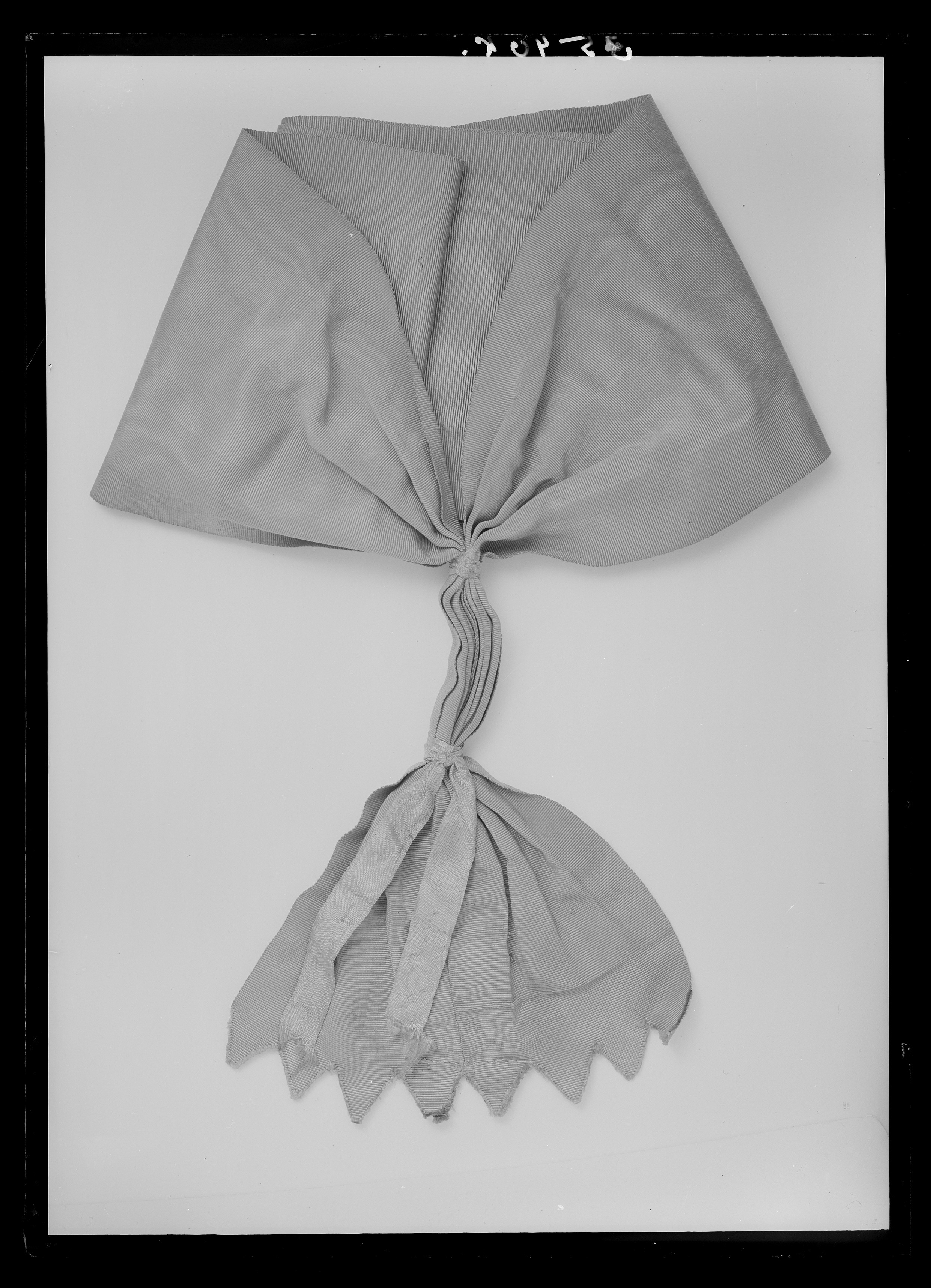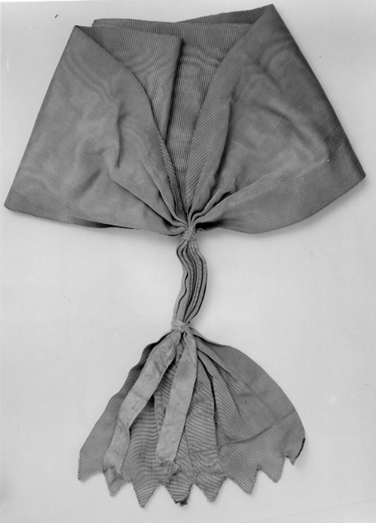 Axelband av ljusblå sidenmoaré, tandade bandändar, ihopsydda i ett stycke, ca 100 mm därovanför är banden veckade och ombundna med två sidenband med ca 45 mm mellanrum.