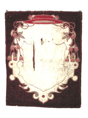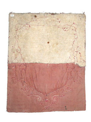 Stående rektangulärt platta av röd sammet. Därpå applicerat en symmetrisk rullverkskartusch av vitt siden med kanter och detaljer broderad med guldtråd, kantiljer och rött silke. Kartuschen krönt av en kardinalshatt med två tofsar på brättet samt sex nedhängande tofsar på vardera sidan. Den på kartuschen ursprungligen applicerade vapenskölden saknas. Märken efter en öppen (?) krona ovanför vapenskölden. Baksida av grovt oblekt linne (?) med synliga stygn av lintråd och rött silke, nedre hälften saknas.