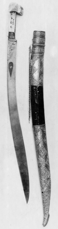 Balja klädd med svartlackerat läder med söm av mässingstråd med munbleck 214 mm och doppsko 392 mm av silver med ciselerad bladdekor i relief. Runt mynningen filigranarbete. På ryggsidan hållare med kedja av silver. Släpsko i form av ciselerat fiskhuvud.