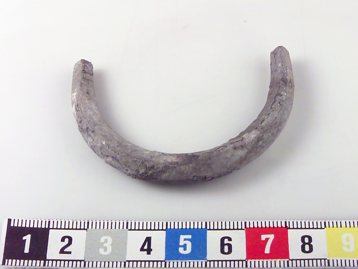 Ten med fyrsidigt tvärsnitt, avsmalnande mot ändarna. Böjd till U-form. Skadat ytskikt.