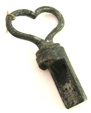 Av vitmetall, ej stål. Urprungligen cylindrisk och ihålig, i två halvor varav den ena nu avbruten och saknas. Hjärtformigt genombrutet grepp med i ena kanten bit av brunaktig tråd.