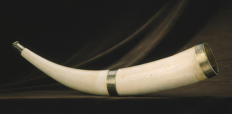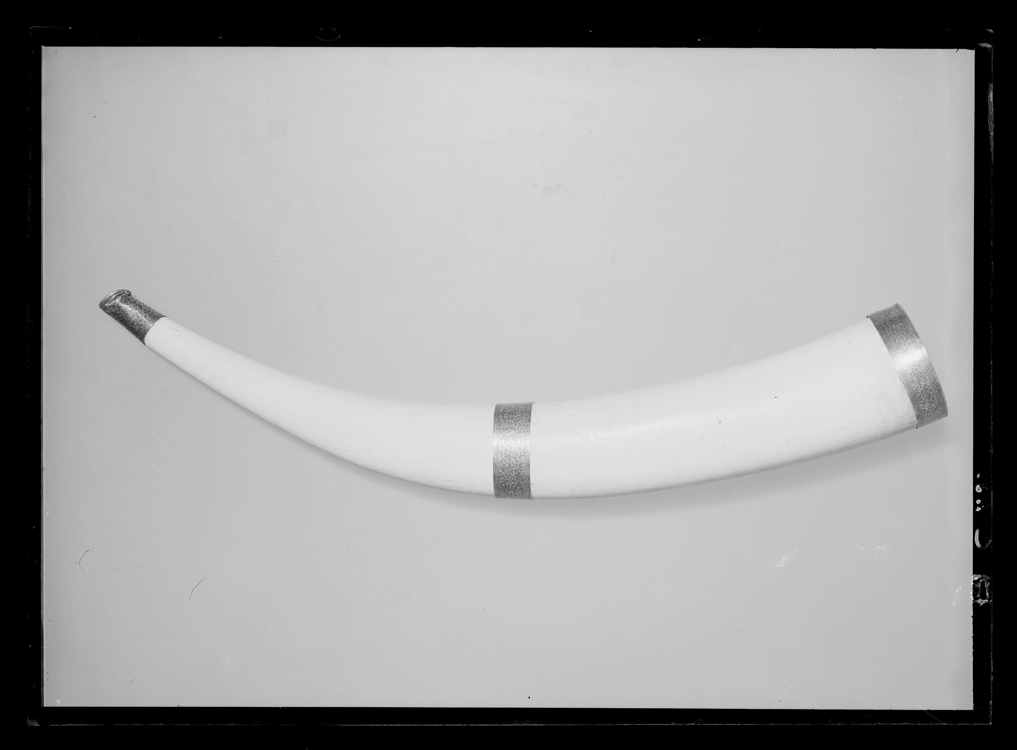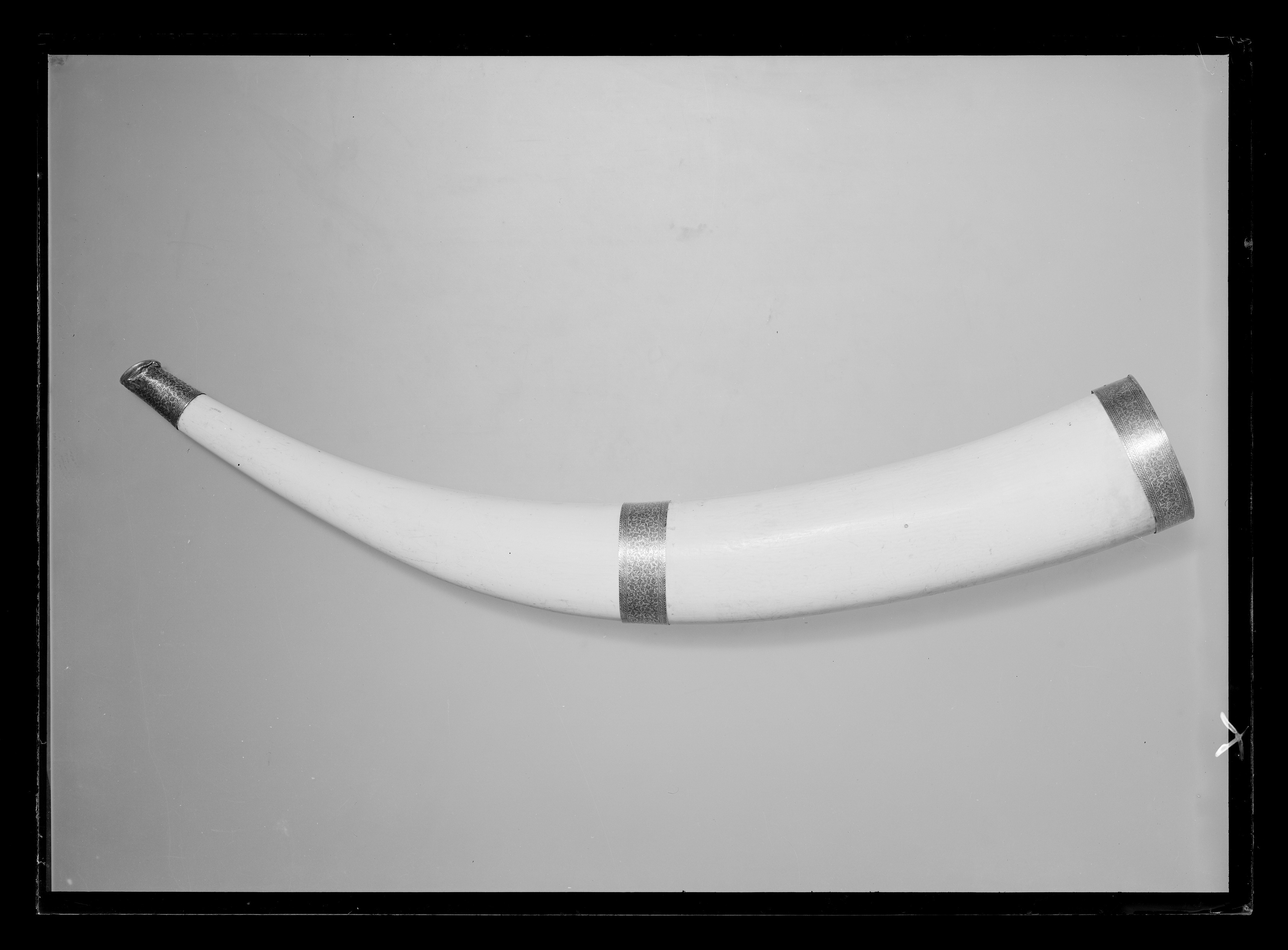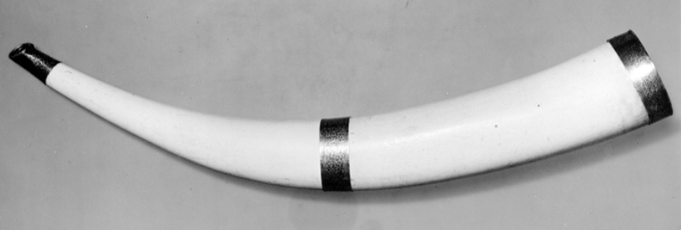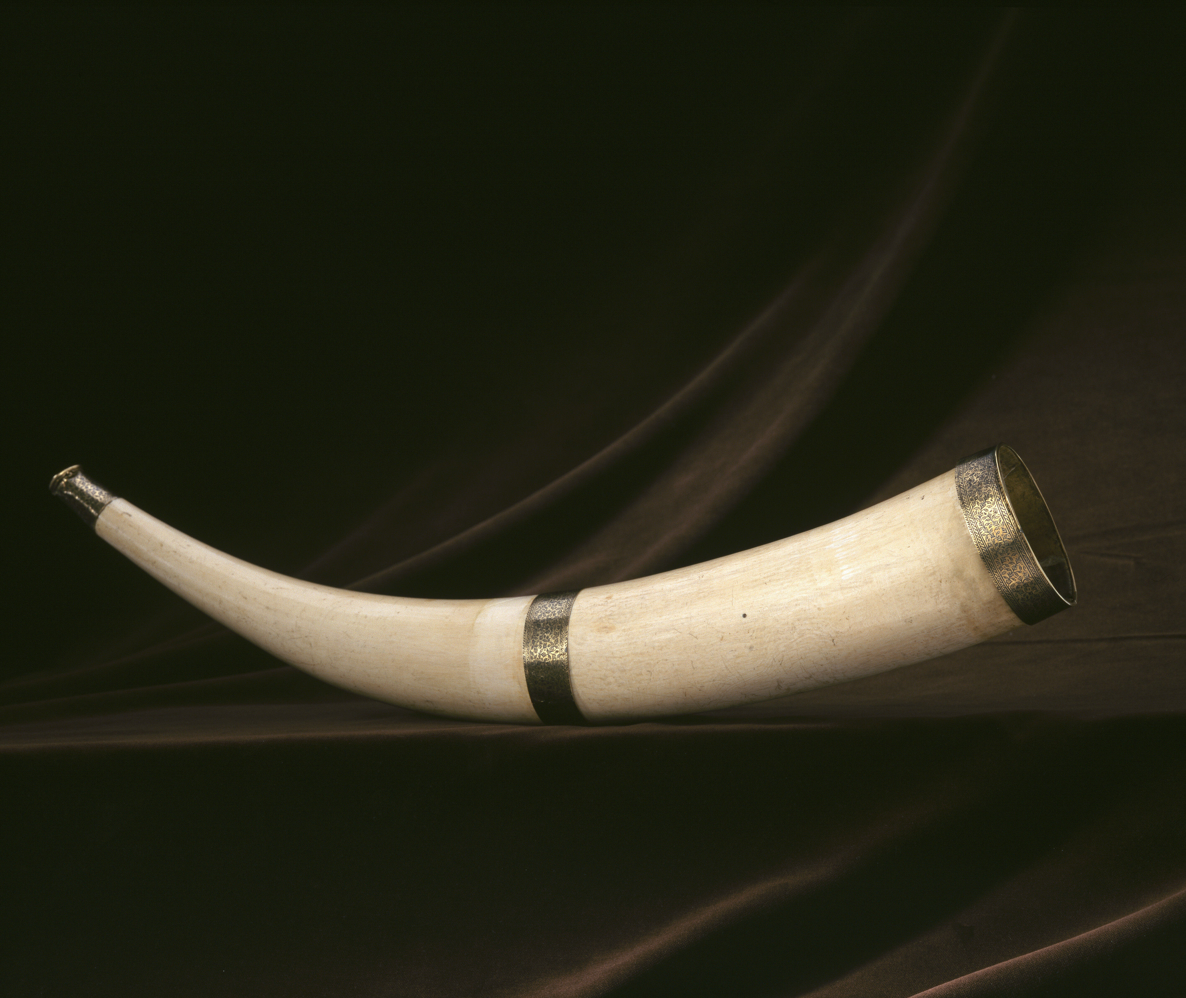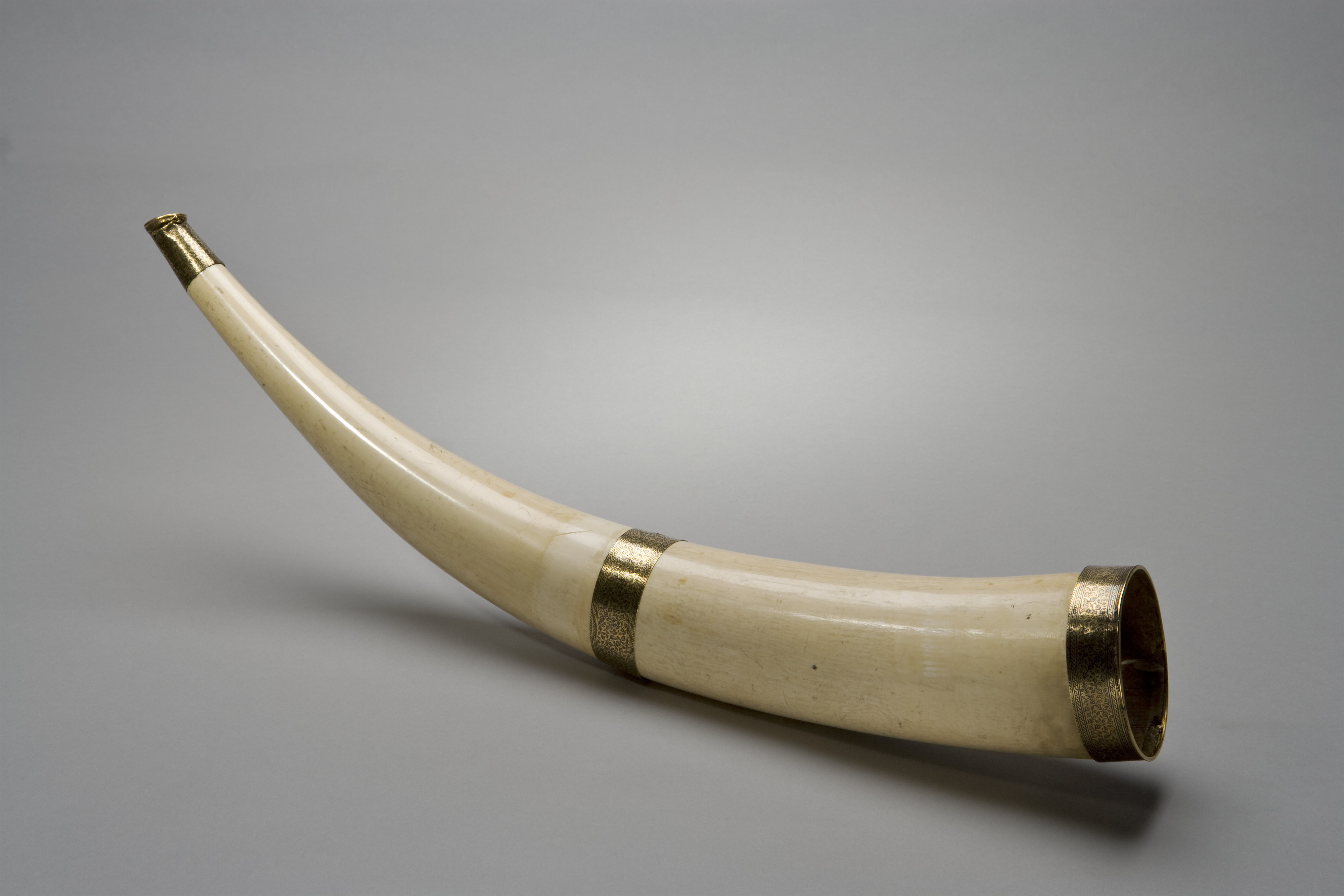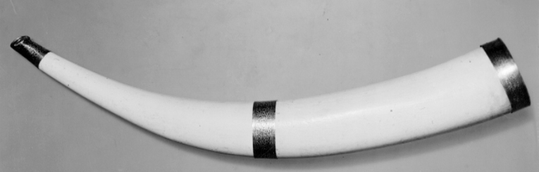 Jakthorn av en urholkad elefantbete med beslag av guld, munstycke med ändring, b: 44 mm, mynningsbeslag, b: 22 mm och mittbeslag, b: 25 mm, alla med yttäckande, graverad rankdekor, ifylld med svart färg.