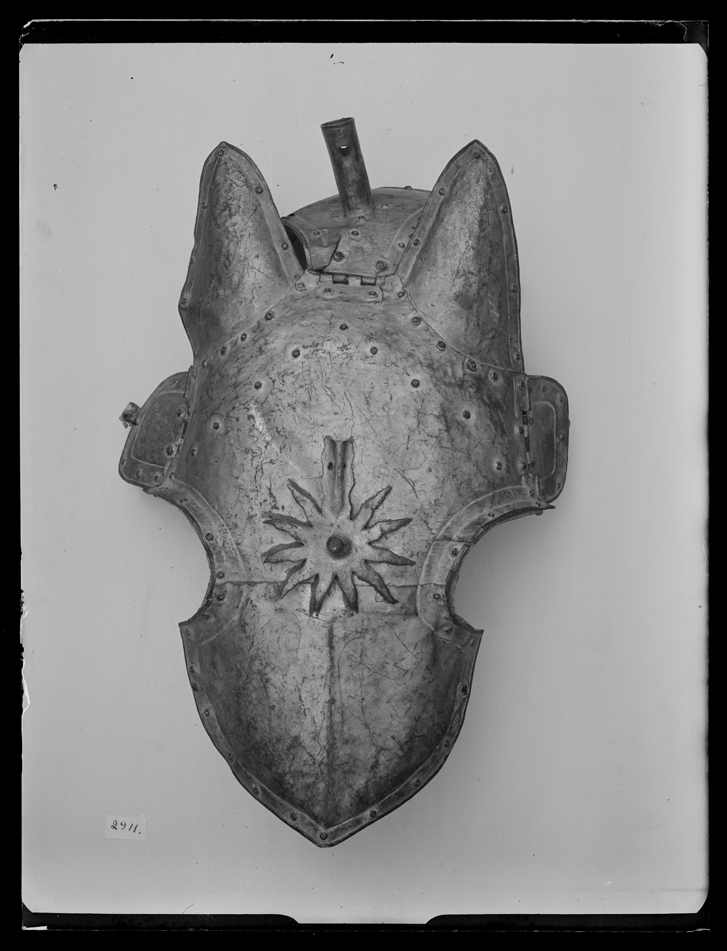 Häststjärna med nackskydd av sex delar, tillverkad av driven kopparplåt. Utsidan bemålad med guldfärg. Huvudplåt med urtag för öron och öron. I öronurtagen nitade spetsiga öronplåt. Mitt fram, en plymhållare i form av en sol med tio strålar, där den elfte spetsen utgör plymhållaren. Mitt i en kopparspets. Under plymhållaren, en svag ås ner mot underkanten, utdragen i en spets. På båda sidor kindplåtar fastnitade med gångjärn. Nackplåt nitad i huvudplåten med ett gångjärn. Mitt på nackplåten en stor cylinderformad plymhållare. Samtliga ytterkanter utåt omvikta, innanför denna en försänkt bård med nitrad. Nitarna håller på insidan remsan som det invändiga sämskskinnsfodret är sytt i. Ytan med bucklor och sprickor.