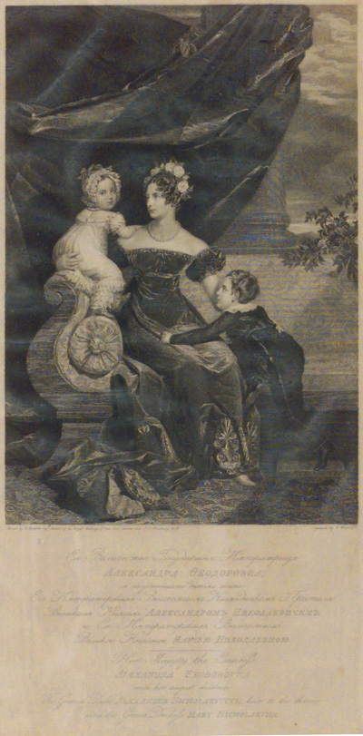 Alexandra : helfigur , sittande , fas vänster. Håller Maria på höger arm. Alexander böjd framåt mot Alexandras vänstra ben. Lång klänning , djupt ringad. Maria : vit , lång empireklänning. Alexander : långa , mörka byxor med kort jacka. Draperi i fonden. Inskrift på ryska och engelska. Signerad : "Painted by G. Dawe esg:r Member of the Royal Academy of fine Arts : London that of S:t Petersburg etc: etc: " , "Engraved by T. Wright ". ". . . . . . . .London Jan 1st 1826". Förgylld ram med sluten krona , 3348:3 , på kudde och pastellagelister. Ramlistens bredd 90 mm. På stödskivan skrivet "264" med vit krita , h ca 1 dm. "Gula förmagett" med blyerts , ca 1 cm h , "no 6". På ramen "No 2 " (ca 2 cm h) samt "13(?) Gula Rummet (?)" med blyerts.
