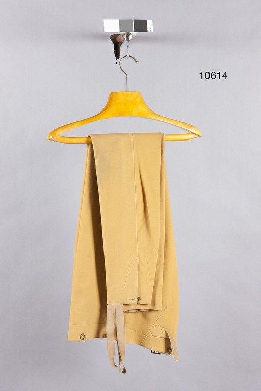 Långbyxor av ljust gulbrunt kläde/ylle. Gylf med knäpppning, fyra förgyllda och brunmålade knappar av gulmetall, firmamärke: "F. KAEDING STOCKHOLM", vid linningen hyska och hake av gulmetall, dessutom invändig knäppning med klädesslejf, två Kaedingknappar på gylfens framsida. På linningen sex Kaedingknappar. I mittsömmen bak sprund med triangulär klädesisättning, däröver hopfästning med slejfar av kläde, rektangulärt spänne av gulmetall, två klor, firmamärke K & S. I sidsömmen dessutom fickor, dekorationsstickning på framsidan, invändigt kantskoning av gult bomullstyg. Nertill i sidsömmen sprund, knäppning med liten Kaedingknapp. På benens utsida vid nederkanten fastsytt ögla av resårband, ändarna fästade intill varandra. Foder upptill samt på gylfens insida av vit satäng (?) med smala gråblå och lila ränder, placerade två och två i grenen vit satäng. Fickor av vit bomullskypert. Benen nertill samt slejfen bak fodrade med bråbrunt glättat tuskaftslinne.