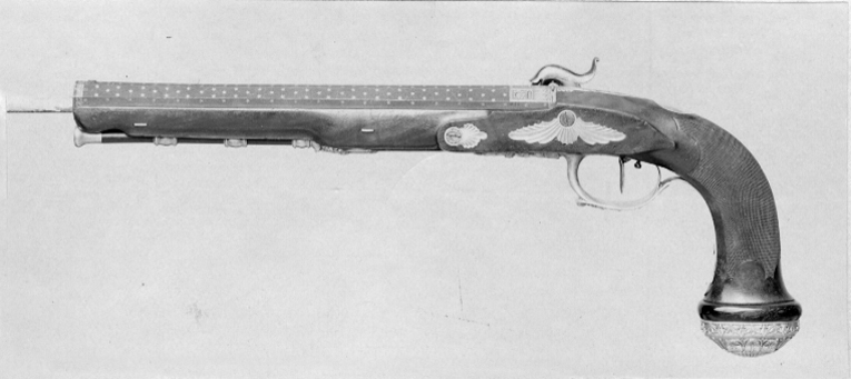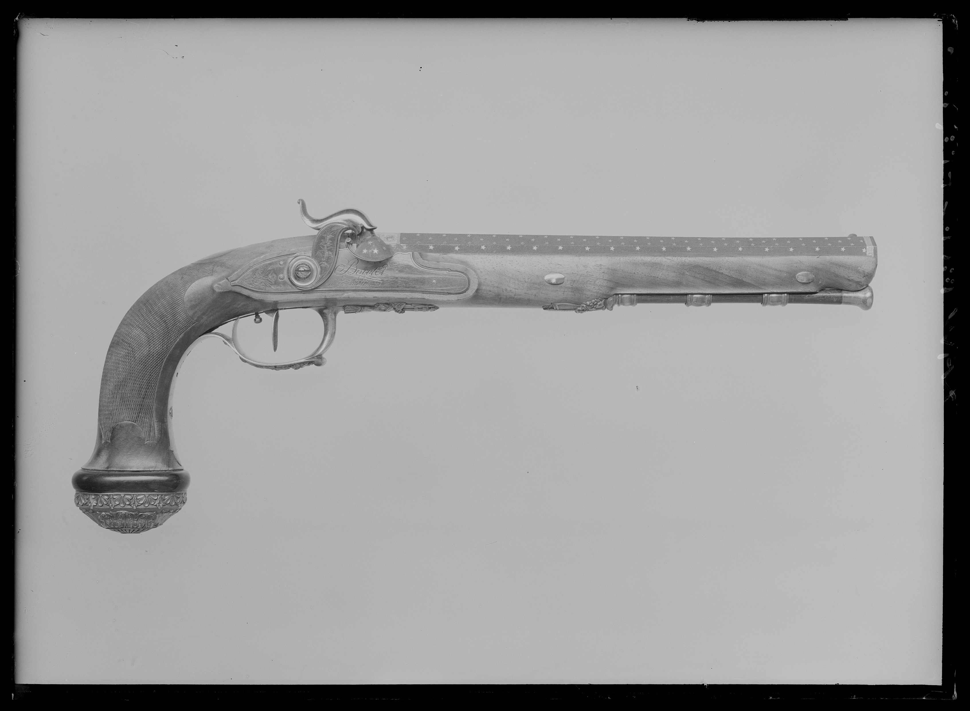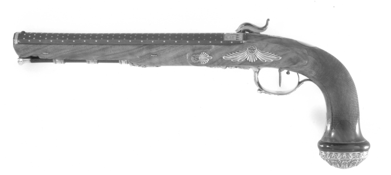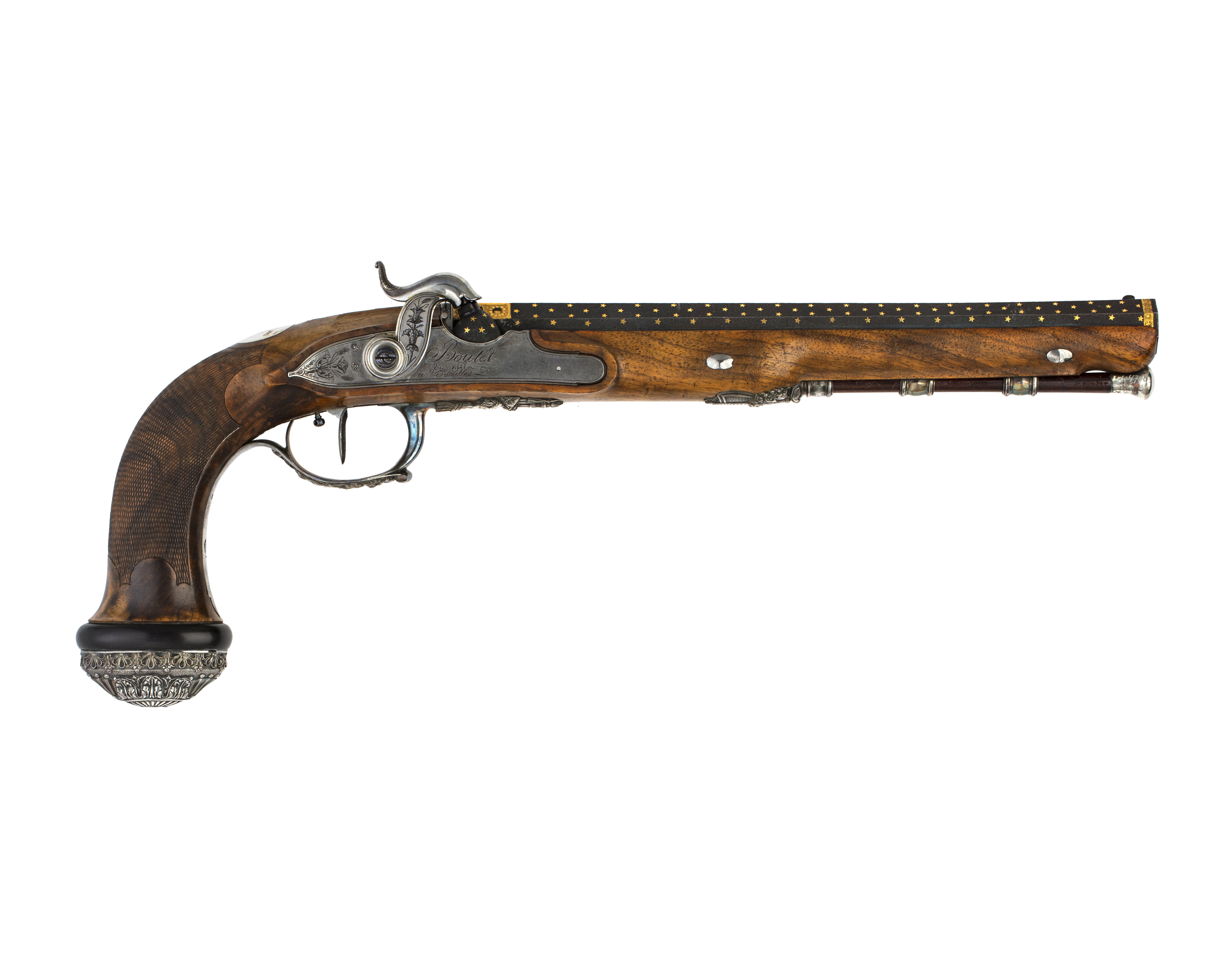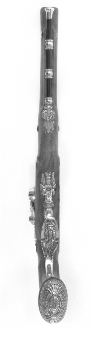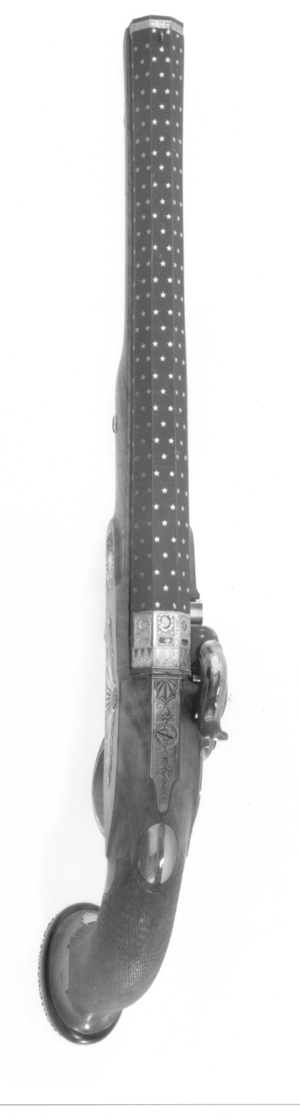 Blånerad, "åttsidig" pipa med finräfflat lopp, rundad undersida, mynningen åttsidig. Ovansidan liksom snäckan mattpunsad med dekor av strödda, femuddiga stjärnor av guld. På pipans ovansida vid pipbasen ett 22 mm brett guldband med punsad dekor, baktill spetsiga vinklar samt på varje fas en stämpel: "BOUTET" och därframför på sidofaserna åttsidiga stämplar, namnchiffer NB, på mittfasen en oval stämpel: franska kejsarörnen (Stöckelnr 1440). Vid mynningen band med punsade ringar och femuddiga stjärnor. Blånerad tändhattsnippel. På pipans undersida stämplat: "Manu // V lles", åttsidiga Boutet-stämpeln, oval stämpel: krönt F R och två korslagda lagerkvistar samt på pipa och snäcka: 2. Riktmedel: Stolpkorn av silver. På baskylen ett sikte i form av två tunna skivor med rundad översida. Fästning: Pipan fäst med en blank baskylhake samt två engelska pipstift av stål. Blank baskyl, stämplad på undersidan: 3. Graverad dekor, på framkanten sicksackbård, på bladet bladrankor, runt skruvhålet en pärlstav. En fästskruv samt stift i nederkanten. Flintlås ändrat till slaglås, blankt stål. Plant låsbleck med fasade kanter, graverade kantlinjer samt på bakdelen bladranka med två sädesax, framför hanen graverad signatur: "Boutet // et Fils // a Versailles". S-formig hane med fasade kanter, runt hanskruven en skålad ring, graverad dekor, på hanskruven två blad, bladranka med sädesax i spetsen på halsen. Slaghuvud med mungipor, nätskuret tumgrepp, volut på änden. Nöt med inre springkil, länk nöt-slagfjäder. Ovanför slagfjädern stämplat: 2. Fästning: En låsskruv med plant huvud, graverade blad. På framsidan littrad avtryckare med ställskruv. Avtryckarbleck av stål med spetsig bakre ände, graverad kantbård av trekanter. Helstock av valnöt med kolvände parallell med pipan, nätskuren kolvhals, på kolvänden en välvd ring av ebenholts, i pipnoten stämplat: 2 och en stjärna samt ristat ett X. Beslag av silver, stämplade på insidan: 3. Kraftigt välvd kolvkappa med blad-, blom- och simhudsformer, rombisk stämpel med en pistol och N B (Nicolas Noel Boutet), på insidan en mässingsten, fäst med skruv från varbygelns urtag. På kolvryggen en slät, oval tumplåt. Låsskruvbricka med skålad bladdekor, falsk låsskruv med liten bricka med liknande dekor. En + två fasetterade, korta rörkor, spetsrörkans spets i form av ett svärd i balja, blomsterkrans och sköld, vid svärdets fäste nosparti av djur med "mustascher". Rörkorna fästade i pipnoten med skruvar, på främre rörkornas skruvar samt i träet vid skruvarna inslaget 1-3 punkter.Varbygel med dekor i hög relief, främre arm i form av trofégrupp med harnesk, fanor, fackla, vingar och lagerkrans, på bygeln lejonhud och klubba. Slät bakre arm med stämplar: romb med pistol och NB (Boutet), åttkant med tupp och 1 (fransk silverstämpelsbenämning: "poincon de titre, departements", .950), oval med huvud och 88 (fransk silverstämpelsbenämning:"tête de vieillard, grosse garantie", byrånr 88). Tillbehör: Laddstock av rödbrunt trä, l: 263 mm, i framänden skoning i form av silverrör, l: 15 mm, i bakänden mässingskoning med gängad ände, l: 18 mm.