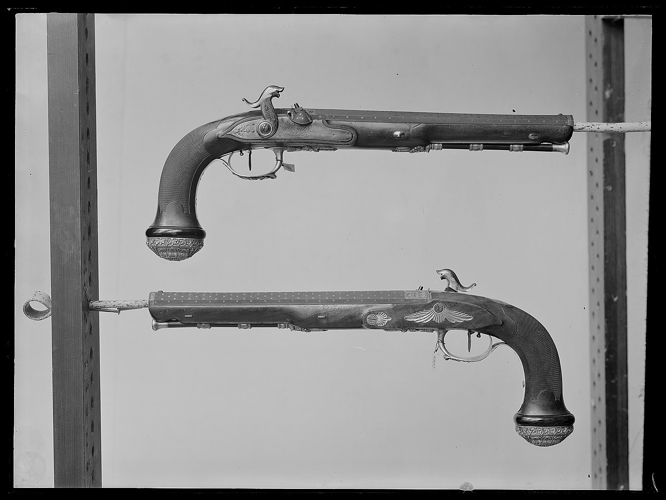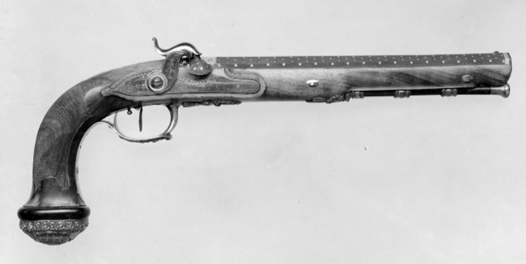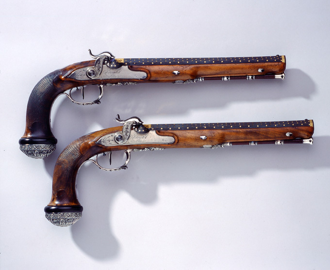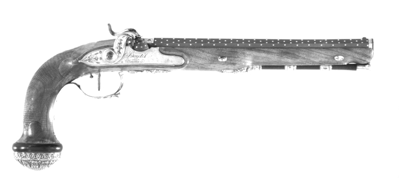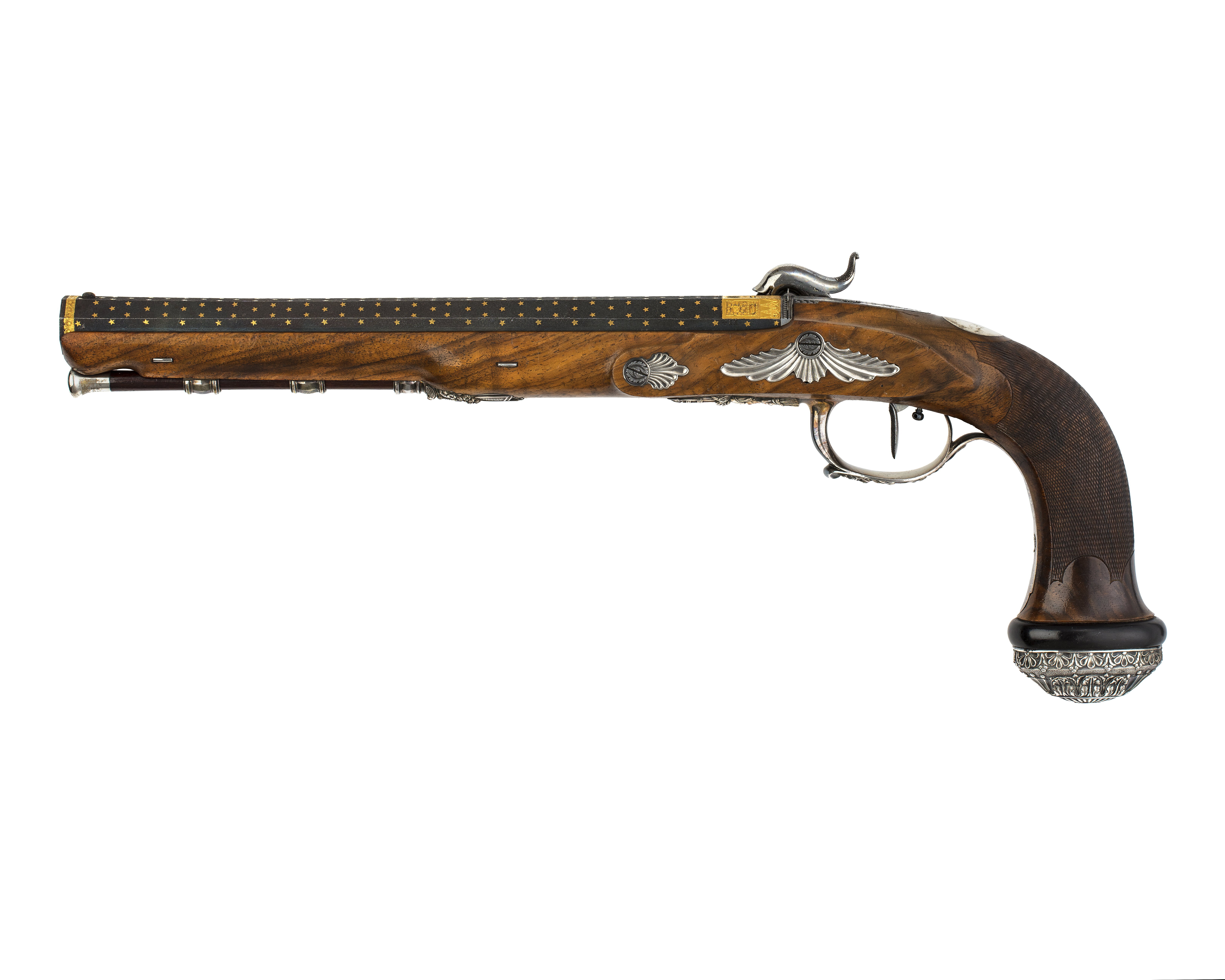Blånerad, "åttsidig" pipa med finräfflat lopp, rundad undersida, mynningen åttsidig. Ovansidan liksom snäckan mattpunsad med dekor av strödda, femuddiga stjärnor av guld. På pipans ovansida vid pipbasen ett 22 mm brett guldband med punsad dekor, baktill spetsiga vinklar samt på varje fas en stämpel: "BOUTET" och därframför på sidofaserna åttsidiga stämplar, namnchiffer NB, på mittfasen en oval stämpel: franska kejsarörnen (Stöckelnr 1440). Vid mynningen band med punsade ringar och femuddiga stjärnor. Blånerad tändhattsnippel. På pipans undersida stämplat: "Manu // V lles", åttsidiga Boutet-stämpeln, oval stämpel: krönt F R och två korslagda lagerkvistar samt på pipa och snäcka: 2. Riktmedel: Stolpkorn av silver. På baskylen ett sikte i form av två tunna skivor med rundad översida. Fästning: Pipan fäst med en blank baskylhake samt två engelska pipstift av stål. Blank baskyl, stämplad på undersidan: 3. Graverad dekor, på framkanten sicksackbård, på bladet bladrankor, runt skruvhålet en pärlstav. En fästskruv samt stift i nederkanten. Flintlås ändrat till slaglås, blankt stål. Plant låsbleck med fasade kanter, graverade kantlinjer samt på bakdelen bladranka med två sädesax, framför hanen graverad signatur: "Boutet // et Fils // a Versailles". S-formig hane med fasade kanter, runt hanskruven en skålad ring, graverad dekor, på hanskruven två blad, bladranka med sädesax i spetsen på halsen. Slaghuvud med mungipor, nätskuret tumgrepp, volut på änden. Nöt med inre springkil, länk nöt-slagfjäder. Ovanför slagfjädern stämplat: 2. Fästning: En låsskruv med plant huvud, graverade blad. På framsidan littrad avtryckare med ställskruv. Avtryckarbleck av stål med spetsig bakre ände, graverad kantbård av trekanter. Helstock av valnöt med kolvände parallell med pipan, nätskuren kolvhals, på kolvänden en välvd ring av ebenholts, i pipnoten stämplat: 2 och en stjärna samt ristat ett X. Beslag av silver, stämplade på insidan: 3. Kraftigt välvd kolvkappa med blad-, blom- och simhudsformer, rombisk stämpel med en pistol och N B (Nicolas Noel Boutet), på insidan en mässingsten, fäst med skruv från varbygelns urtag. På kolvryggen en slät, oval tumplåt. Låsskruvbricka med skålad bladdekor, falsk låsskruv med liten bricka med liknande dekor. En + två fasetterade, korta rörkor, spetsrörkans spets i form av ett svärd i balja, blomsterkrans och sköld, vid svärdets fäste nosparti av djur med "mustascher". Rörkorna fästade i pipnoten med skruvar, på främre rörkornas skruvar samt i träet vid skruvarna inslaget 1-3 punkter.Varbygel med dekor i hög relief, främre arm i form av trofégrupp med harnesk, fanor, fackla, vingar och lagerkrans, på bygeln lejonhud och klubba. Slät bakre arm med stämplar: romb med pistol och NB (Boutet), åttkant med tupp och 1 (fransk silverstämpelsbenämning: "poincon de titre, departements", .950), oval med huvud och 88 (fransk silverstämpelsbenämning:"tête de vieillard, grosse garantie", byrånr 88). Tillbehör: Laddstock av rödbrunt trä, l: 263 mm, i framänden skoning i form av silverrör, l: 15 mm, i bakänden mässingskoning med gängad ände, l: 18 mm.